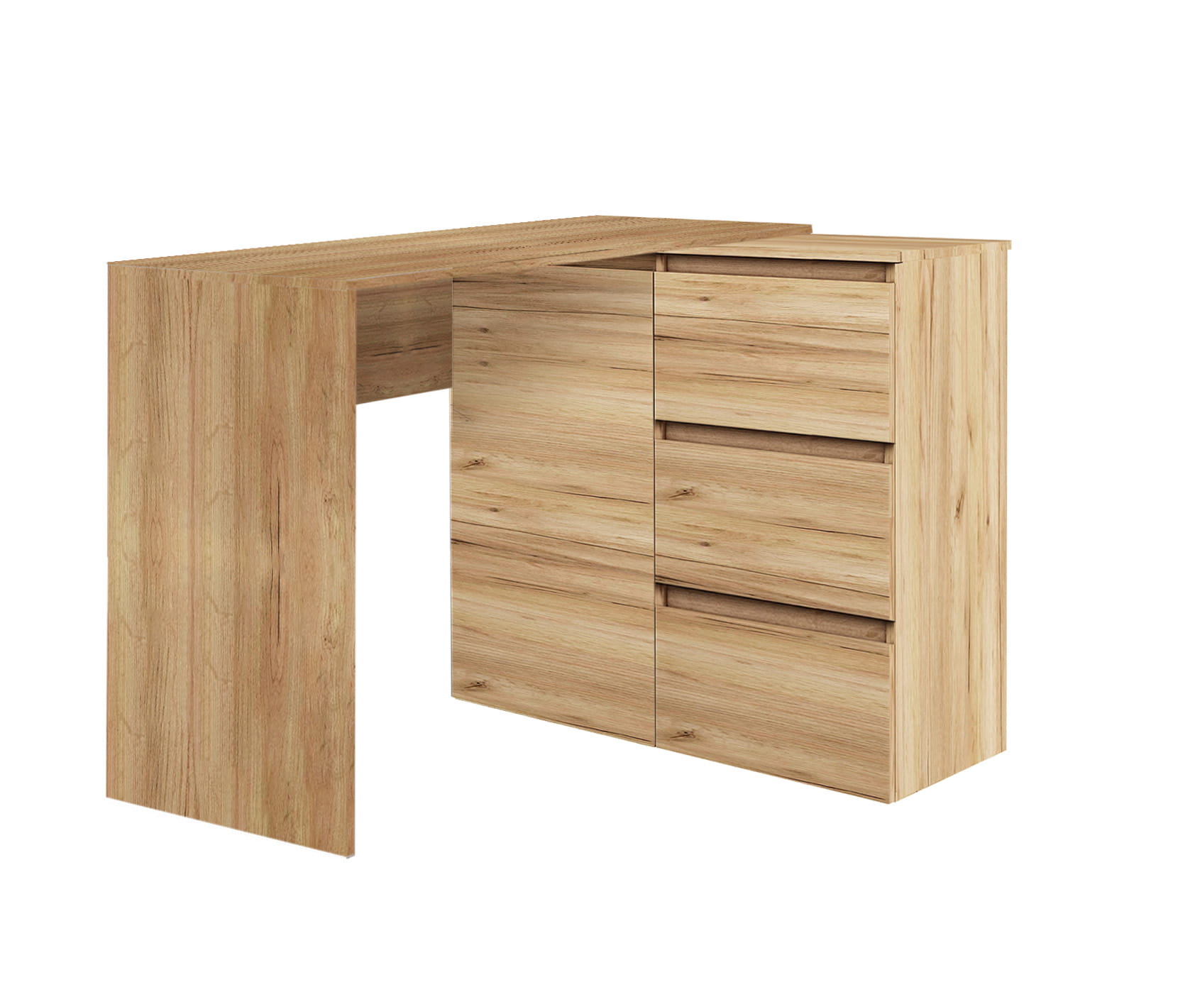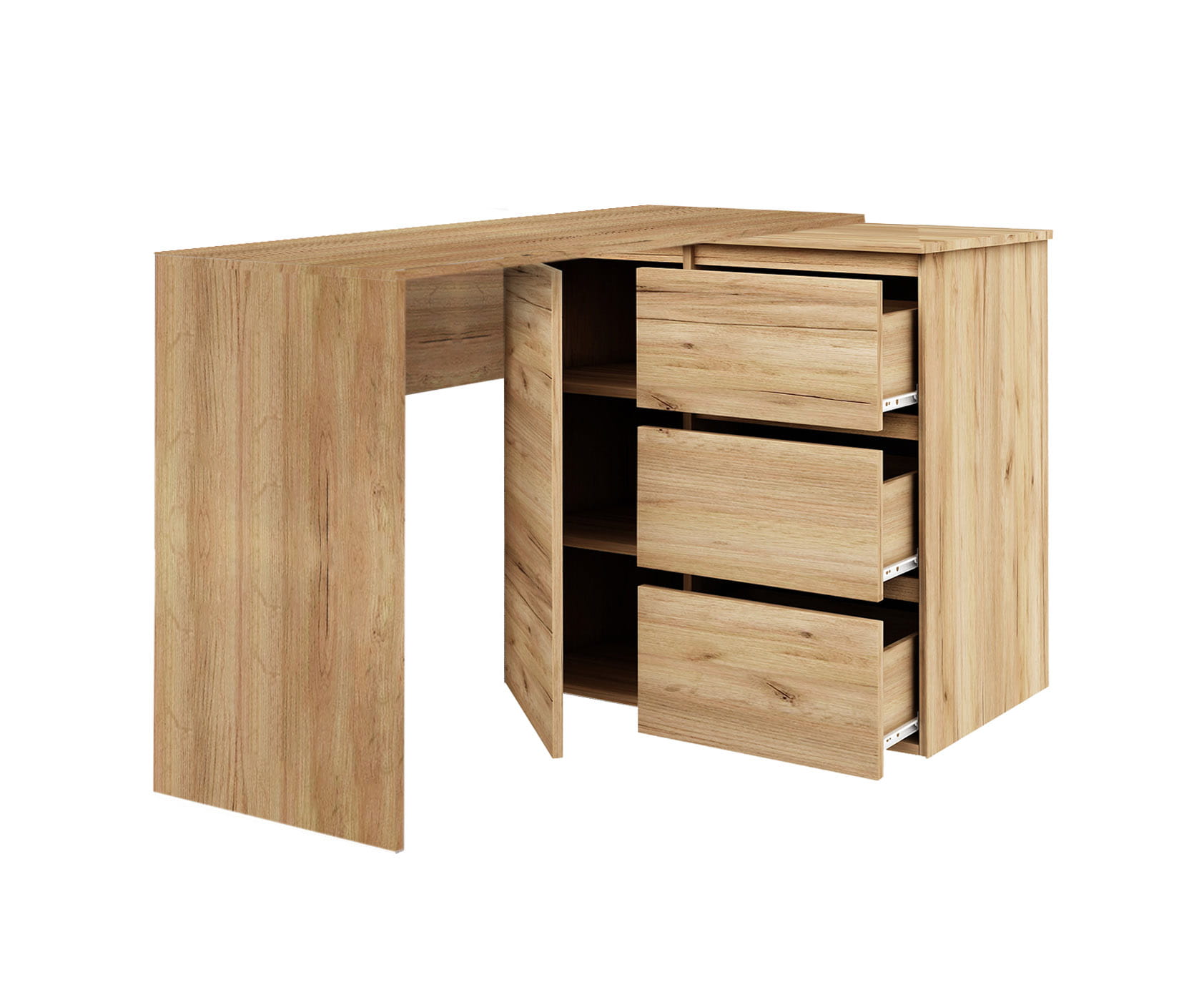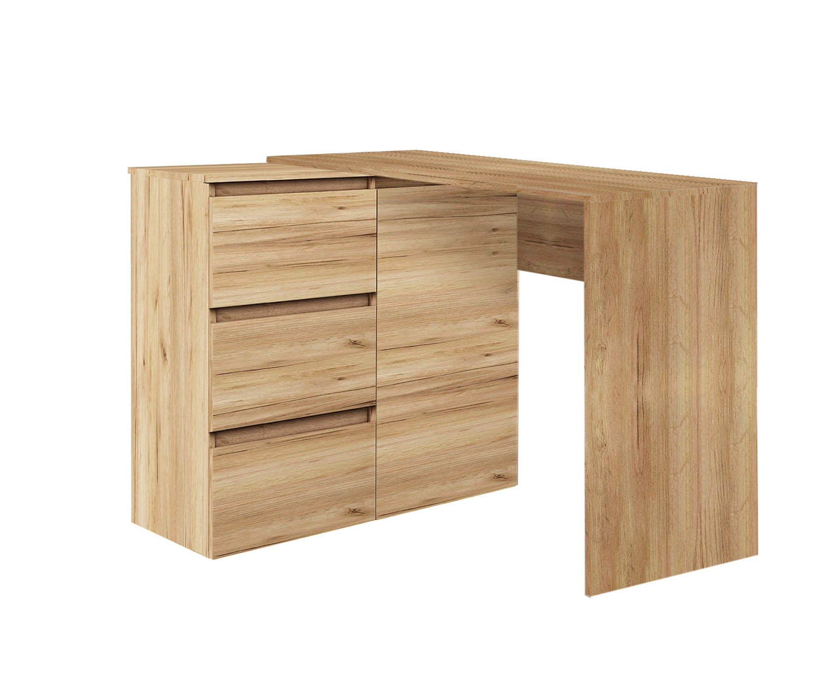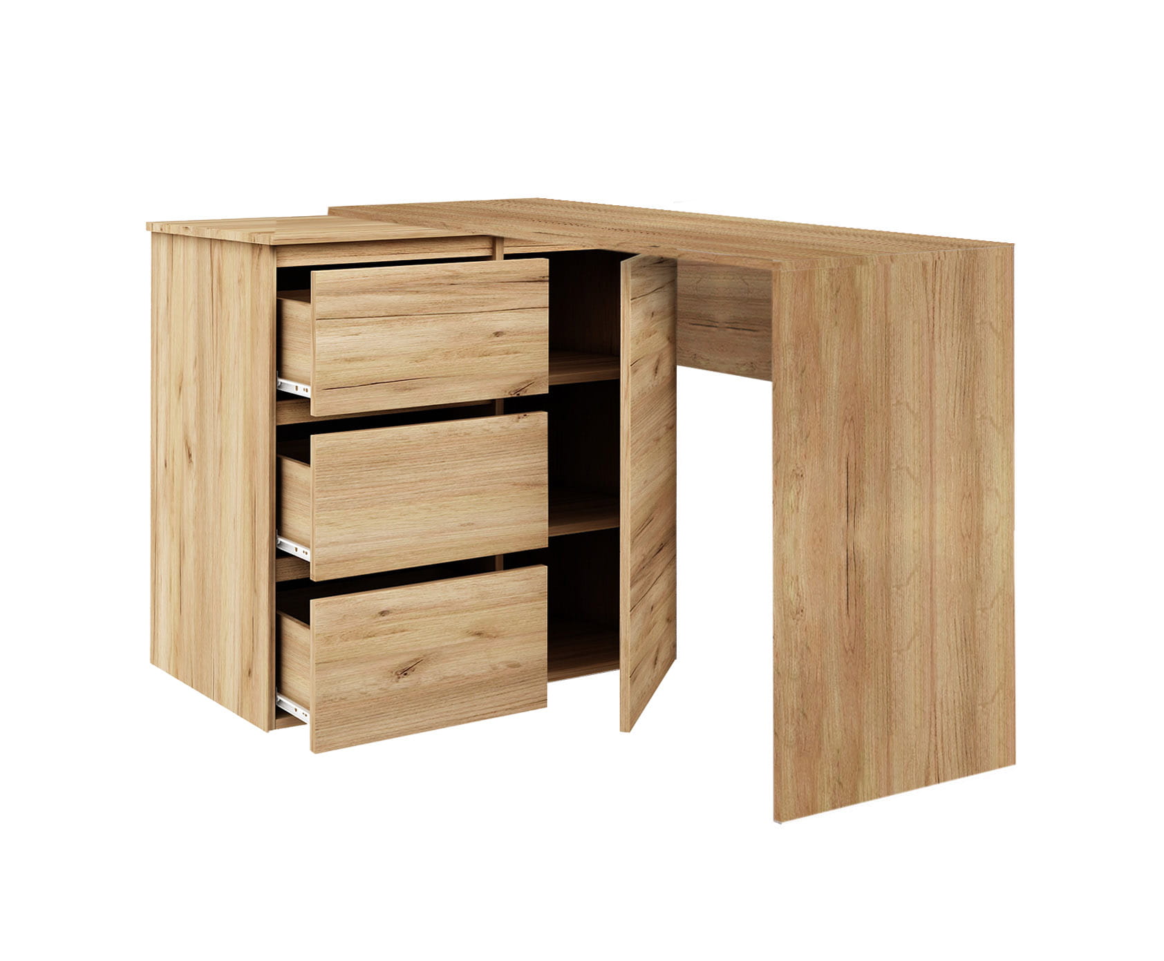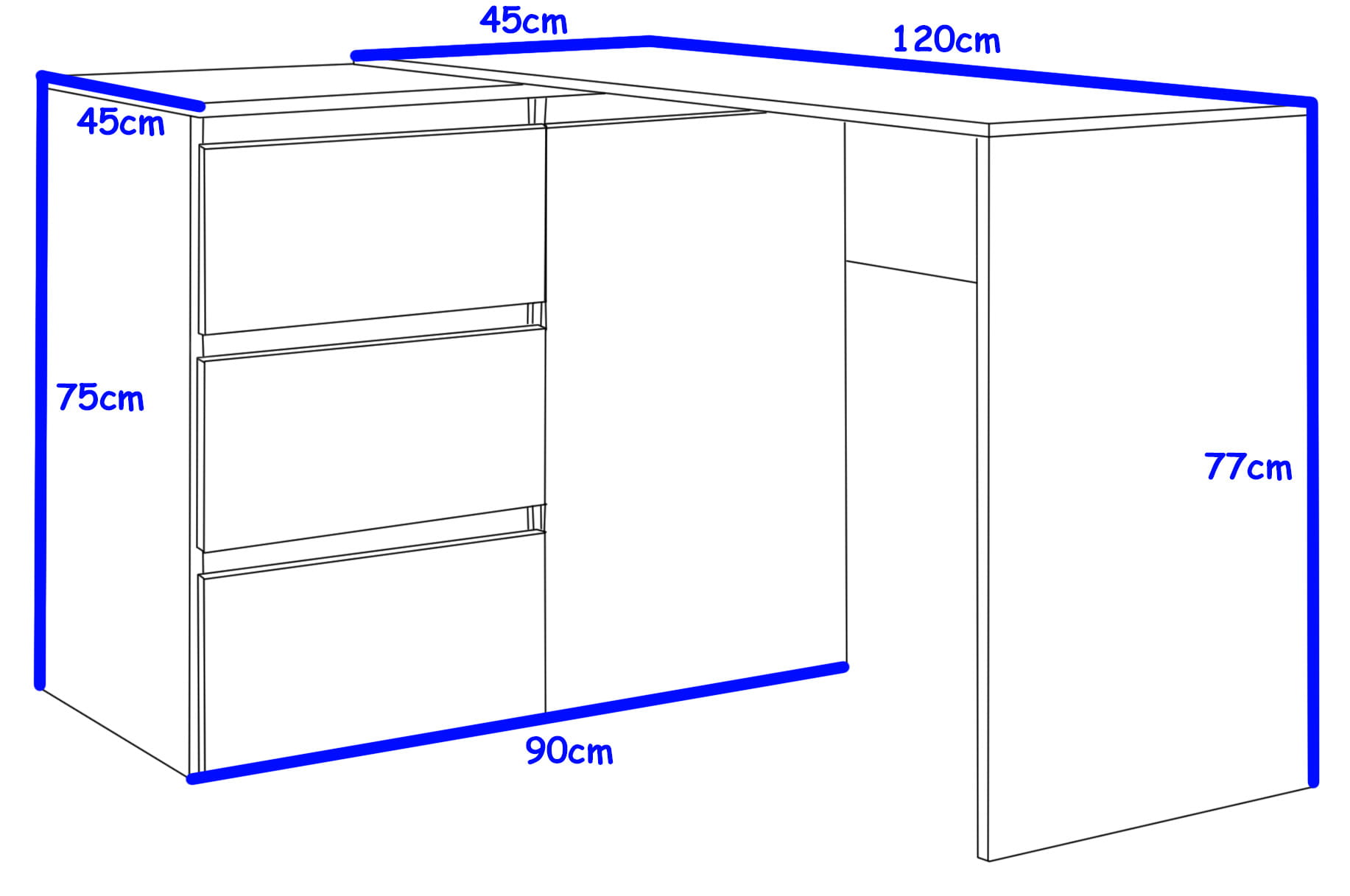 Biurko narożne Megan N2 jest niezwykle funkcjonale i pojemne, zapewnia dużo miejsca do przechowywania i wygodę w użytkowaniu. Biurko składa się z dwóch modułów: komody i biurka, które możesz zmontować na kilka sposobów - dzięki temu z łatwością dopasujesz je do własnych, indywidualnych potrzeb. Biurko wysyłamy w opcji zabudowanej komody: rząd szuflad i drzwiczki. Rząd z szufladami można zamontować w wybranym miejscu, a jeśli potrzebujesz otwartego miejsca na sprzęt komputerowy, nie musisz montować drzwiczek czy półki wewnętrznej. Biurko Megan N3 doskonale sprawdzi się w każdym biurze i pokoju ucznia. W systemie mebli Megan znajdują się również biurka proste oraz komody - można zatem rozbudować biuro czy pokój o kolejne elementy.