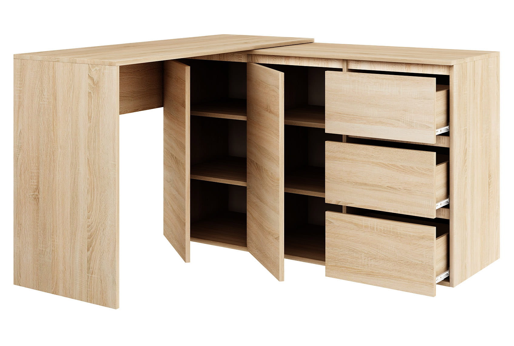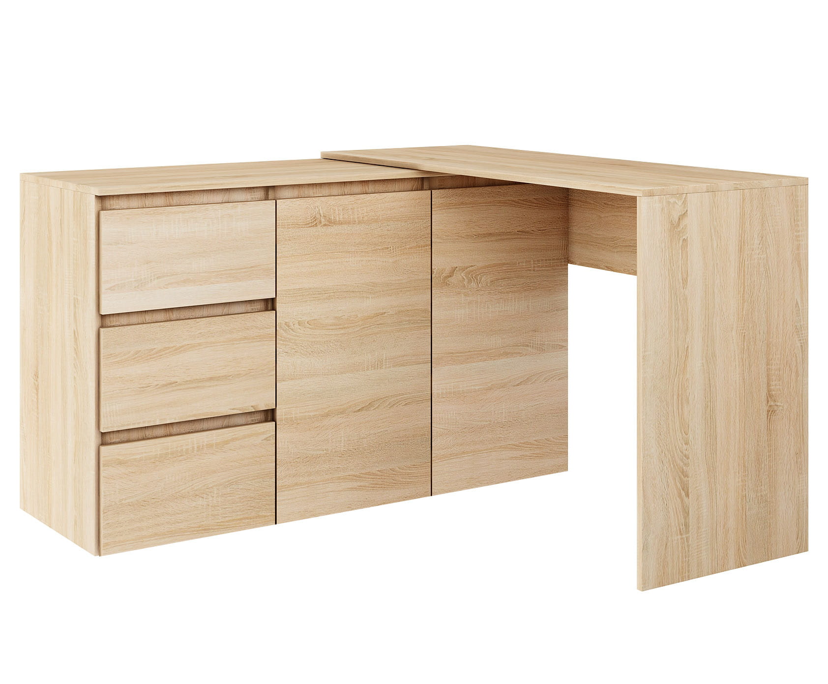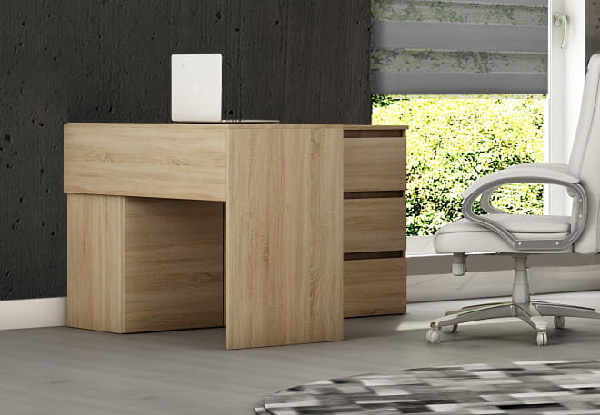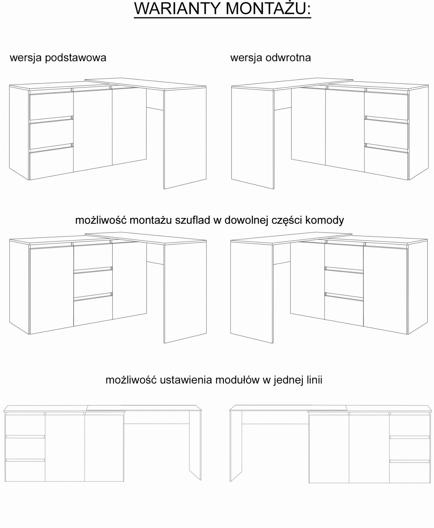 Biurko narożne Megan N3 jest niezwykle funkcjonale i pojemne, zapewnia dużo miejsca do przechowywania i wygodę w użytkowaniu. Biurko składa się z dwóch modułów: komody i biurka, które możesz zmontować na kilka sposobów - dzięki temu z łatwością dopasujesz je do własnych, indywidualnych potrzeb. Biurko wysyłamy w opcji zabudowanej komody: rząd szuflad i dwa rzędy z drzwiczkami. Rząd z szufladami można zamontować w wybranym miejscu, a jeśli potrzebujesz otwartego miejsca na sprzęt komputerowy, nie musisz montować drzwiczek czy półki wewnętrznej. Biurko Megan N3 doskonale sprawdzi się w każdym biurze i pokoju ucznia. W systemie mebli Megan znajdują się również biurka proste oraz komody - można zatem rozbudować biuro czy pokój o kolejne elementy.
