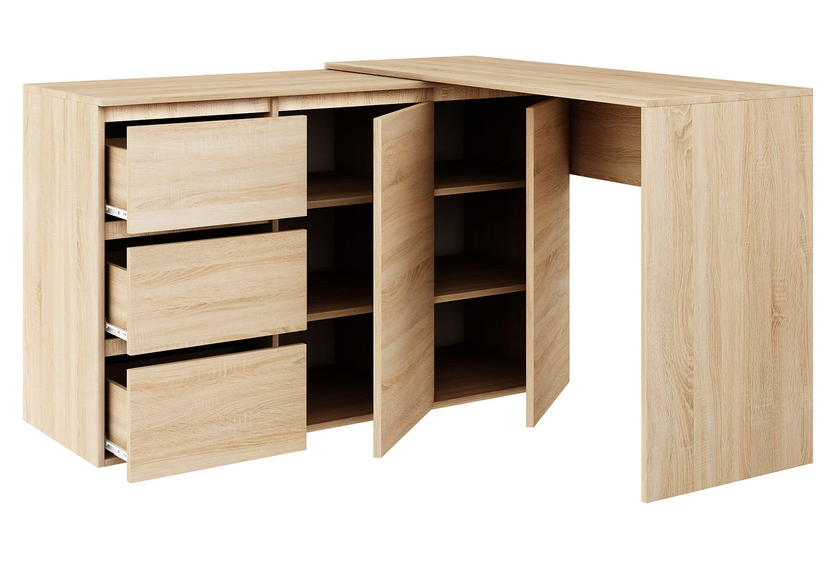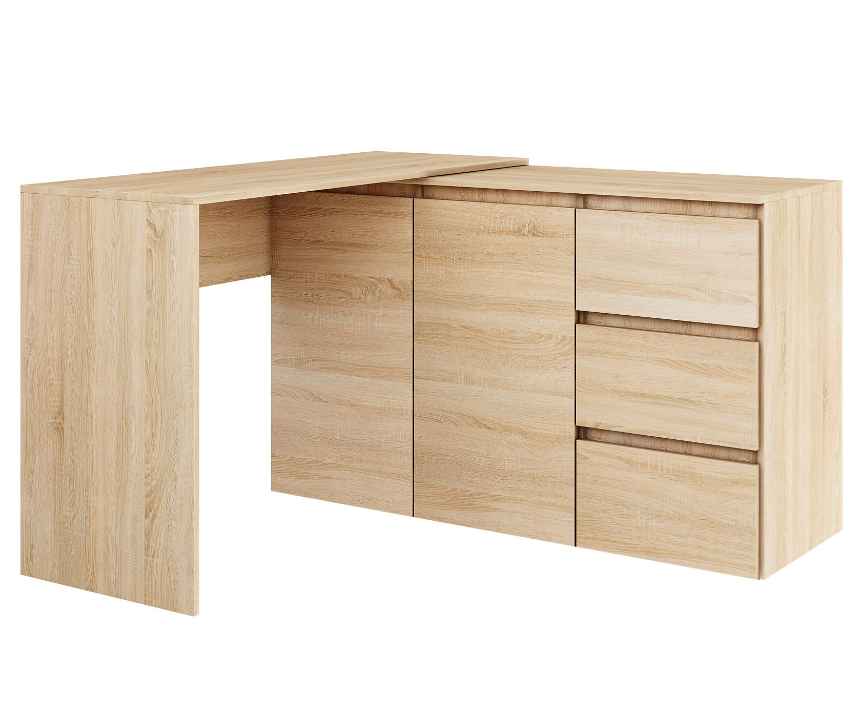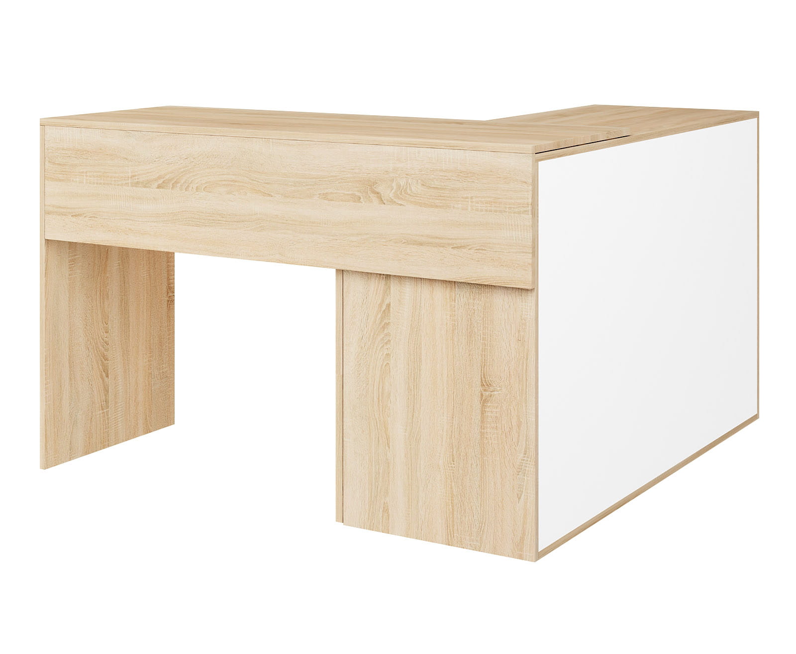 Biurko narożne Megan N3 jest niezwykle funkcjonale i pojemne, zapewnia dużo miejsca do przechowywania i wygodę w użytkowaniu. Biurko składa się z dwóch modułów: komody i biurka, które możesz zmontować na kilka sposobów - dzięki temu z łatwością dopasujesz je do własnych, indywidualnych potrzeb. Biurko wysyłamy w opcji zabudowanej komody: rząd szuflad i dwa rzędy z drzwiczkami. Rząd z szufladami można zamontować w wybranym miejscu, a jeśli potrzebujesz otwartego miejsca na sprzęt komputerowy, nie musisz montować drzwiczek czy półki wewnętrznej. Biurko Megan N3 doskonale sprawdzi się w każdym biurze i pokoju ucznia. W systemie mebli Megan znajdują się również biurka proste oraz komody - można zatem rozbudować biuro czy pokój o kolejne elementy.