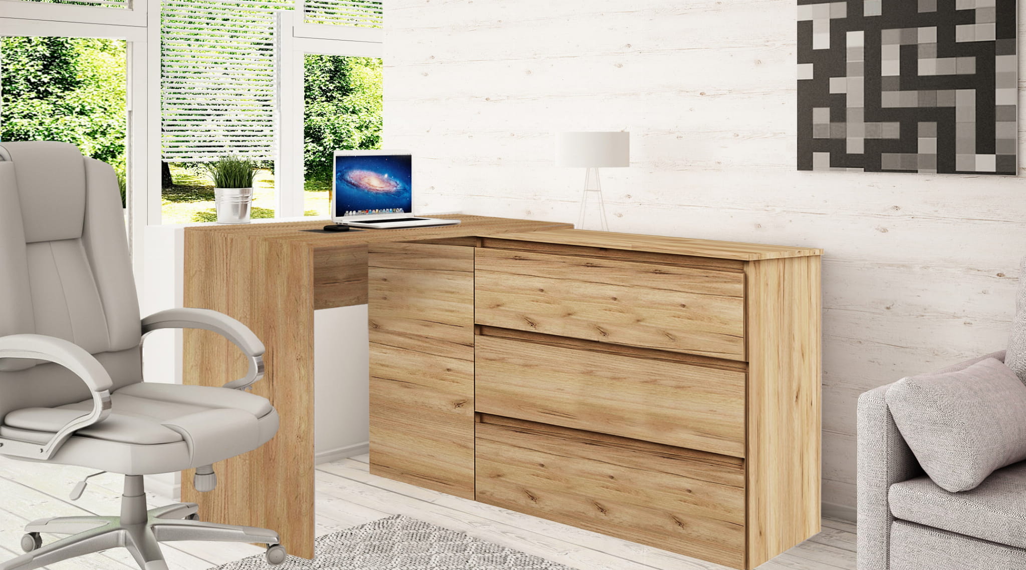 Biurko dostępne jest w kolorach: biały, dąb craft złoty, dąb craft złoty+biały. W komplecie znajdują się wszystkie niezbędne do montażu akcesoria oraz instrukcja.