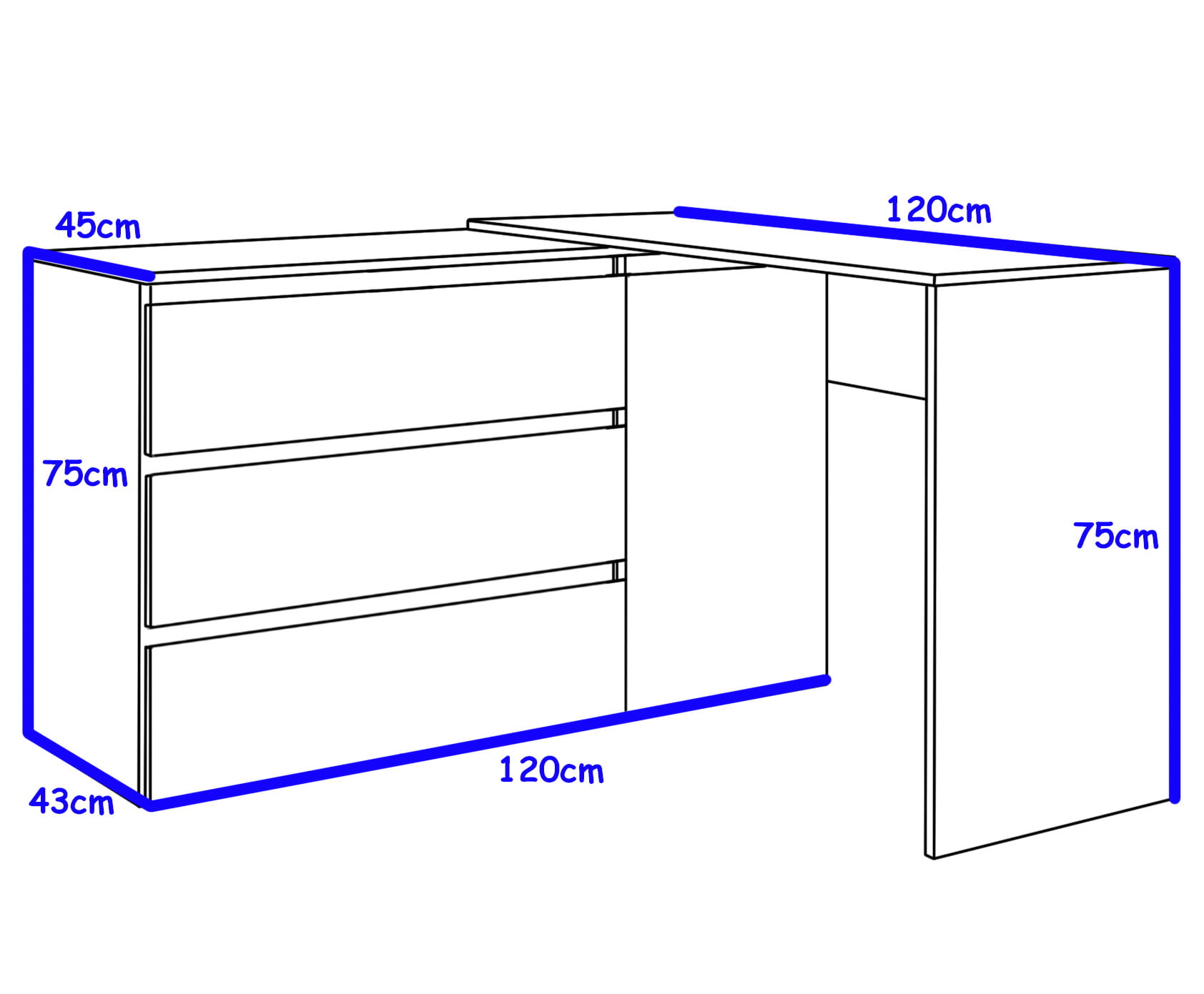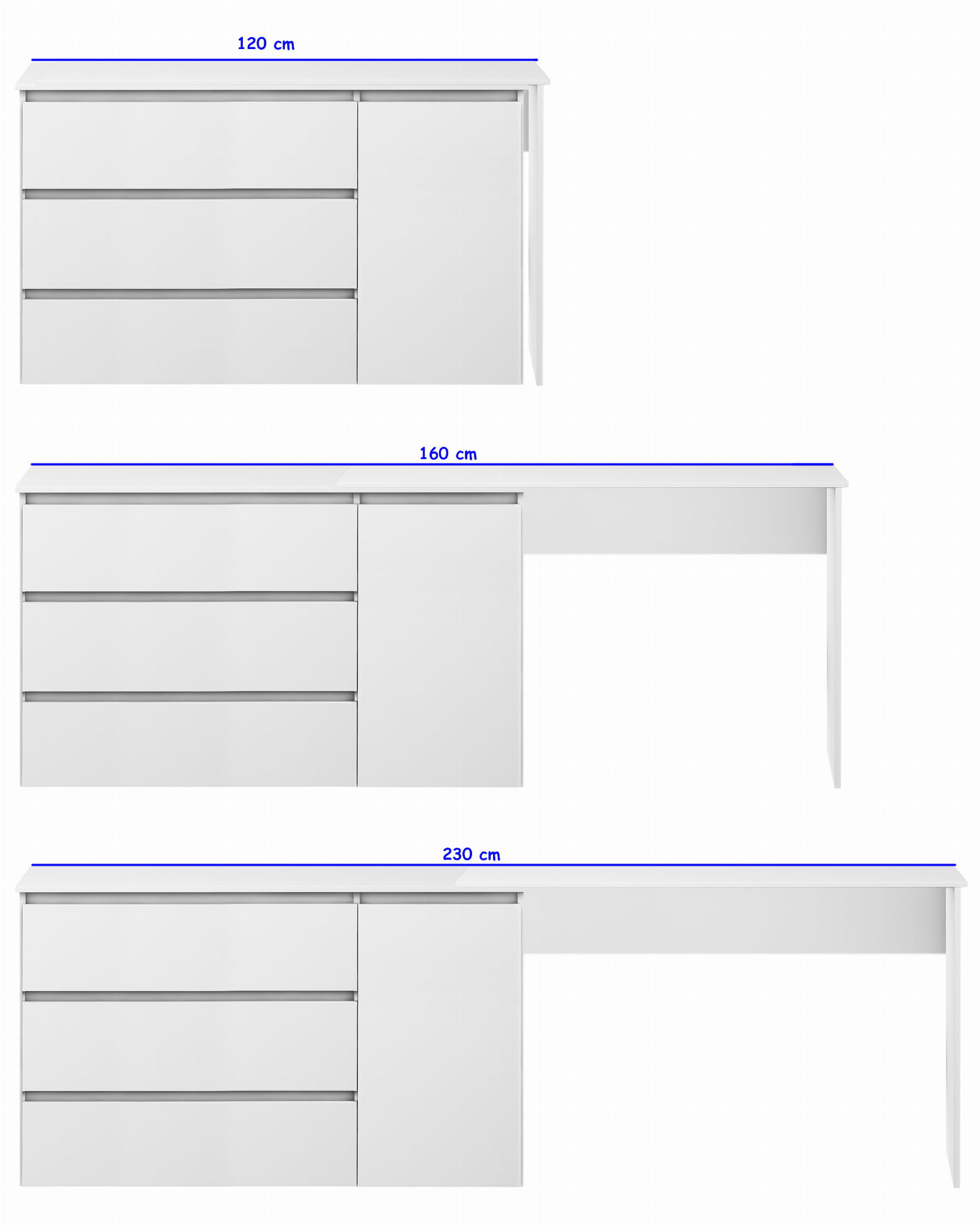 Biurko narożne Megan N5 jest niezwykle funkcjonale i pojemne, zapewnia dużo miejsca do przechowywania i wygodę w użytkowaniu. Biurko składa się z dwóch modułów: komody i dostawki (blatu). Rząd z szufladami można zamontować z prawej bądź lewej strony, a blat biurka w linii prostej lub prostopadle tworząc biurko narożne. Blat roboczy w razie potrzeby można rozsunąć aż do 110 cm, dzięki czemu zasiądą przy nim wygodnie dwie osoby. Dostawka blatu jest ruchoma więc można ją regulować w dowolnym momencie. Przy ustawieniu biurka w linii prostej i maksymalnym rozsunięciu blatu można uzyskać biurko o szerokości 230 cm! Biurko Megan N5 doskonale sprawdzi się w każdym biurze i pokoju ucznia. W systemie mebli Megan znajdują się również biurka proste oraz komody - można zatem rozbudować biuro czy pokój o kolejne elementy.