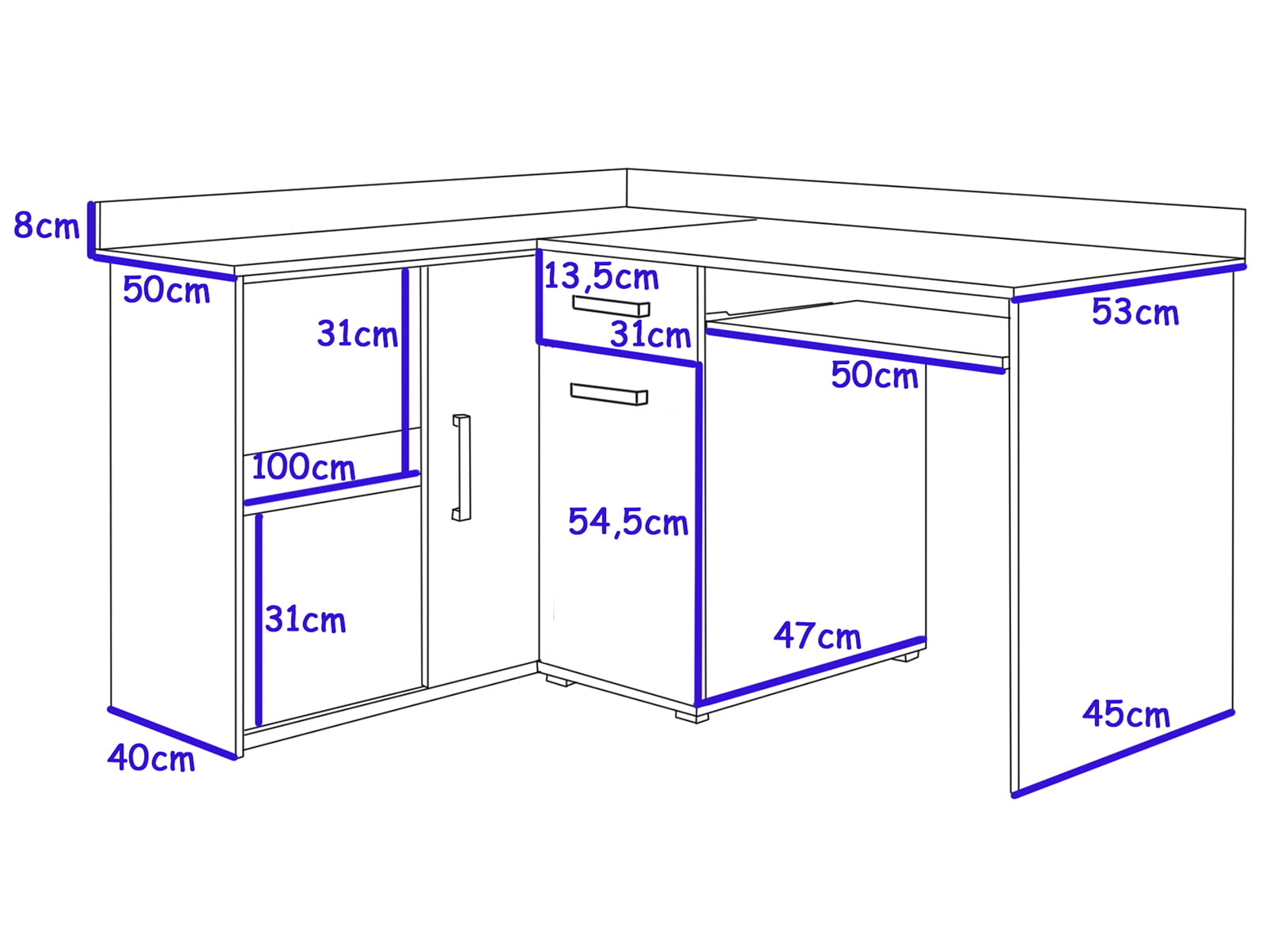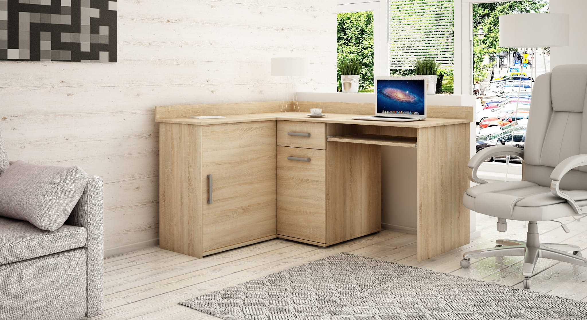 Biurko narożne Michał II, to profesjonalna propozycja do Twojego biura i gabinetu. Biurko możesz ustawić w dowolnym miejscu, ponieważ jest oklejone z każdej strony. Możesz również zmontować biurko w wersji odwrotnej, gdyż jest uniwersalne. Pojemna szafka z przesuwnymi drzwiczkami pomieści dokumenty. Półka na klawiaturę i duży blat roboczy zapewni Ci wyjątkowy komfort i wygodę. W komplecie znajdują się listwy przyblatowe, lecz decyzja o ich montażu należy do Ciebie!
