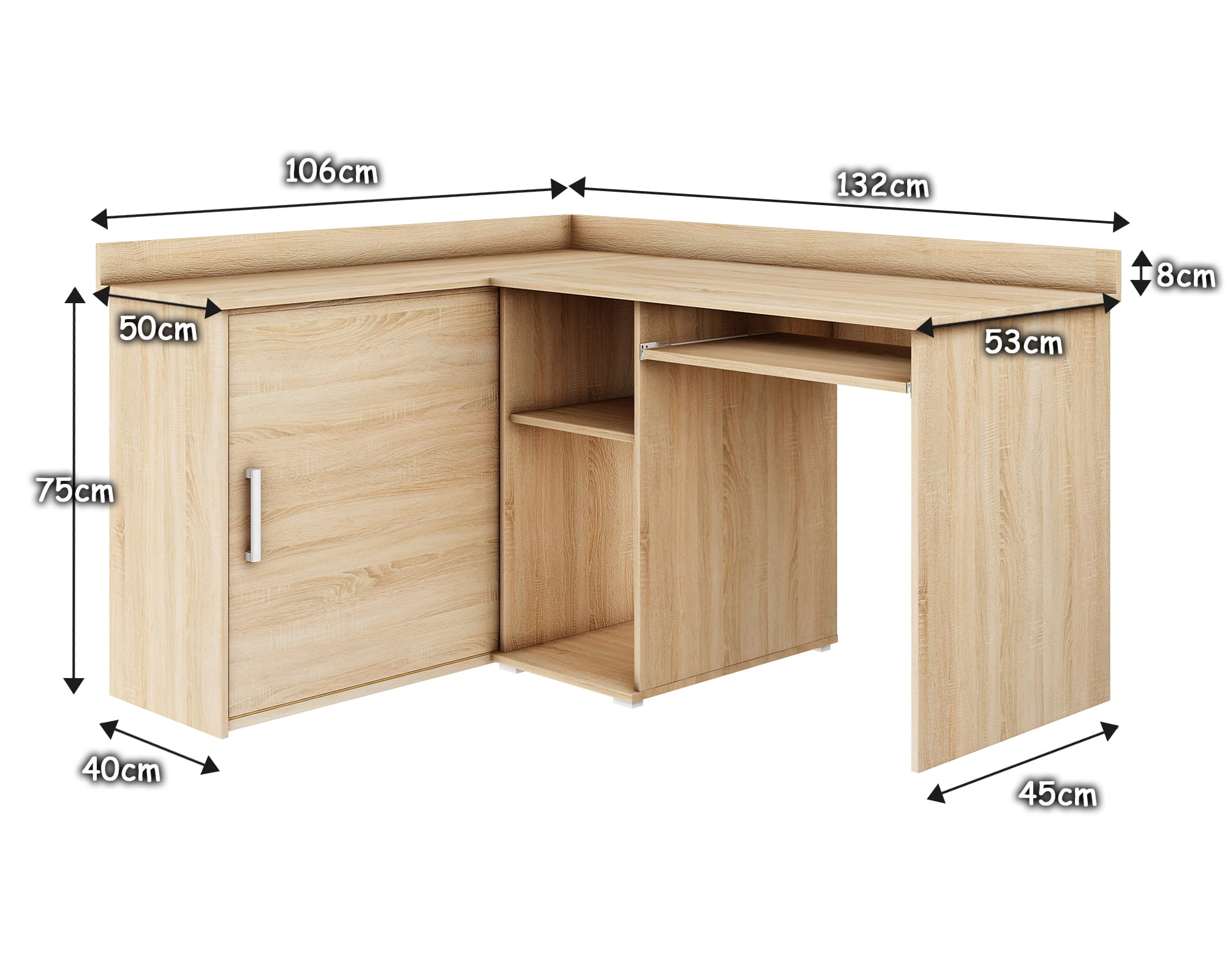 Biurko narożne Michał, to profesjonalna propozycja do Twojego biura i gabinetu. Biurko możesz ustawić w dowolnym miejscu, ponieważ jest oklejone z każdej strony. Możesz również zmontować biurko w wersji odwrotnej, gdyż jest uniwersalne. Pojemna szafka z przesuwnymi drzwiczkami pomieści dokumenty. Półka na klawiaturę i duży blat roboczy zapewni Ci wyjątkowy komfort i wygodę. W komplecie znajdują się listwy przyblatowe, lecz decyzja o ich montażu należy do Ciebie!