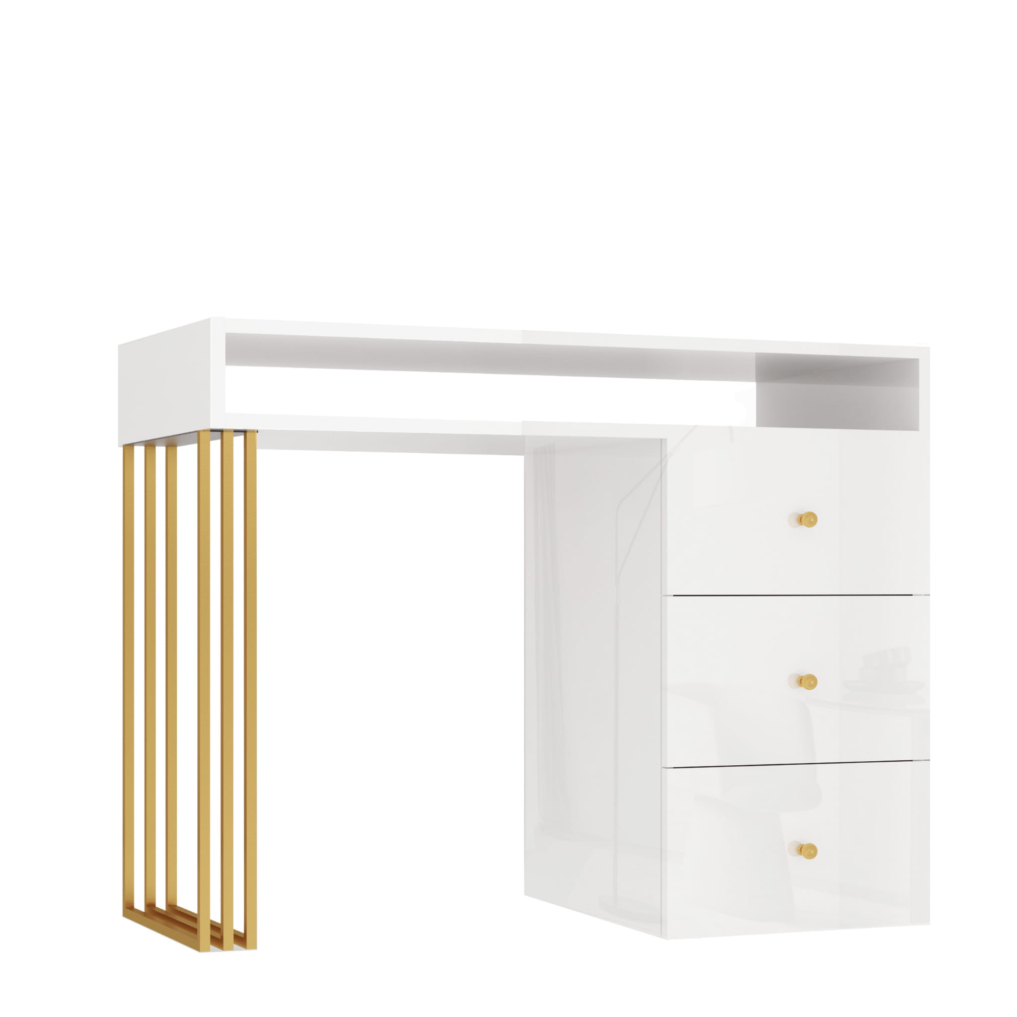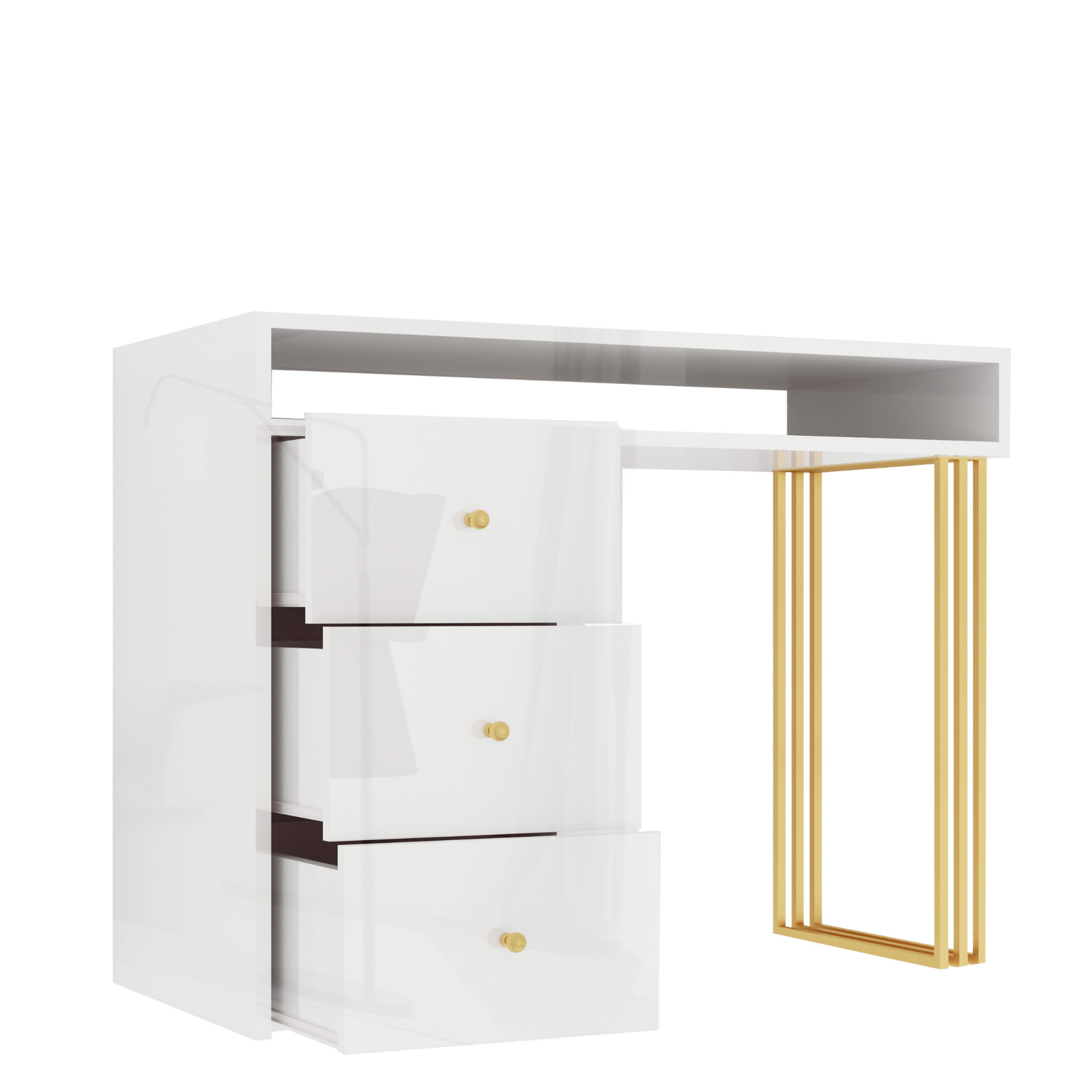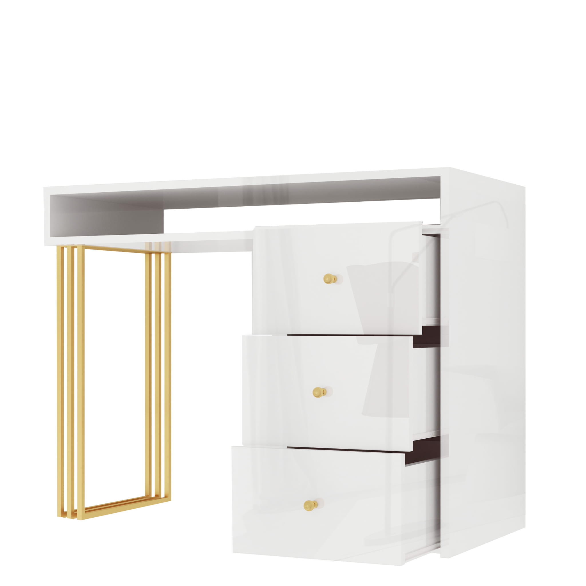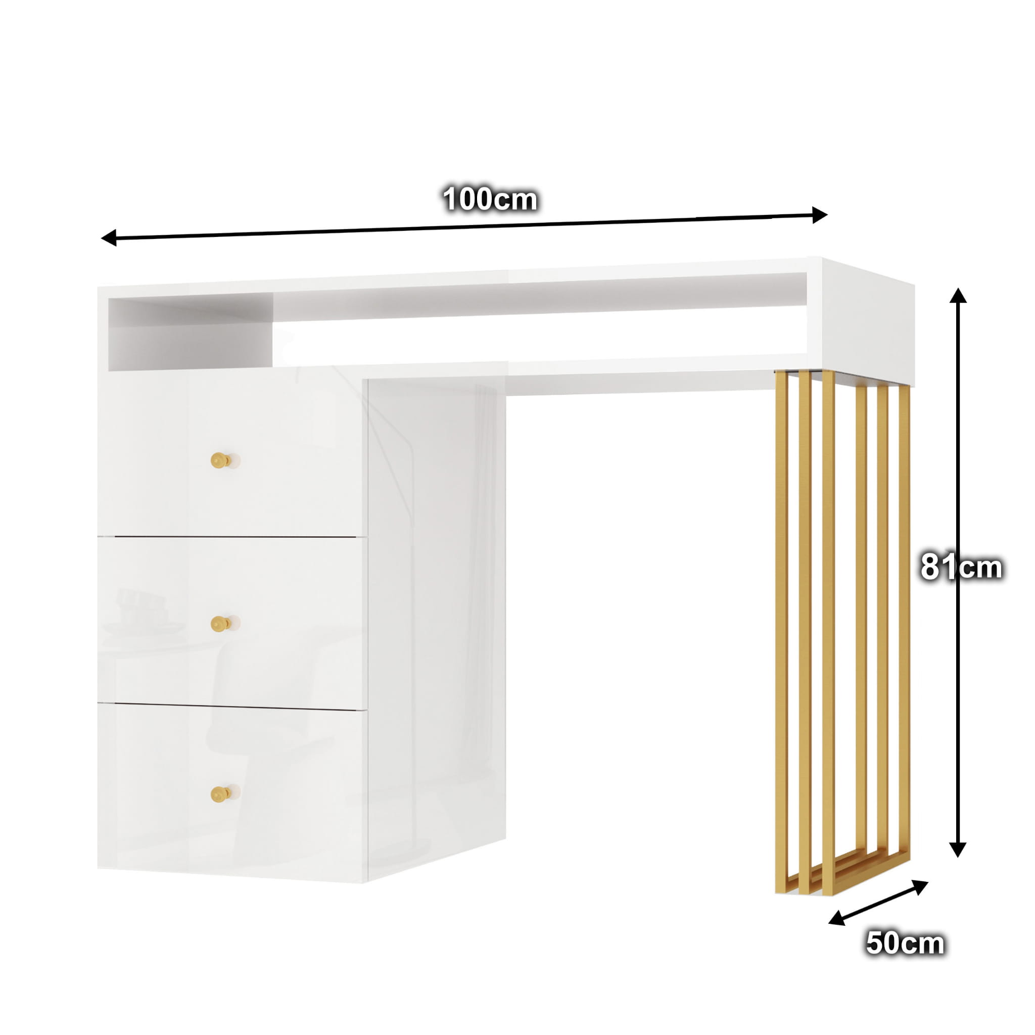 Biurko wolnostojące KLARA z szufladami 100 cm biały POŁYSK/złoty