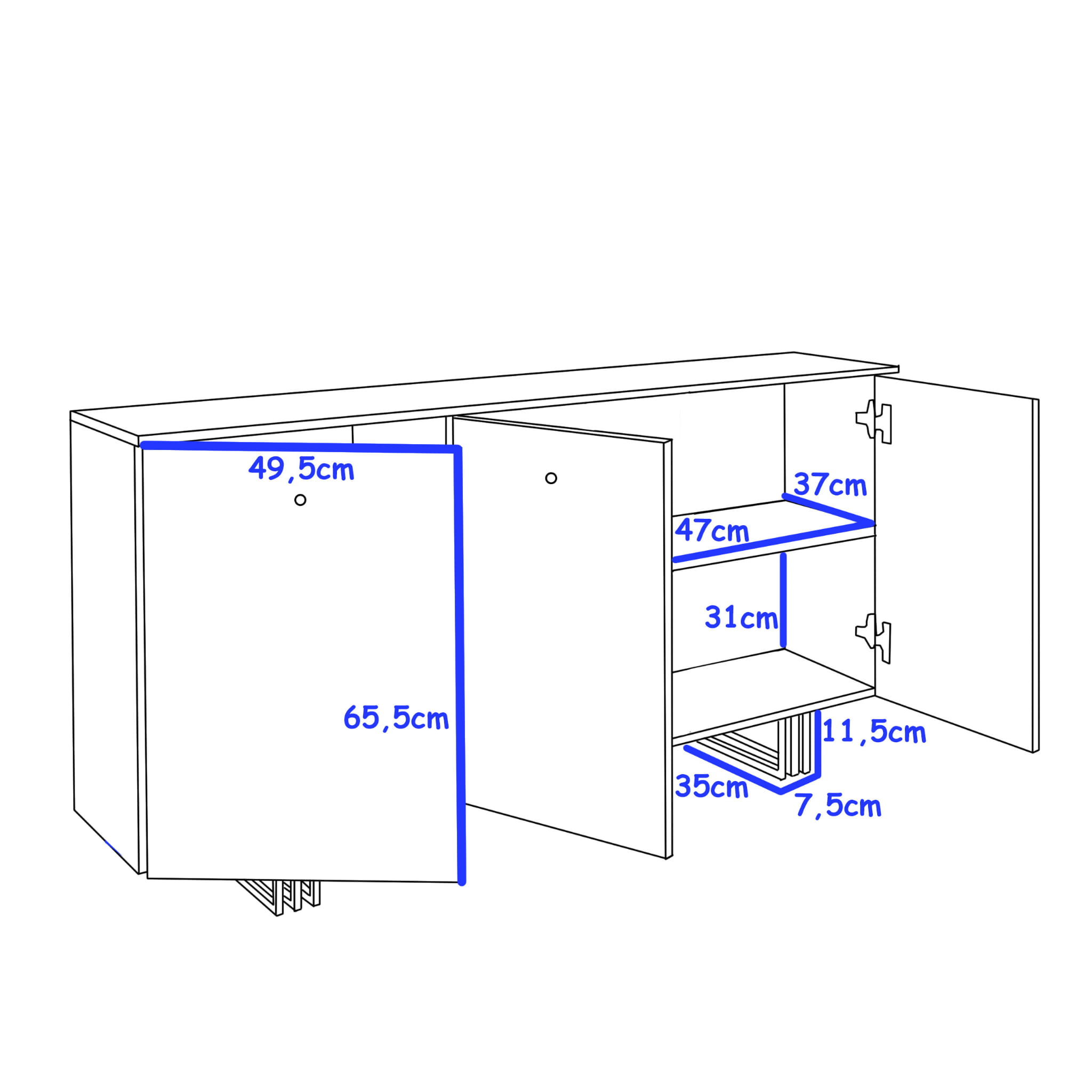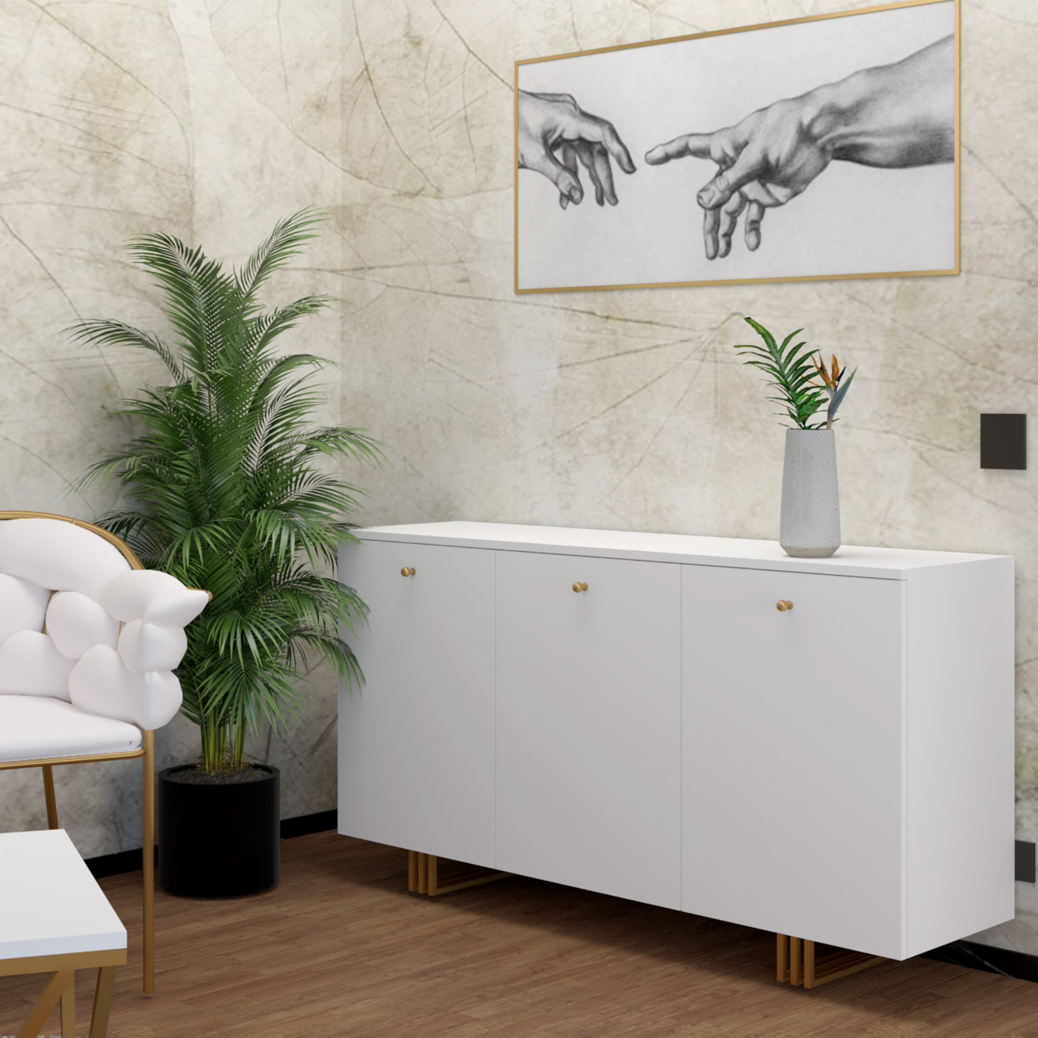 Komoda Klara 150 cm na metalowych nogach. Wykonana jest z płyty meblowej w kolorze biały mat. Złote nogi i uchwyty pięknie podkreślają wyjątkowy charakter mebla. Doskonale pasuje do wnętrz nowoczesnych, w stylu glamour i art deco. Komoda z trzema szafkami zapewni wiele miejsca do przechowywania. Meble z sytemu Klara to najmodniejszy design i gwarancja najwyższej jakości wykonania.