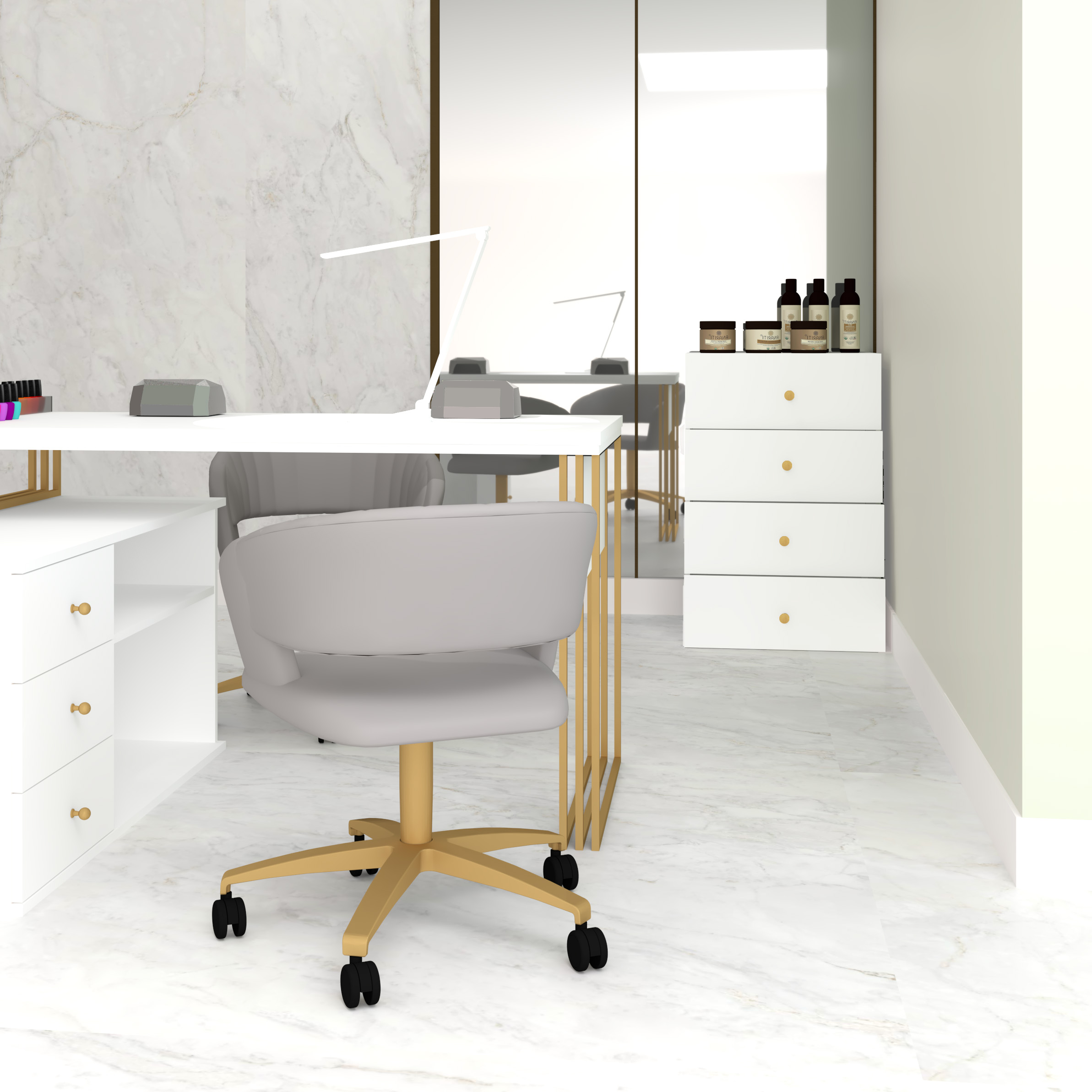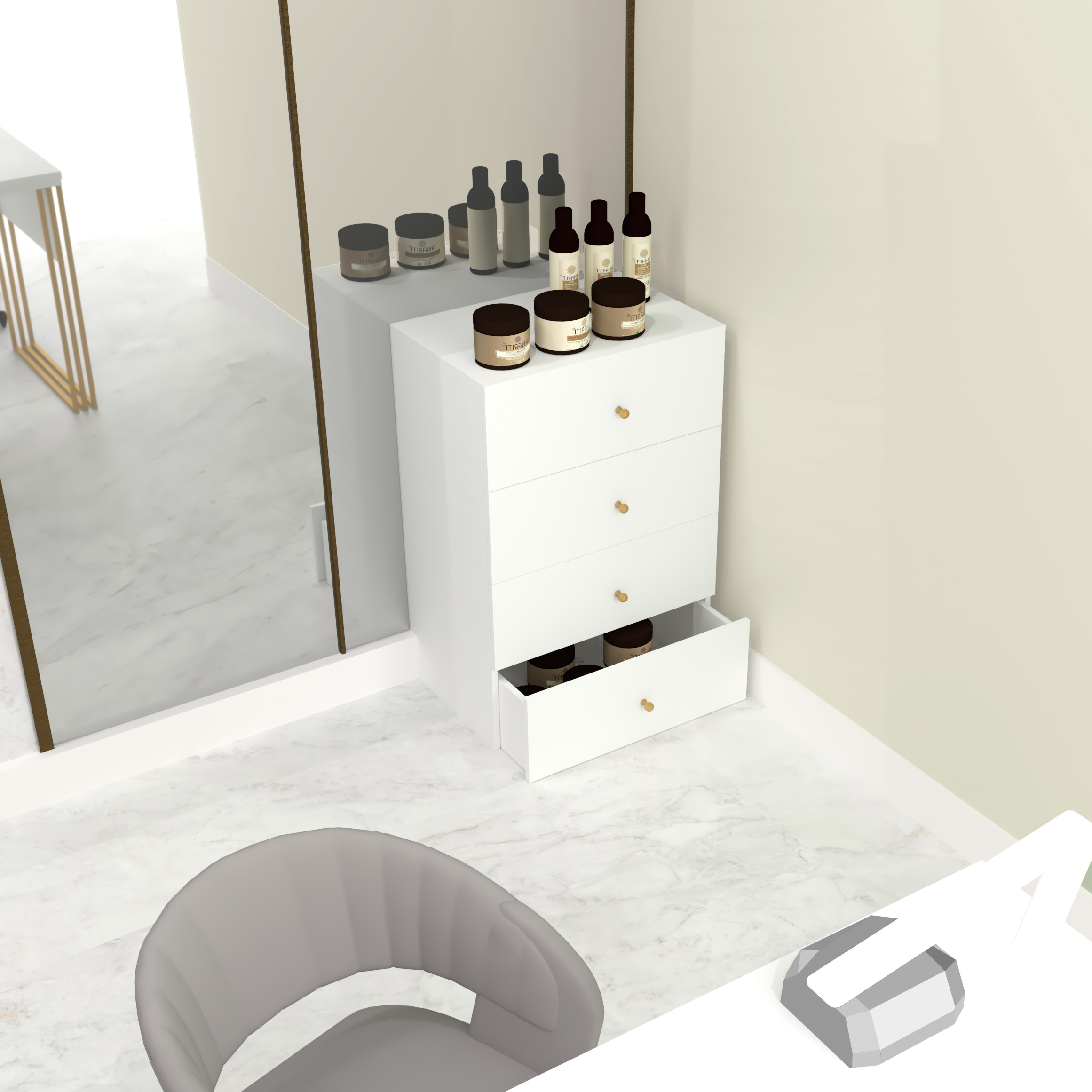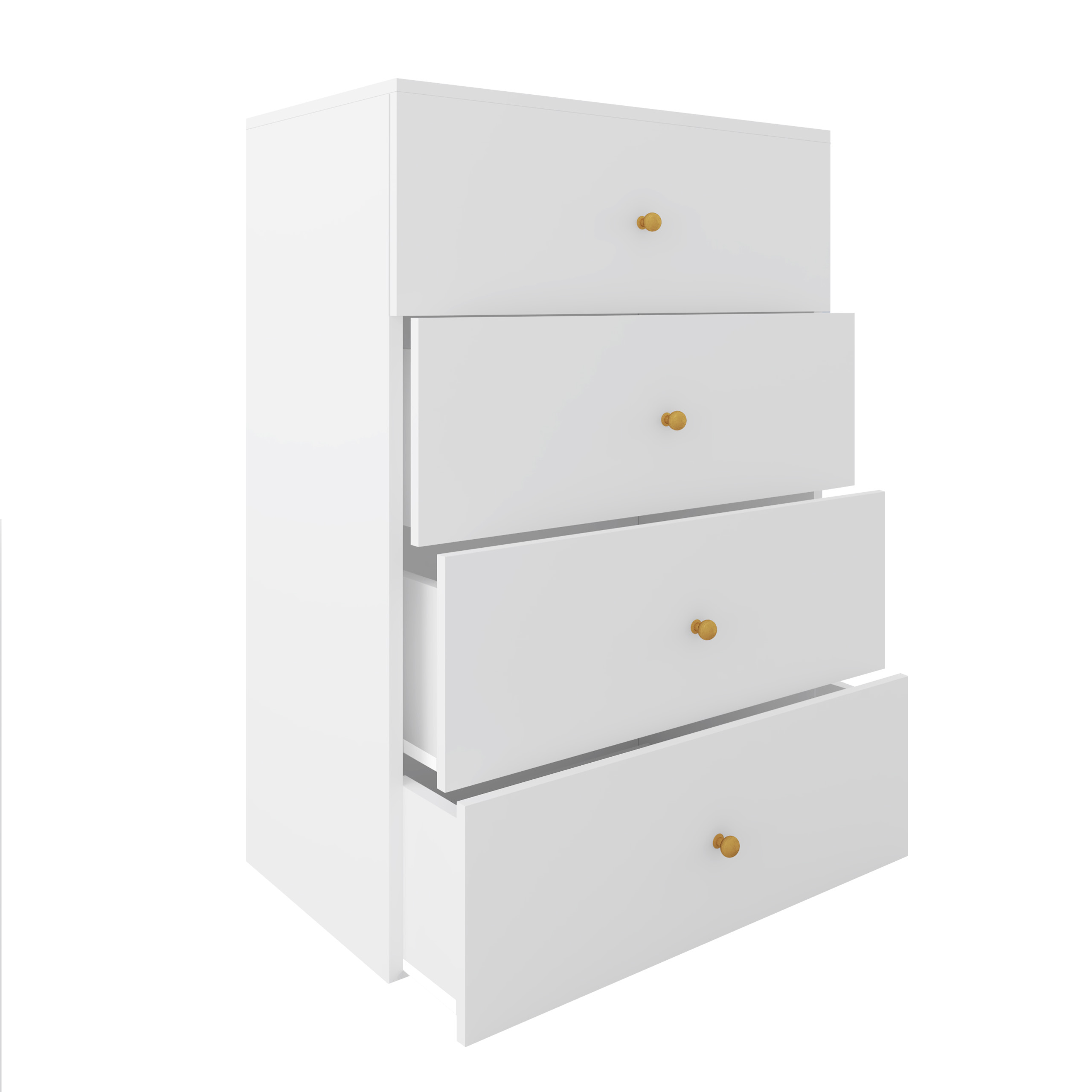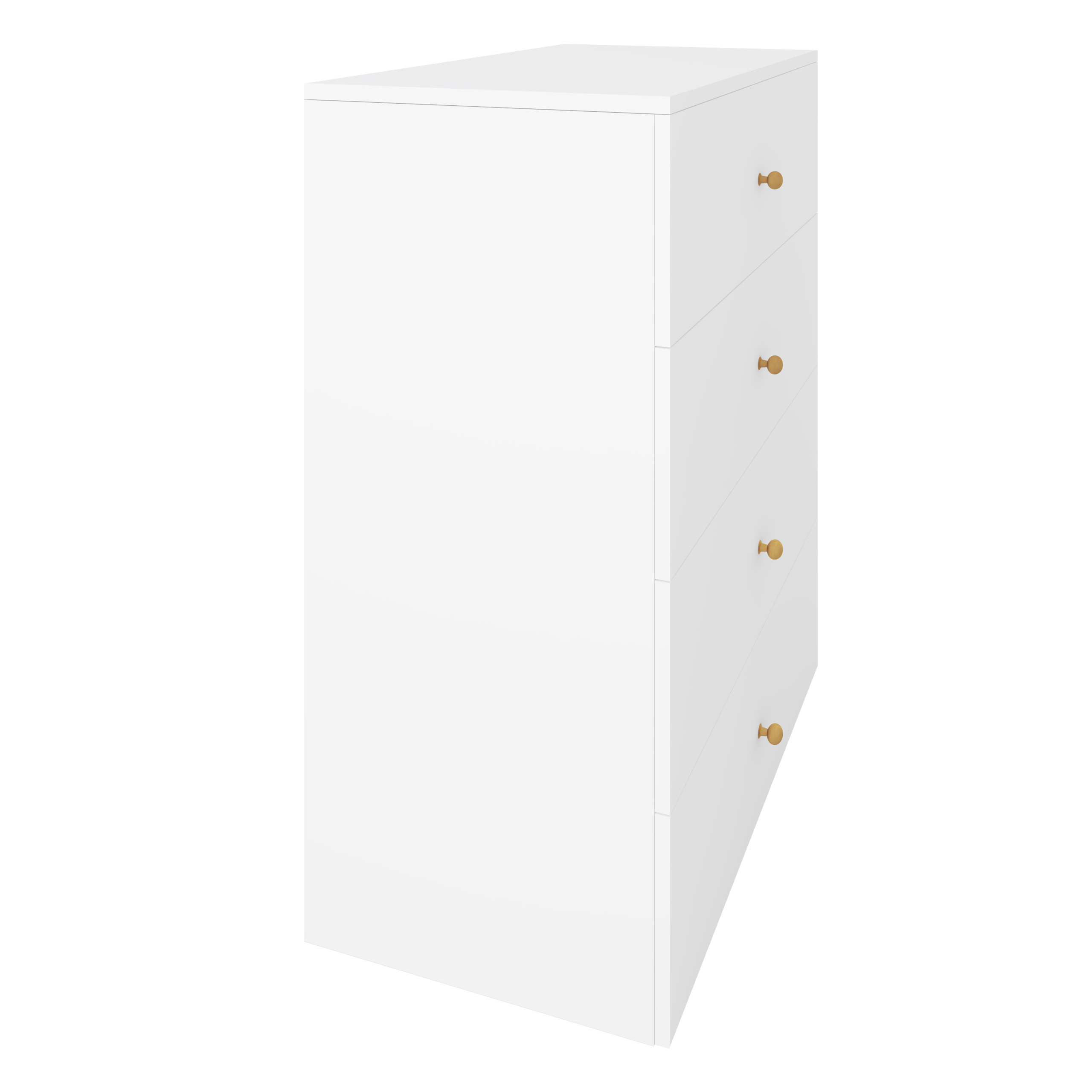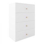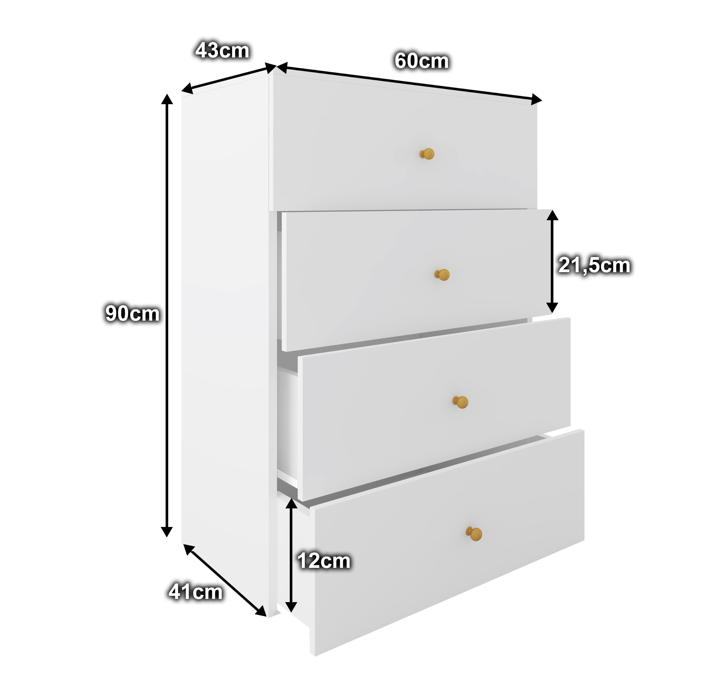 Komoda Klara 60 cm wykonana jest z płyty meblowej w kolorze biały mat. Złote uchwyty pięknie podkreślają wyjątkowy charakter mebla. Doskonale pasuje do wnętrz nowoczesnych, w stylu glamour i art deco. Komoda z czterema szufladami zapewni wiele miejsca do przechowywania. Meble z sytemu Klara to najmodniejszy design i gwarancja najwyższej jakości wykonania.