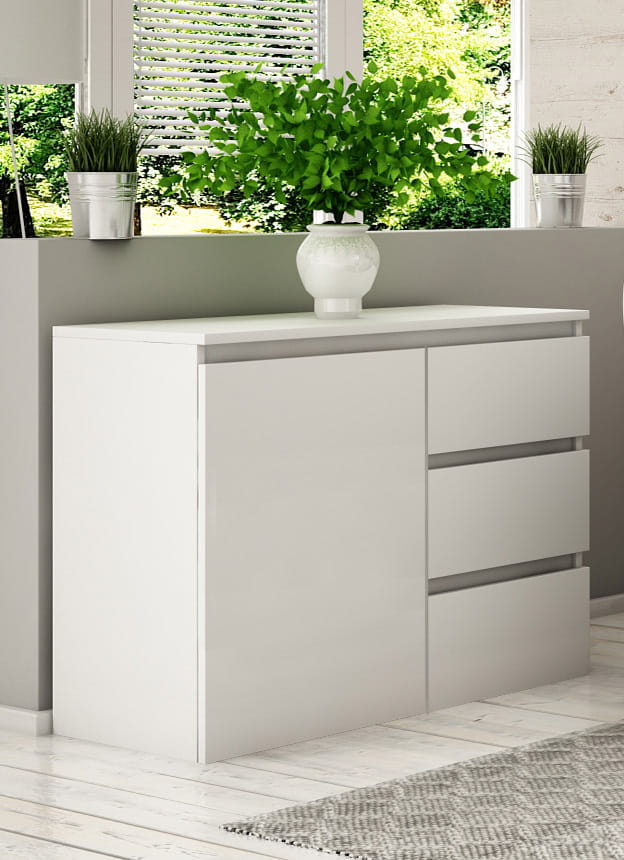 Komoda Megan K2 to połączenie nowoczesnego wzornictwa z precyzją wykonania i wygodą użytkowania. Pojemna komoda o szerokości 90 cm z trzema szufladami i jedną szafką dzieloną wewnątrz dwoma półkami, zapewni wiele miejsca do przechowywania. Komoda będzie się doskonale prezentować w salonie, pokoju dziecka, biurze czy gabinecie.