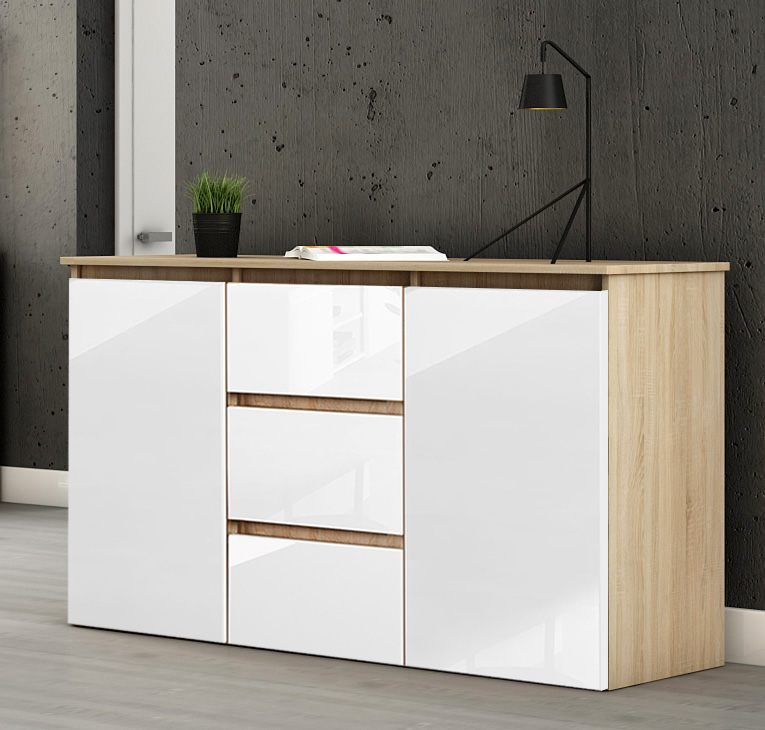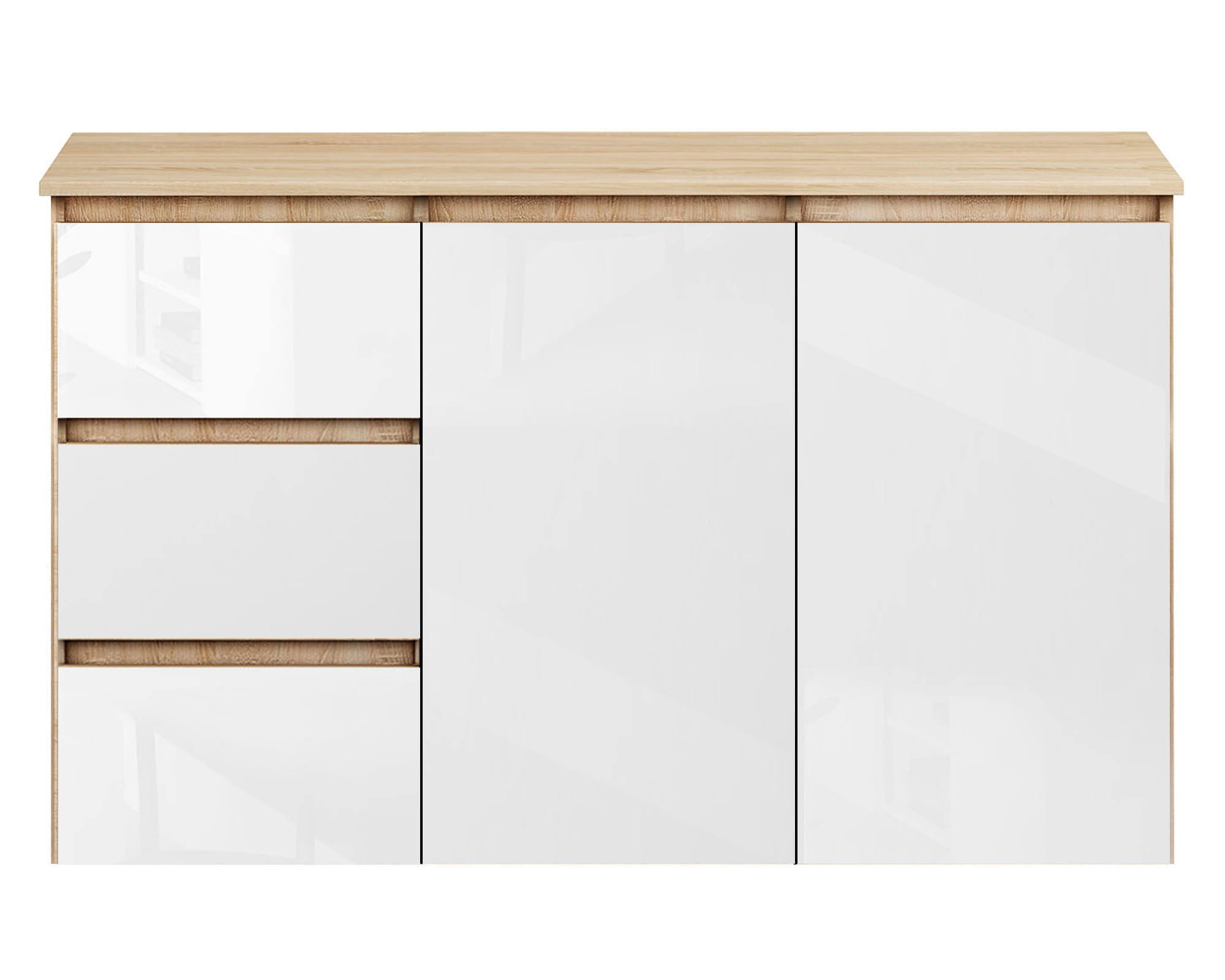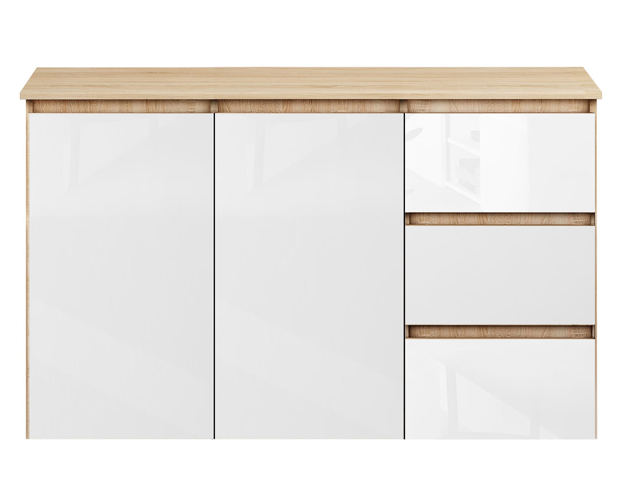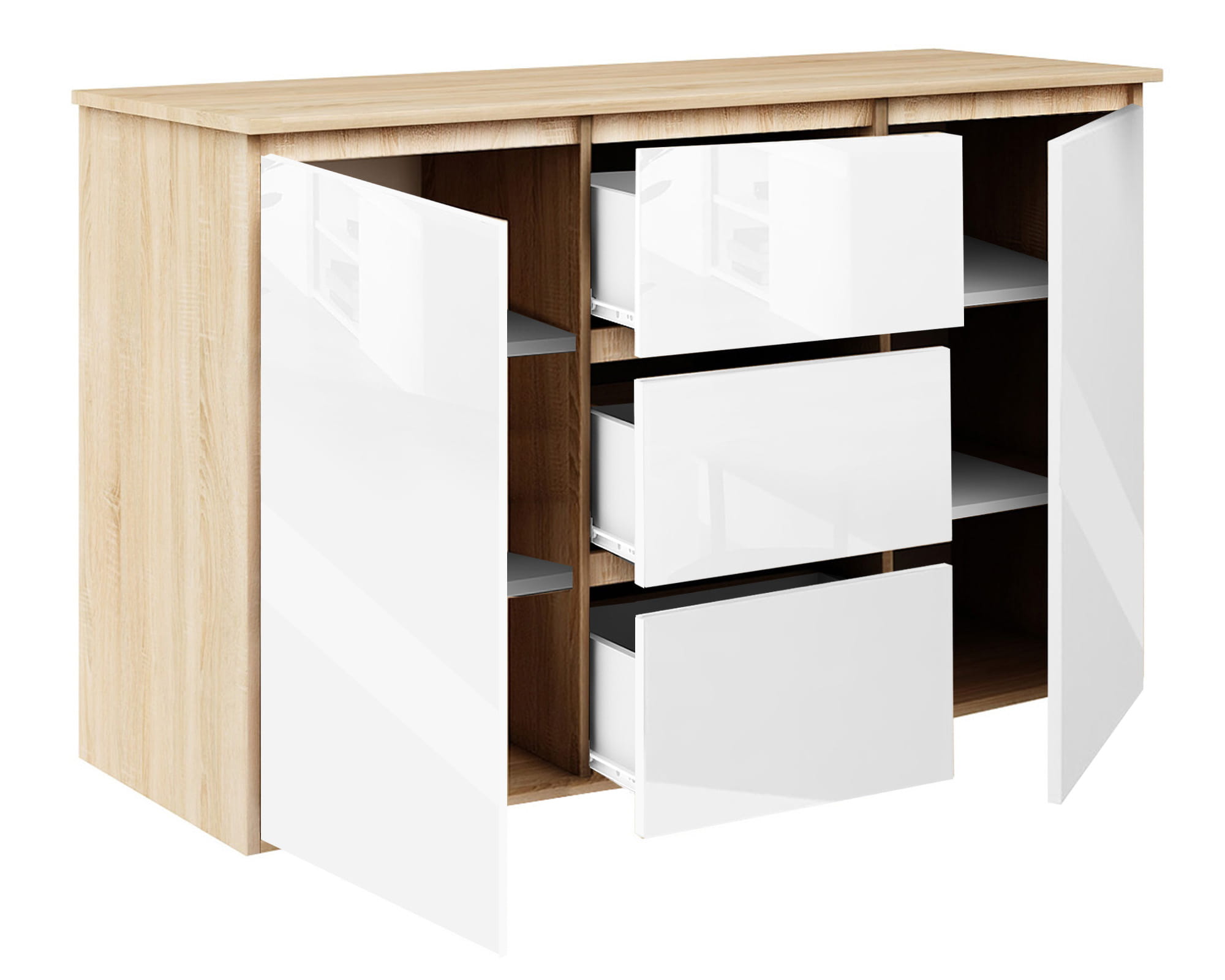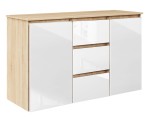 Komoda MEGAN K3 z szafkami i szufladami 120 cm dąb sonoma/biały FRONTY POŁYSK
