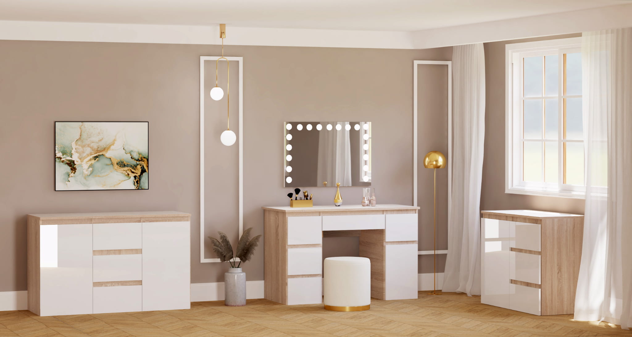 Komoda Megan K3 jest jednym z elementów mebli systemowych Megan, w którym oferujemy również biurka oraz toaletki z oświetleniem led. System charakteryzuje się nowoczesnym wzornictwem bez uchwytów.
