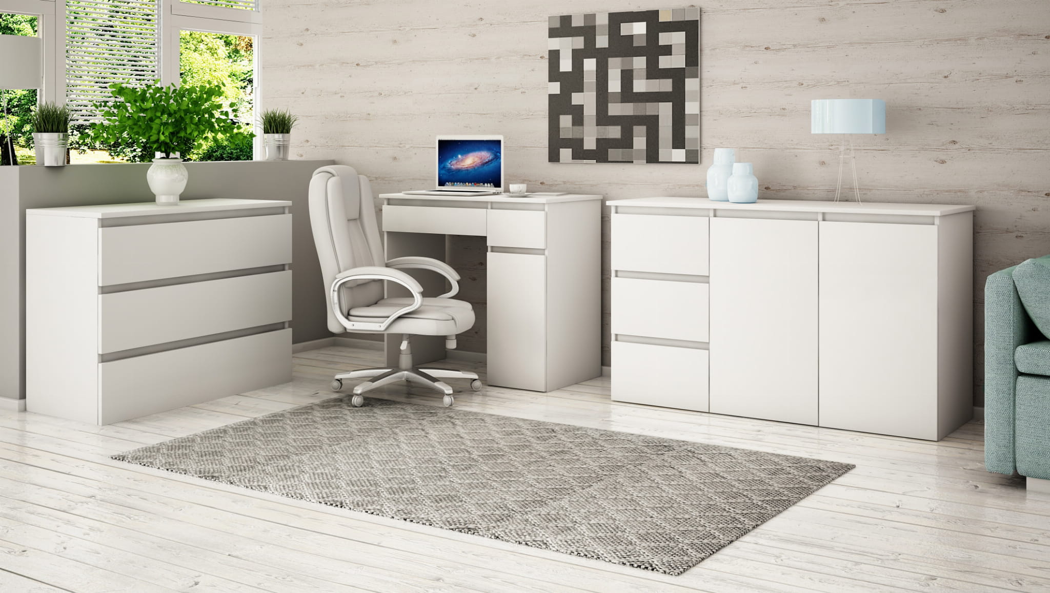 Komoda Megan K3 jest jednym z elementów mebli systemowych Megan, w którym oferujemy również biurka oraz toaletki z oświetleniem led. System charakteryzuje się nowoczesnym wzornictwem bez uchwytów.