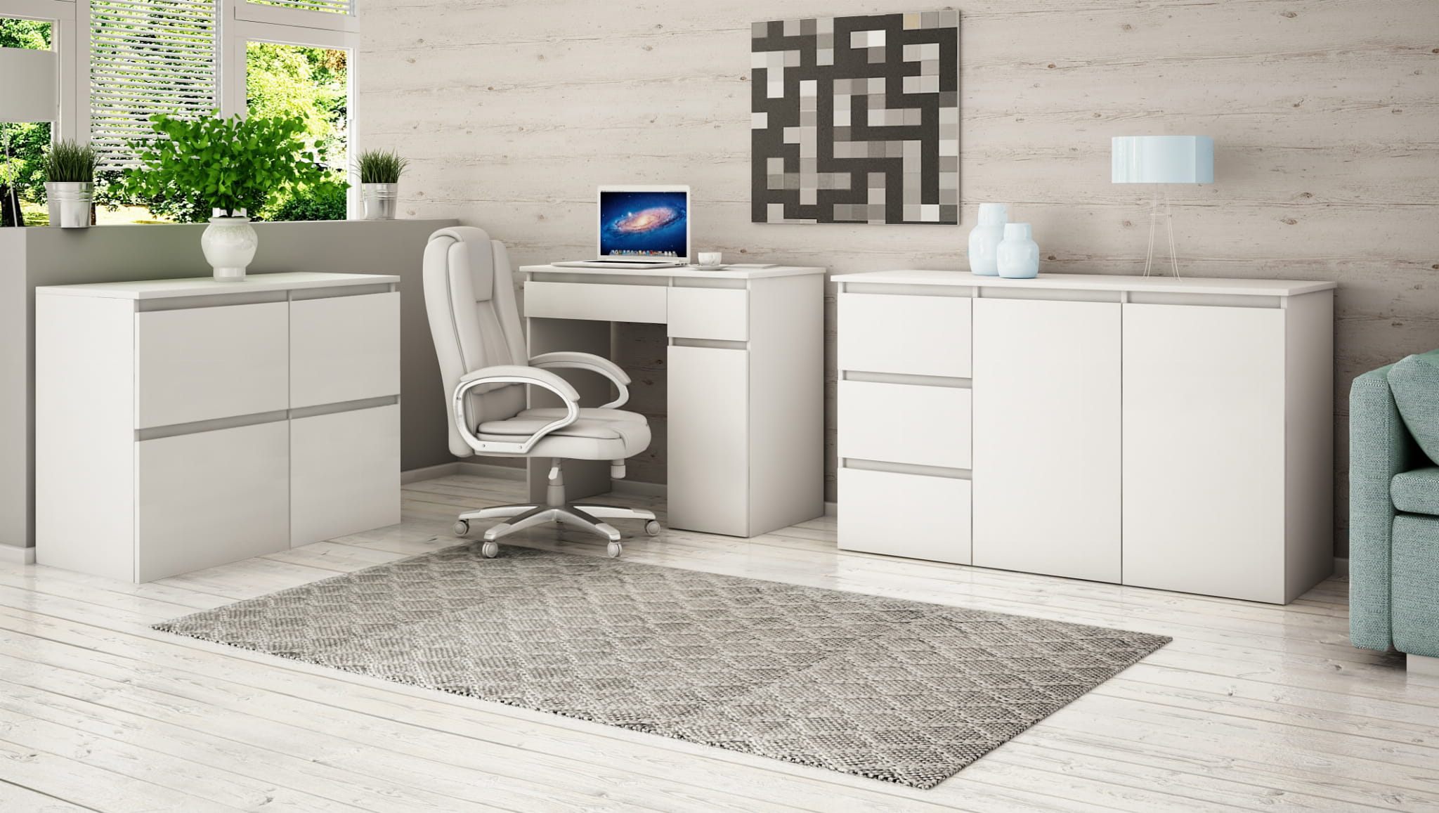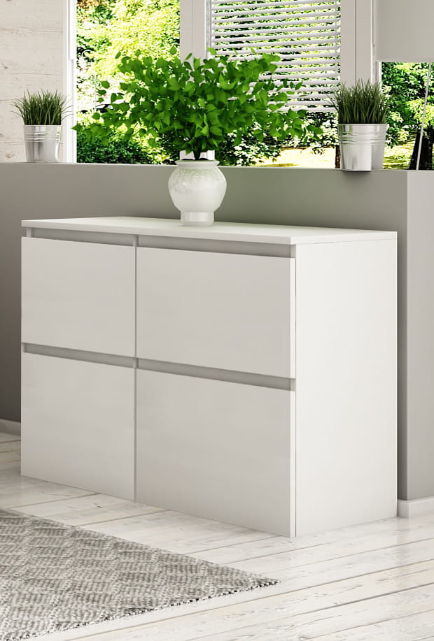 Komoda Megan K4 jest jednym z elementów mebli systemowych Megan, w którym oferujemy również biurka oraz toaletki z oświetleniem led. System charakteryzuje się nowoczesnym wzornictwem bez uchwytów.
