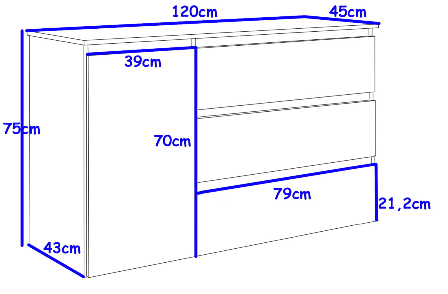 Komoda Megan K5 to połączenie nowoczesnego wzornictwa z precyzją wykonania i wygodą użytkowania. Duża pojemna komoda o szerokości 120 cm z szafką dzieloną wewnątrz dwoma półkami oraz trzy pojemne szuflady zapewnią wiele miejsca do przechowywania. Komoda będzie się doskonale prezentować w salonie, pokoju dziecka, biurze czy gabinecie.