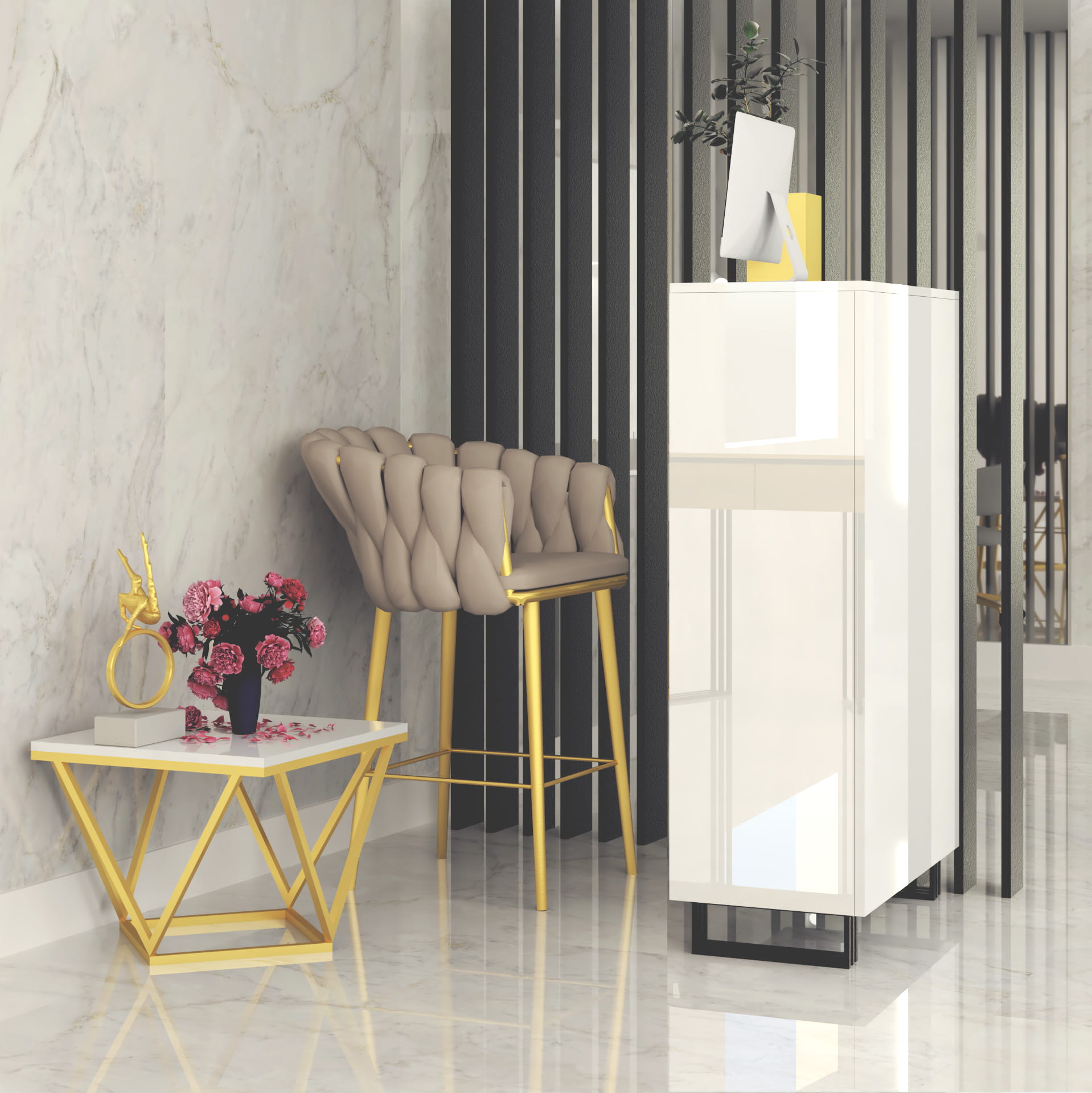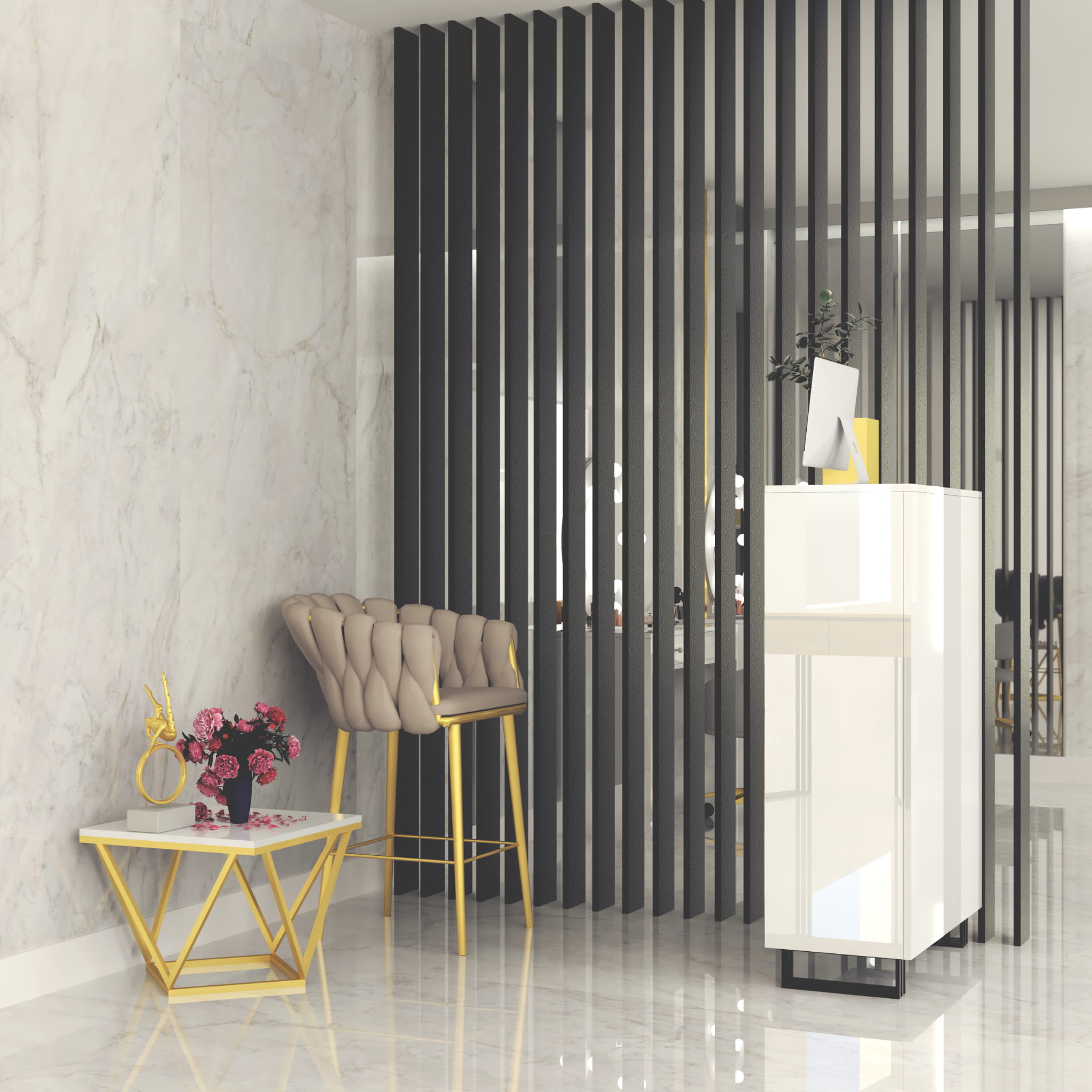 Lada recepcyjna Klara 1 do salonu urody. Wykonana jest z płyty meblowej w kolorze biały połysk. Metalowe, malowane proszkowo nogi w kolorze czarnym pięknie podkreślają kolor mebla. Recepcja jest w pełni zabudowana od strony klientów. Ergonomiczne wymiary lady, odpowiednia wysokość i otwarte półki od strony recepcjonistki sprawią, że Twoja codzienna praca będzie niezwykle komfortowa. Duża ilość otwartych półek pozwoli Ci uporządkować wszystkie niezbędne rzeczy do pracy: terminal płatniczy, kasę fiskalną czy kalendarz. Meble z sytemu Klara to najmodniejszy design i gwarancja najwyższej jakości wykonania. Lada recepcyjna Klara 1 doskonale sprawdzi się w salonie kosmetycznym, fryzjerskim, masażu czy studiu tatuażu. Oferujemy szeroki asortyment mebli z systemu Klara - z nami możesz umeblować swój wymarzony salon urody!