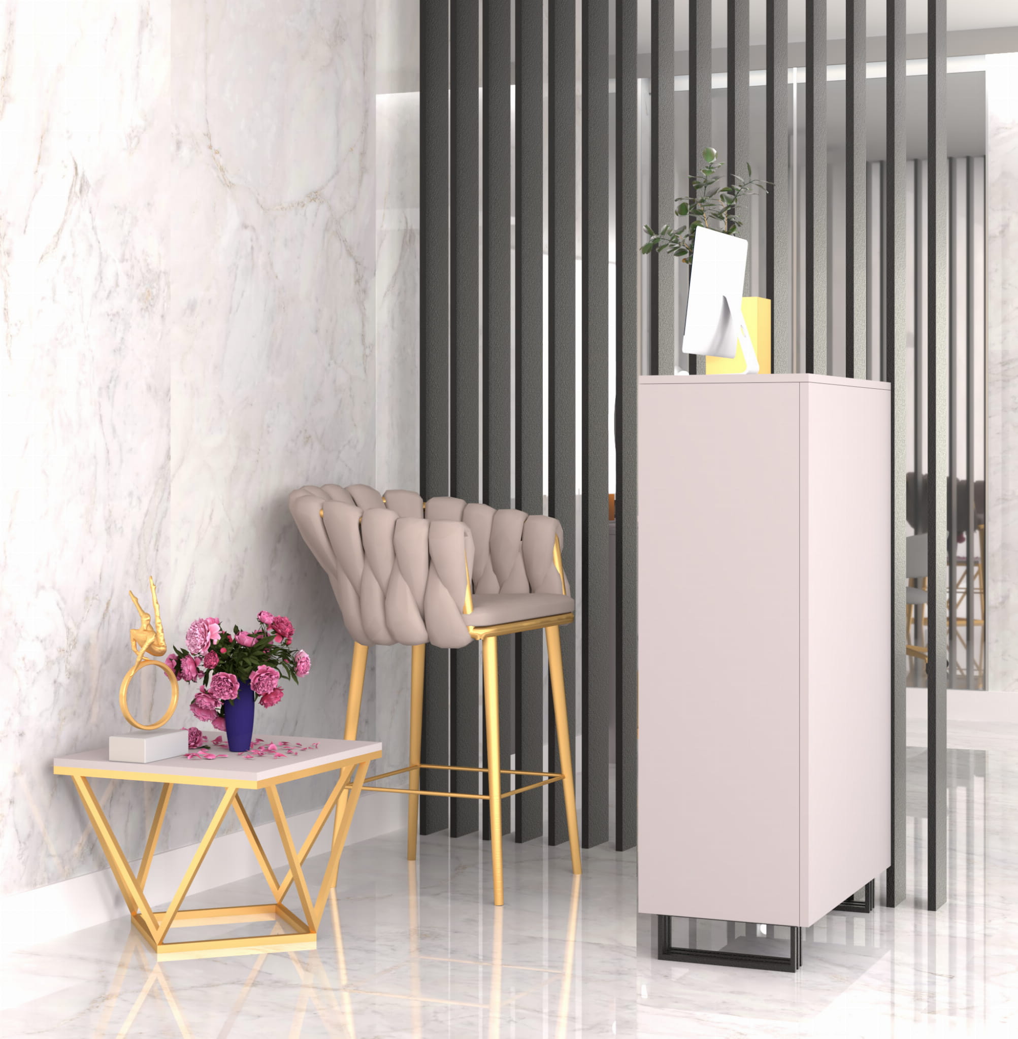 Lada recepcyjna Klara 1 do salonu urody. Wykonana jest z płyty meblowej w kolorze kaszmir (beż). Metalowe, malowane proszkowo nogi w kolorze czarnym pięknie podkreślają kolor mebla. Recepcja jest w pełni zabudowana od strony klientów. Ergonomiczne wymiary lady, odpowiednia wysokość i otwarte półki od strony recepcjonistki sprawią, że Twoja codzienna praca będzie niezwykle komfortowa. Duża ilość otwartych półek pozwoli Ci uporządkować wszystkie niezbędne rzeczy do pracy: terminal płatniczy, kasę fiskalną czy kalendarz. Meble z sytemu Klara to najmodniejszy design i gwarancja najwyższej jakości wykonania. Lada recepcyjna Klara 1 doskonale sprawdzi się w salonie kosmetycznym, fryzjerskim, masażu czy studiu tatuażu. Oferujemy szeroki asortyment mebli z systemu Klara - z nami możesz umeblować swój wymarzony salon urody!