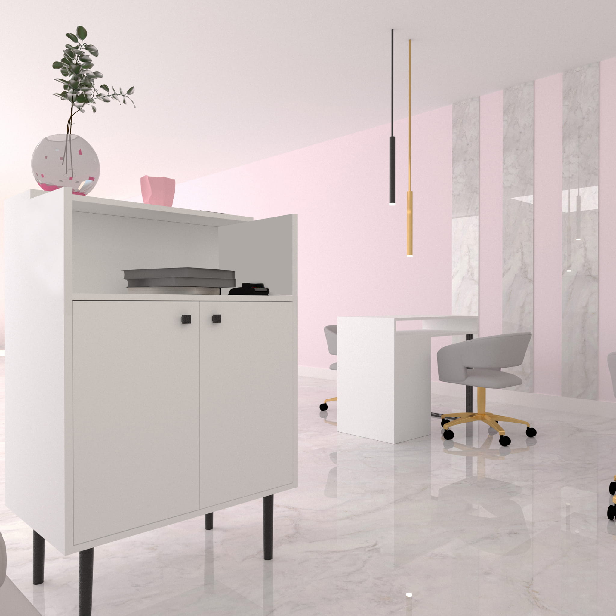 Lada recepcyjna Klara 3 do salonu urody. Wykonana jest z płyty meblowej w kolorze biały mat. Metalowe, malowane proszkowo nogi w kolorze czarnym nadadzą wnętrzu elegancji. Recepcja jest w pełni zabudowana od strony klientów i wykończona panelem tapicerowanym wysokiej jakości tkaniną velevet i pikowaniem z kryształków. Ergonomiczne wymiary lady, odpowiednia wysokość i dwie szafki od strony recepcjonistki sprawią, że Twoja codzienna praca będzie niezwykle komfortowa. Duża ilość miejsca do przechowywania pozwoli Ci uporządkować wszystkie niezbędne rzeczy do pracy: terminal płatniczy, kasę fiskalną czy kalendarz. Meble z sytemu Klara to najmodniejszy design i gwarancja najwyższej jakości wykonania. Lada recepcyjna Klara 3 doskonale sprawdzi się w salonie kosmetycznym, fryzjerskim, masażu czy studiu tatuażu. Oferujemy szeroki asortyment mebli z systemu Klara - z nami możesz umeblować swój wymarzony salon urody!