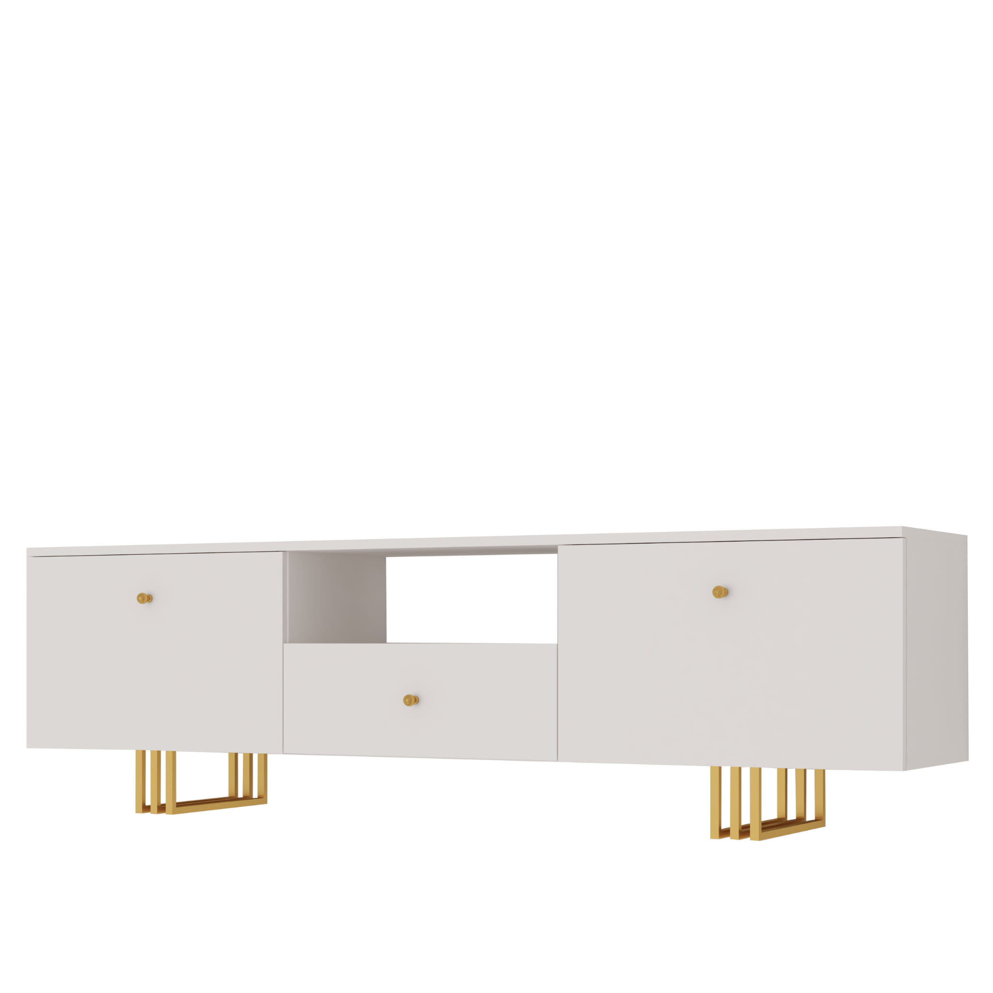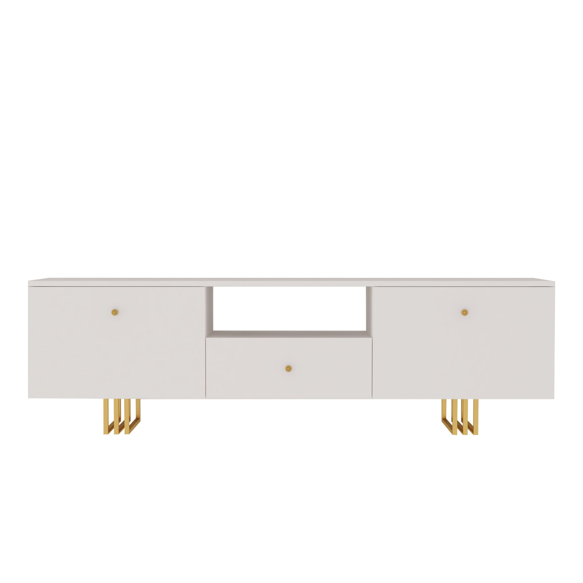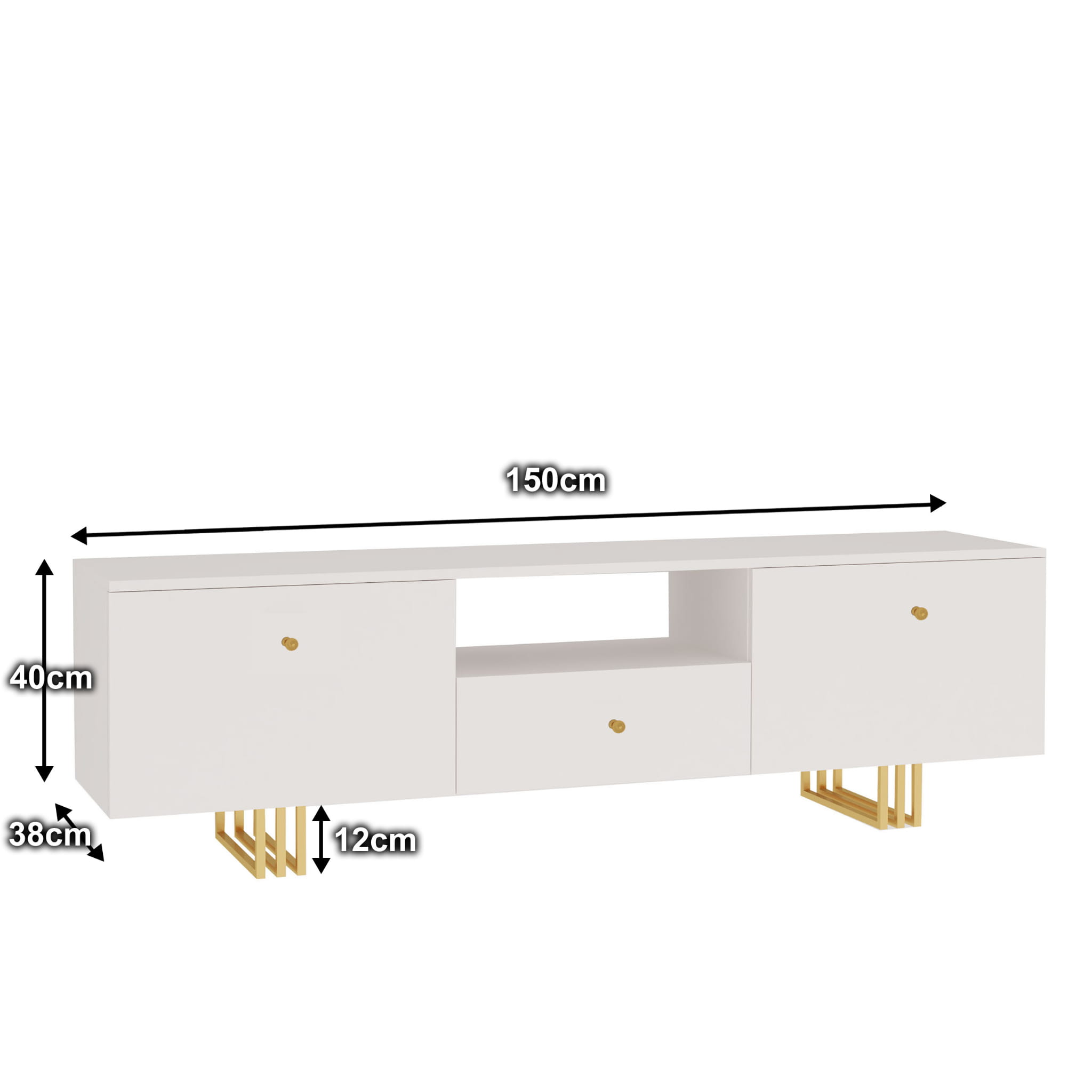 Szafka RTV Klara 150 cm na metalowych nogach. Wykonana jest z płyty meblowej w kolorze kaszmirowym (jasny beż). Złote nogi i uchwyty pięknie podkreślają kolor mebla. Doskonale pasuje do wnętrz nowoczesnych, w stylu glamour i art deco. Posiada dwie zamykane szafki i szufladę. Meble z sytemu Klara to najmodniejszy design i gwarancja najwyższej jakości wykonania.