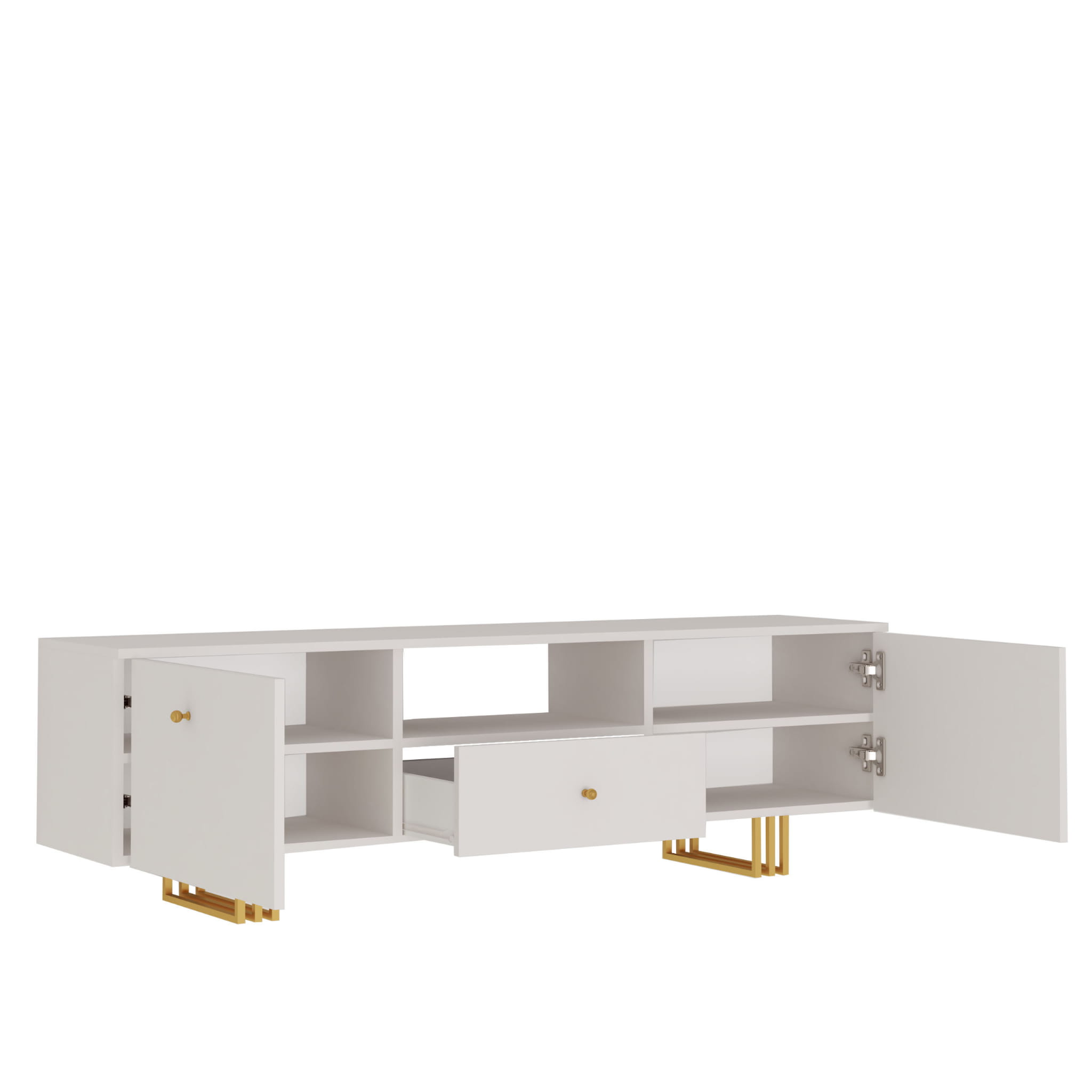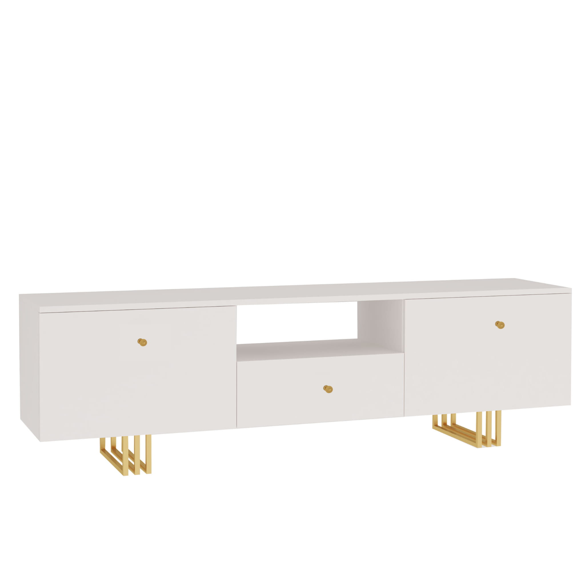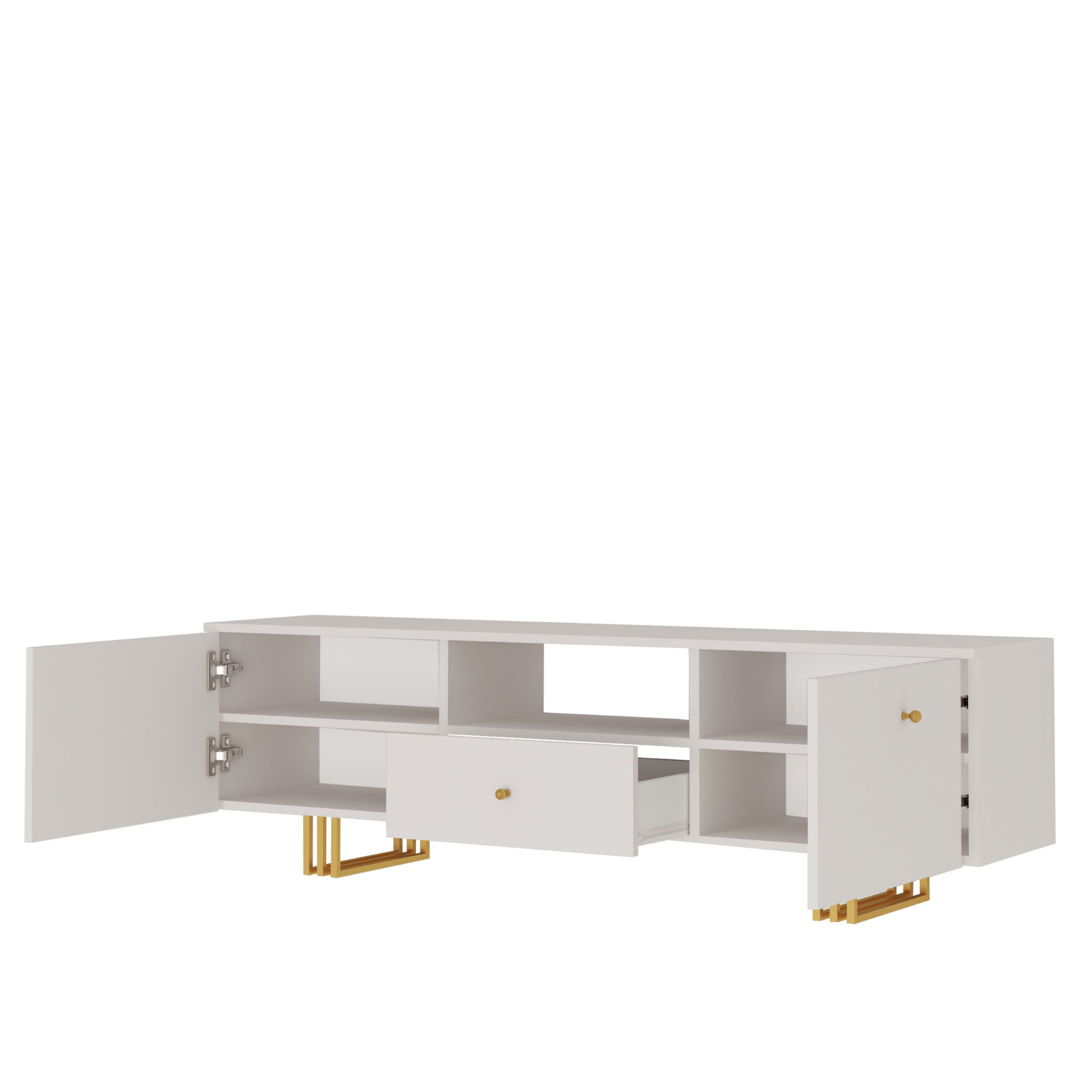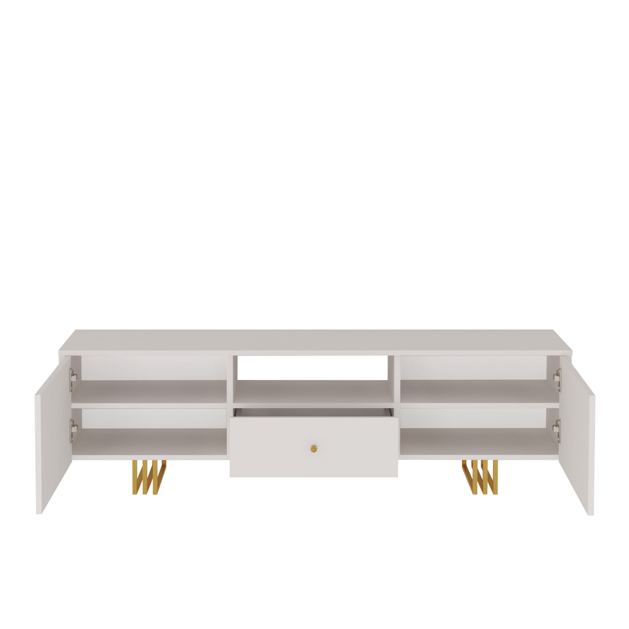 Szafka RTV Klara 150 cm na metalowych nogach. Wykonana jest z płyty meblowej w kolorze kaszmirowym (jasny beż). Złote nogi i uchwyty pięknie podkreślają kolor mebla. Doskonale pasuje do wnętrz nowoczesnych, w stylu glamour i art deco. Posiada dwie zamykane szafki i szufladę. Meble z sytemu Klara to najmodniejszy design i gwarancja najwyższej jakości wykonania.
