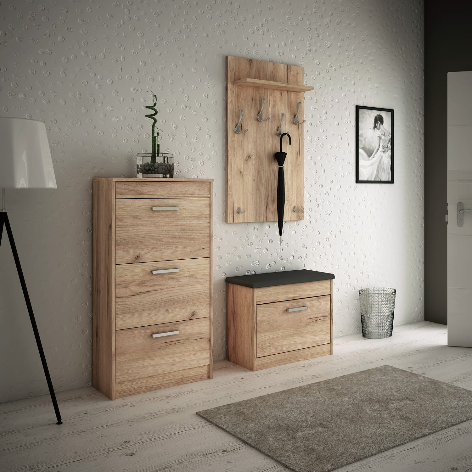 Szafka na buty Alaska 13, to niezastąpiony element wyposażenia każdego przedpokoju. Trzy schowki z podwójnymi przegrodami pomieszczą buty całej rodziny, a w Twoim przedpokoju zapanuje upragniony ład i porządek. Dodatkowym atutem jest uchylny schowek na drobiazgi. Do uzupełnienia aranżacji doskonale pasować będzie szafka na buty z siedziskiem Alaska 11 i wieszak na ubrania.