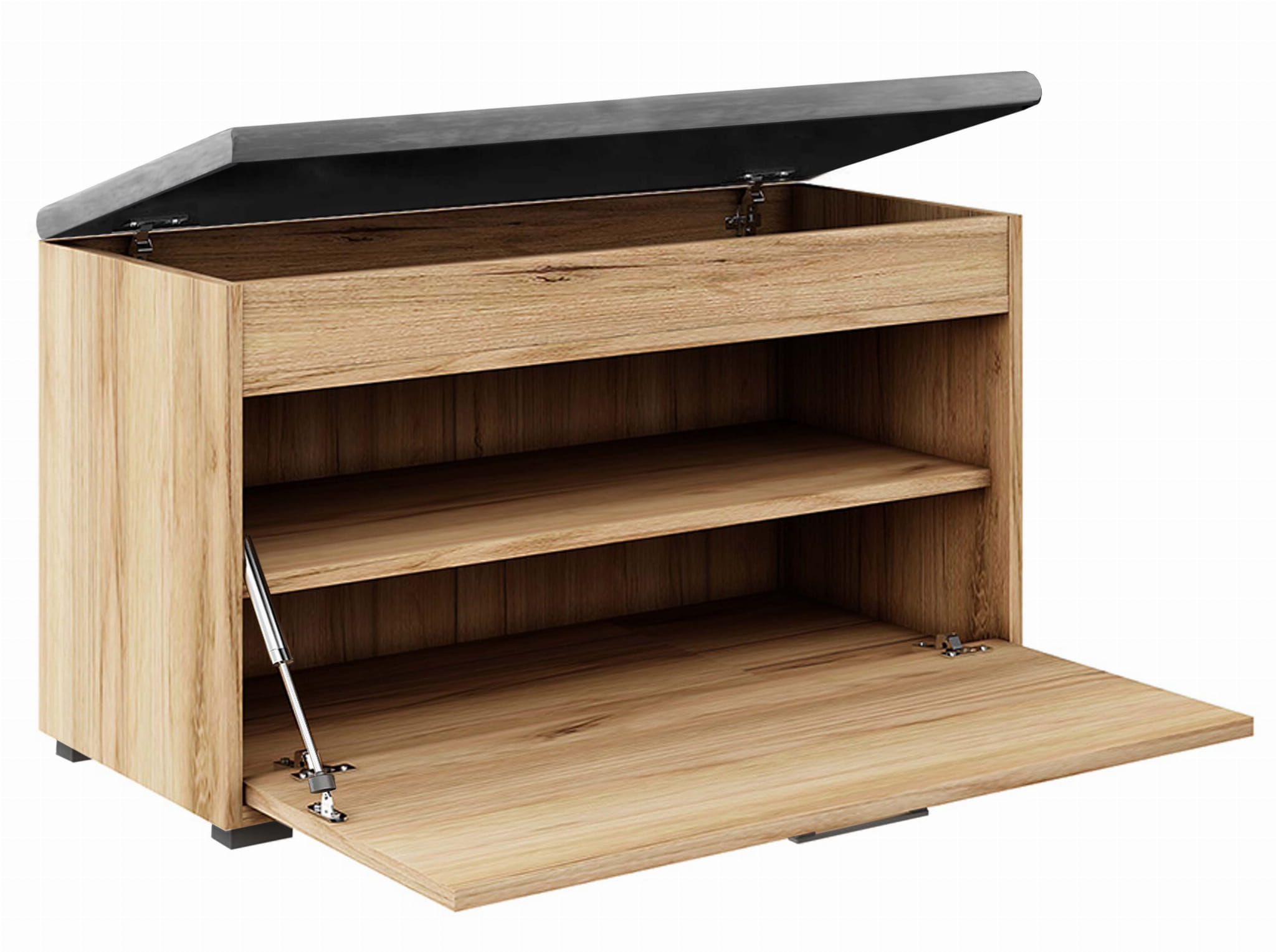 Szafka na buty Fala 1W, to idealna propozycja do każdego przedpokoju. Pojemna szafka przedzielona jest wewnątrz półką, dzięki czemu schowasz do niej więcej par butów. Pod siedziskiem ukryty jest schowek, w którym możesz przechowywać np. parasol, klucze, smycz dla psa itp. Siedzisko wykonane jest z wysokiej jakości tkaniny, a wygodne otwieranie szafki zapewnią siłowniki gazowe. Aranżację przedpokoju możesz uzupełnić wysoką szafką na buty Fala 14 i wieszakiem z tej samej kolekcji.