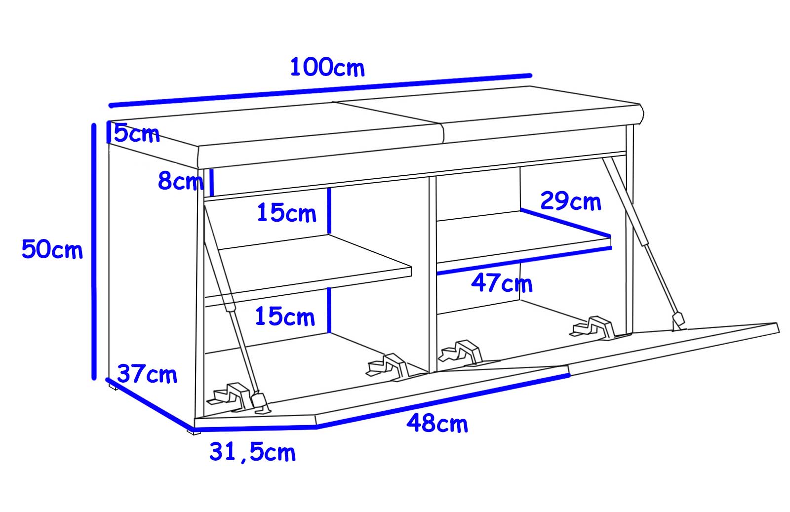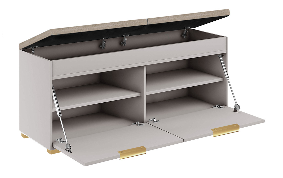 Szafka na buty Fala 3, to duża i funkcjonalna szafka, idealna do Twojego przedpokoju. Posiada dwie uchylne szafki, przedzielone wewnątrz półką. Siedzisko wykonane jest z wysokiej jakości tkaniny, a wygodne otwieranie szafki zapewnią siłowniki gazowe. Szerokie i bardzo wygodne siedzisko sprawi, że poczujesz się bardzo komfortowo. Dodatkową zaletą szafki jest ukryty pod siedziskiem schowek, w którym pomieścisz wszystkie przedmioty, które warto mieć "pod ręką" przy wyjściu z domu np. klucze, parasol, smycz dla czworonoga. Szafka posiada modne i eleganckie uchwyty i stopki w kolorze złotym szczotkowanym.