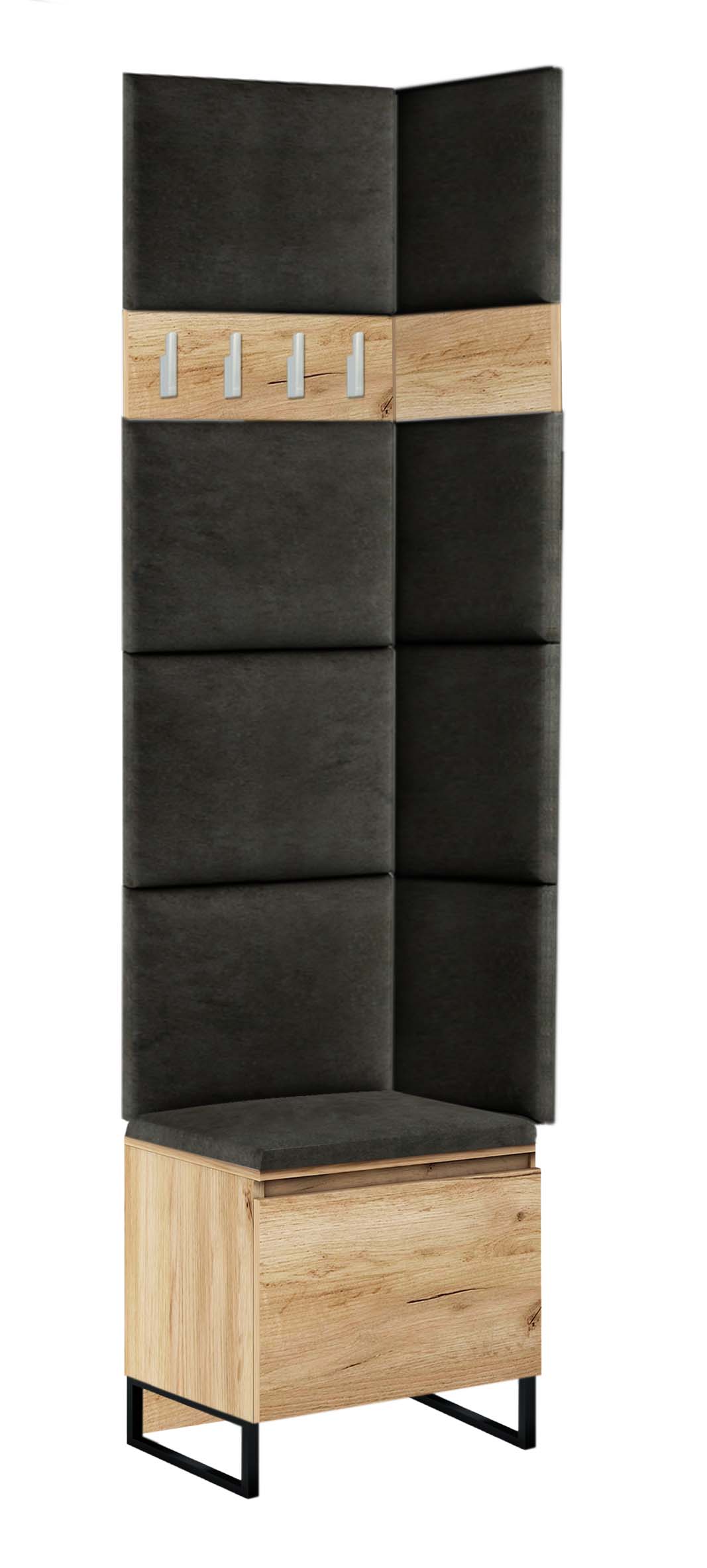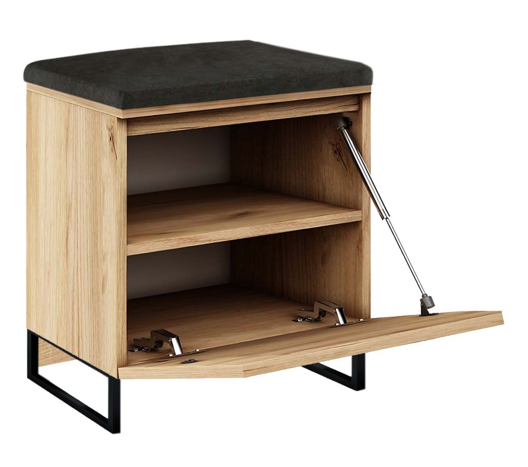 Szafka na buty Megan 1P , to nowoczesne wzornictwo i najwyższa jakość wykonania. Siedzisko wykonane jest z wysokiej jakości welurowej tkaniny tapicerskiej, a wygodne otwieranie szafki zapewniają siłowniki gazowe. Szafka posiada metalowe nogi o wysokości 12 cm (malowane proszkowo w kolorze czarnym), wzmocnione w tylnej części czarną płytą meblową. Do szafki można dopasować panele ścienne, wieszaki i komody, tworząc własną aranżację przedpokoju.