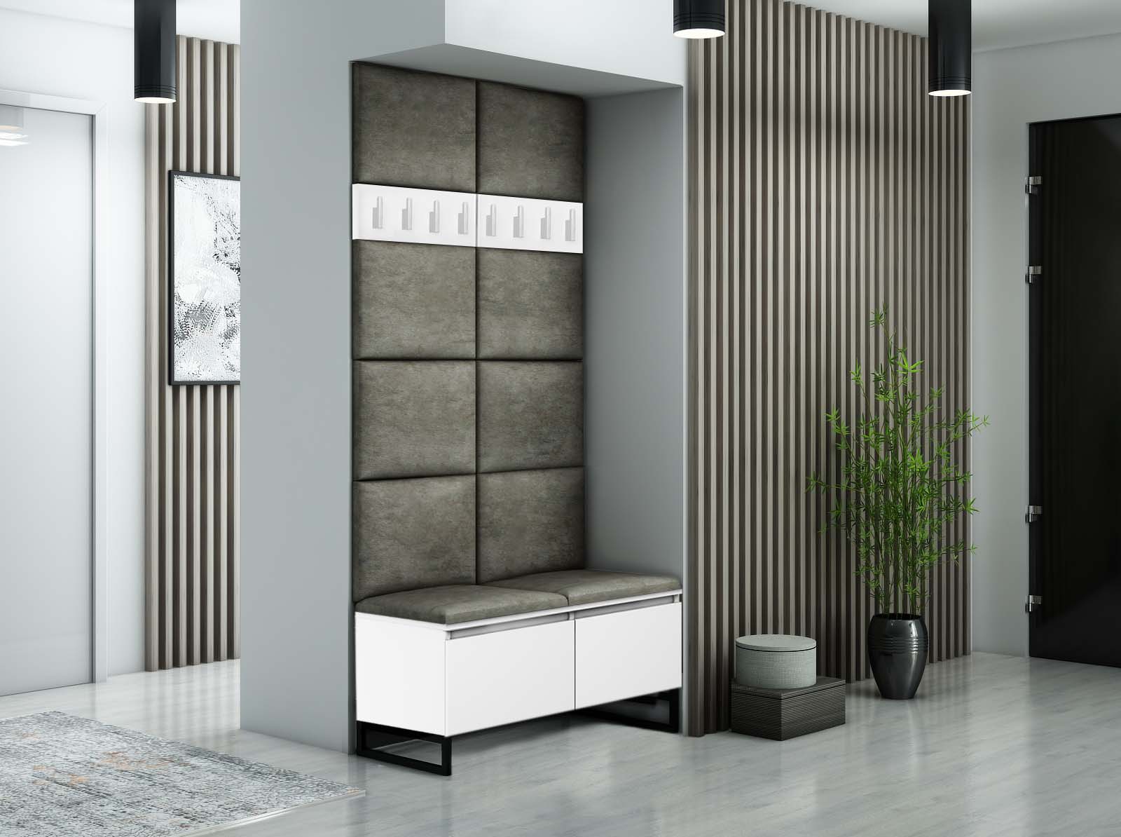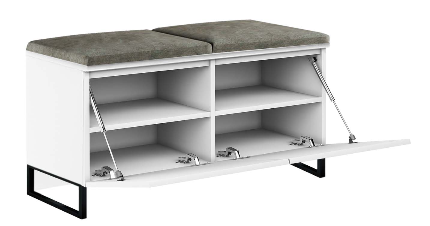 Szafka na buty Megan 2P , to nowoczesne wzornictwo i najwyższa jakość wykonania. Siedzisko wykonane jest z wysokiej jakości welurowej tkaniny tapicerskiej, a wygodne otwieranie szafki zapewniają siłowniki gazowe. Szafka posiada metalowe nogi o wysokości 12 cm (malowane proszkowo w kolorze czarnym), wzmocnione w tylnej części czarną płytą meblową. Do szafki można dopasować panele ścienne, wieszaki i komody, tworząc własną aranżację przedpokoju.