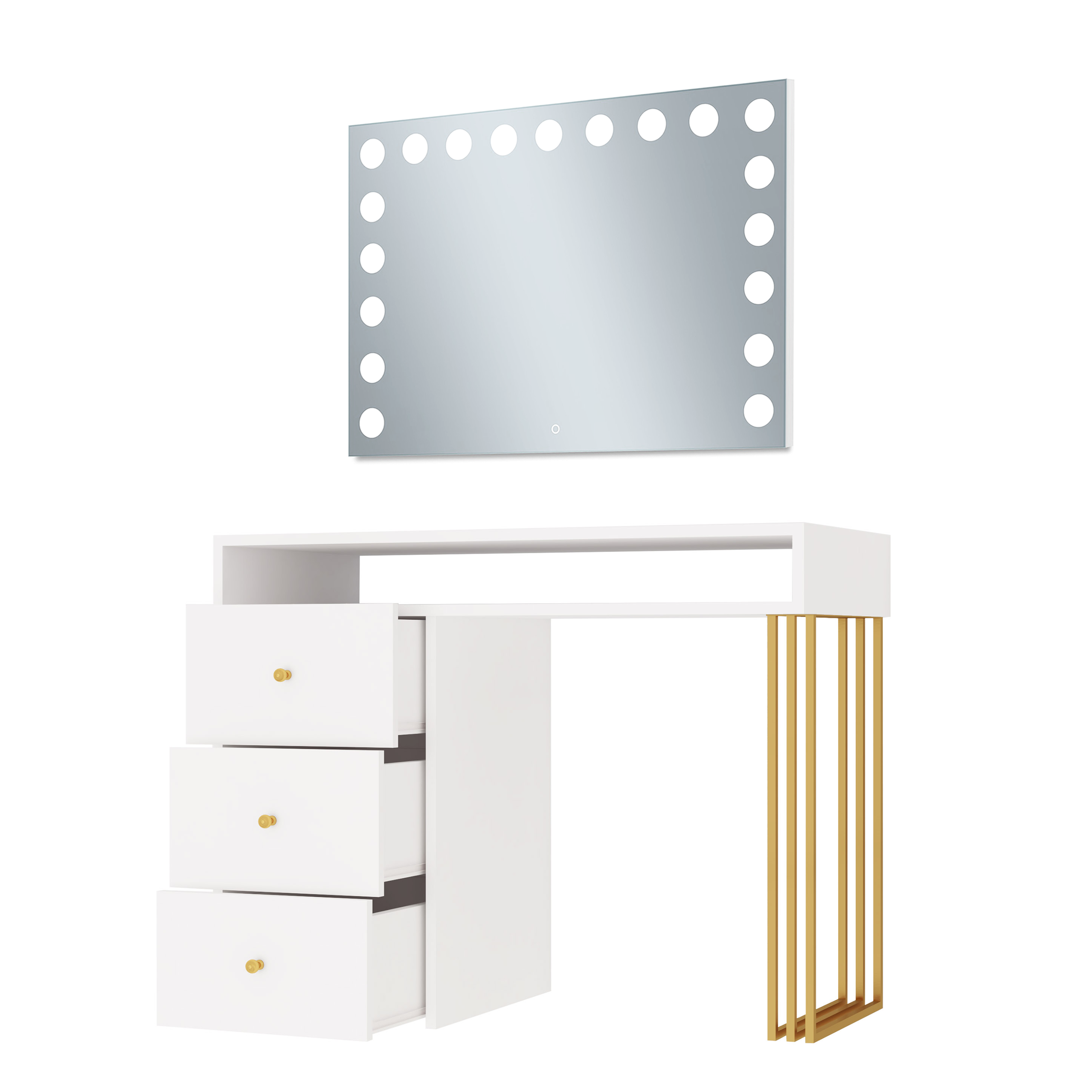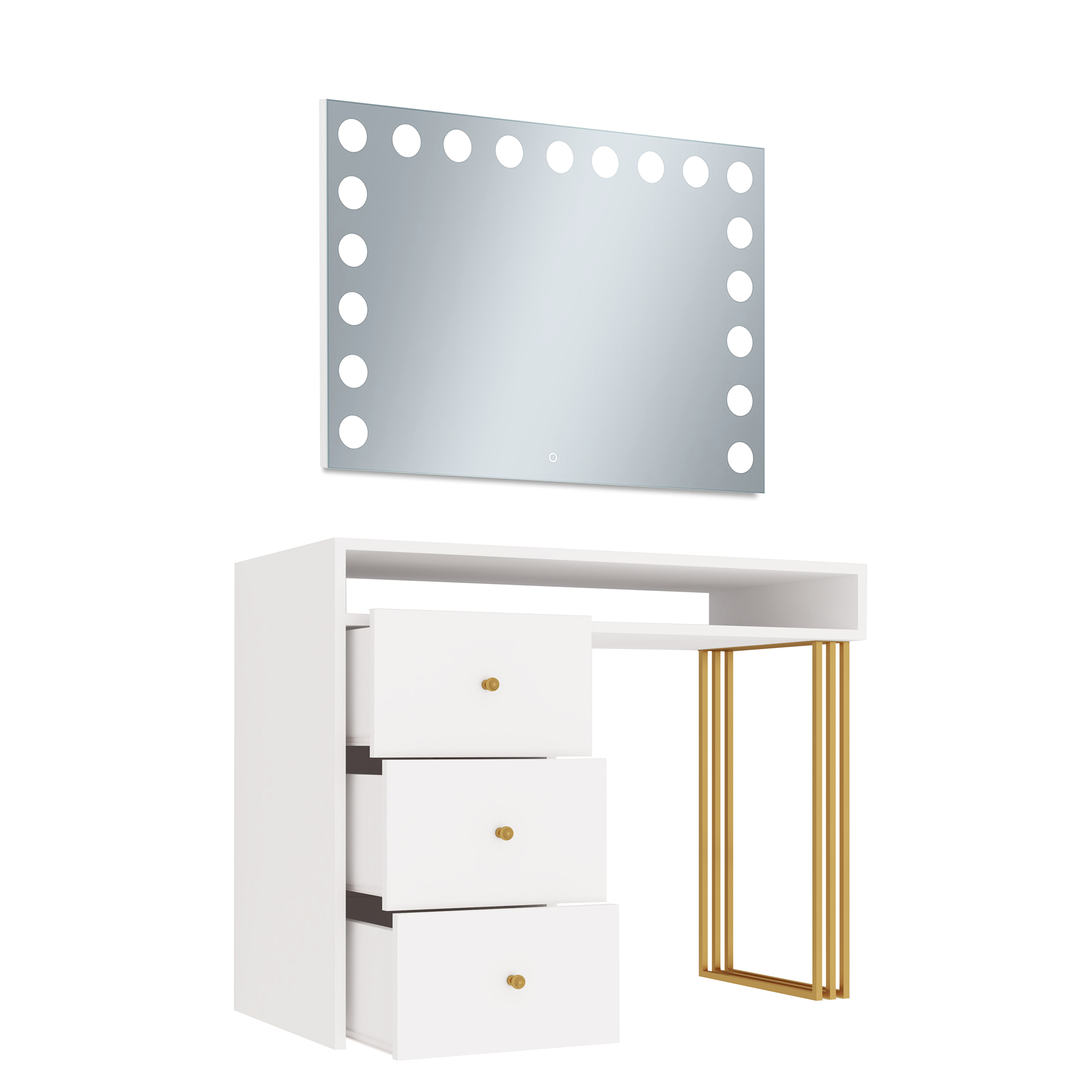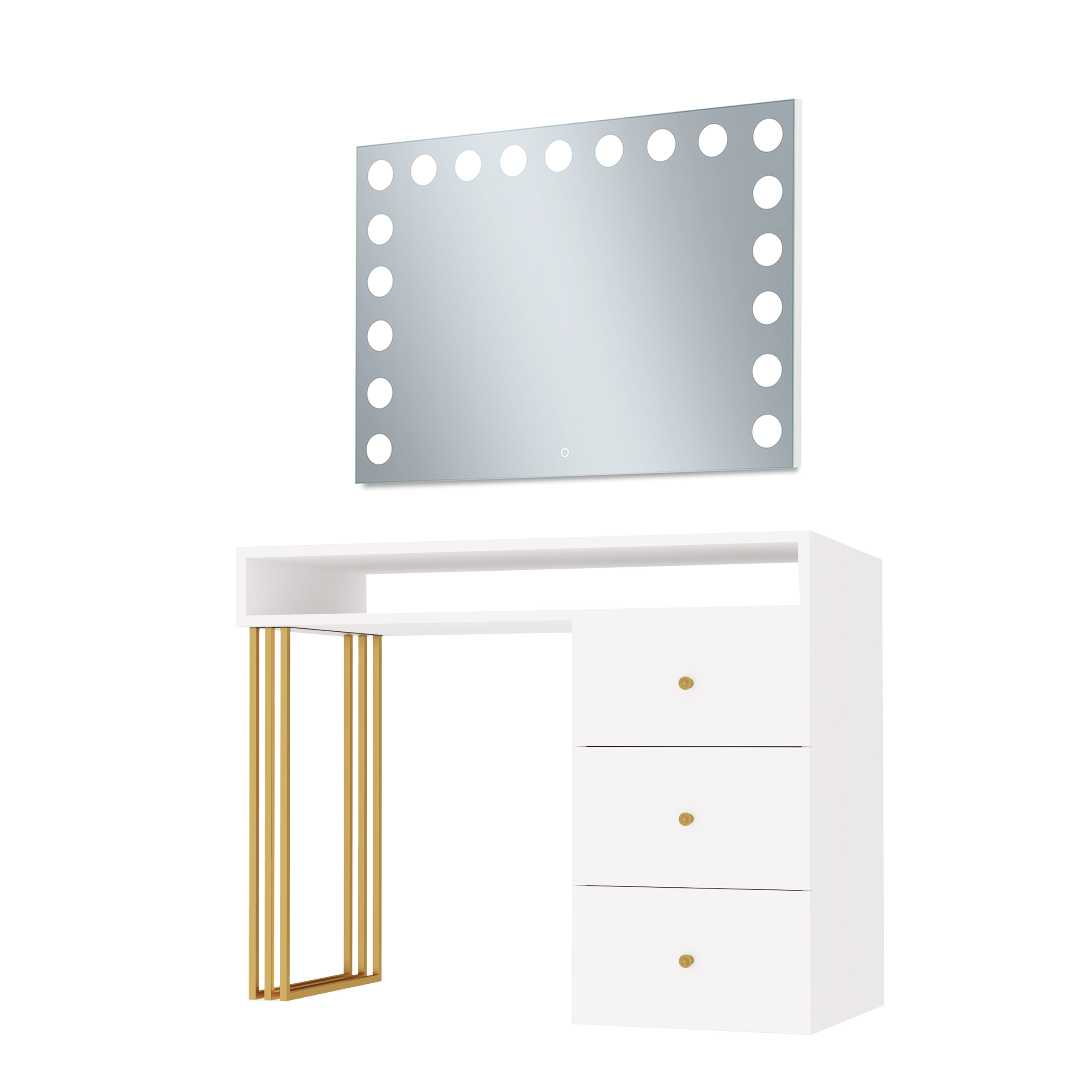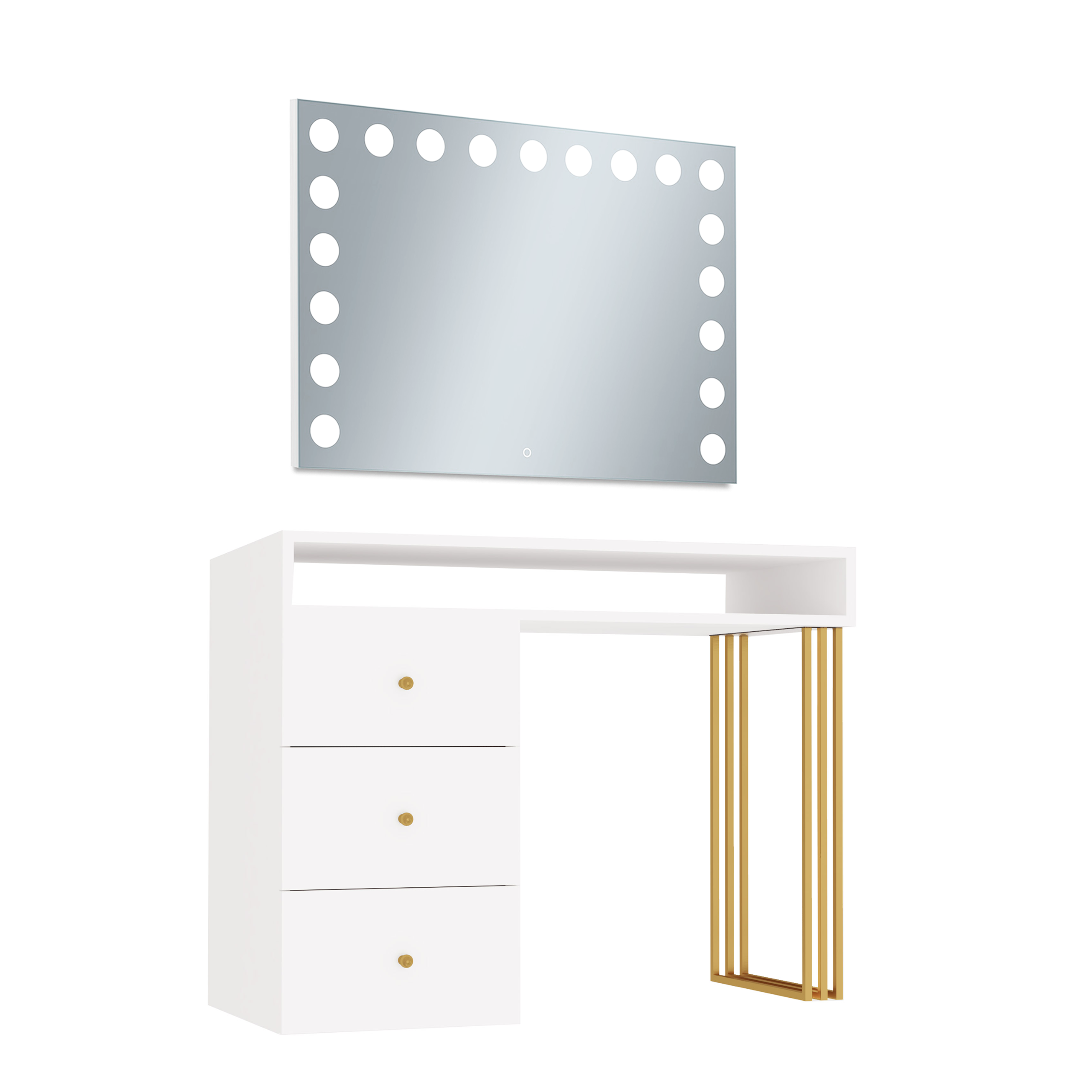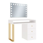 Toaletka Klara Visage na metalowych nogach. Wykonana jest z płyty meblowej w kolorze biały mat. Złote nogi i uchwyty pięknie podkreślają kolor mebla. Doskonale pasuje do wnętrz nowoczesnych, w stylu glamour i art deco. Toaletka z trzema szufladami i otwartym schowkiem pod blatem zapewni wiele miejsca do przechowywania. Dzięki wbudowanemu w lustrze oświetleniu Super Led, światło rozkłada się równomiernie, co zapewnia perfekcyjne oświetlenie twarzy podczas wykonywania makijażu. Aluminiowa rama lustra nadaje toaletce elegancji i szyku. Dotykowy włącznik posiada funkcję regulacji jasności światła. Meble z sytemu Klara to najmodniejszy design i gwarancja najwyższej jakości wykonania.