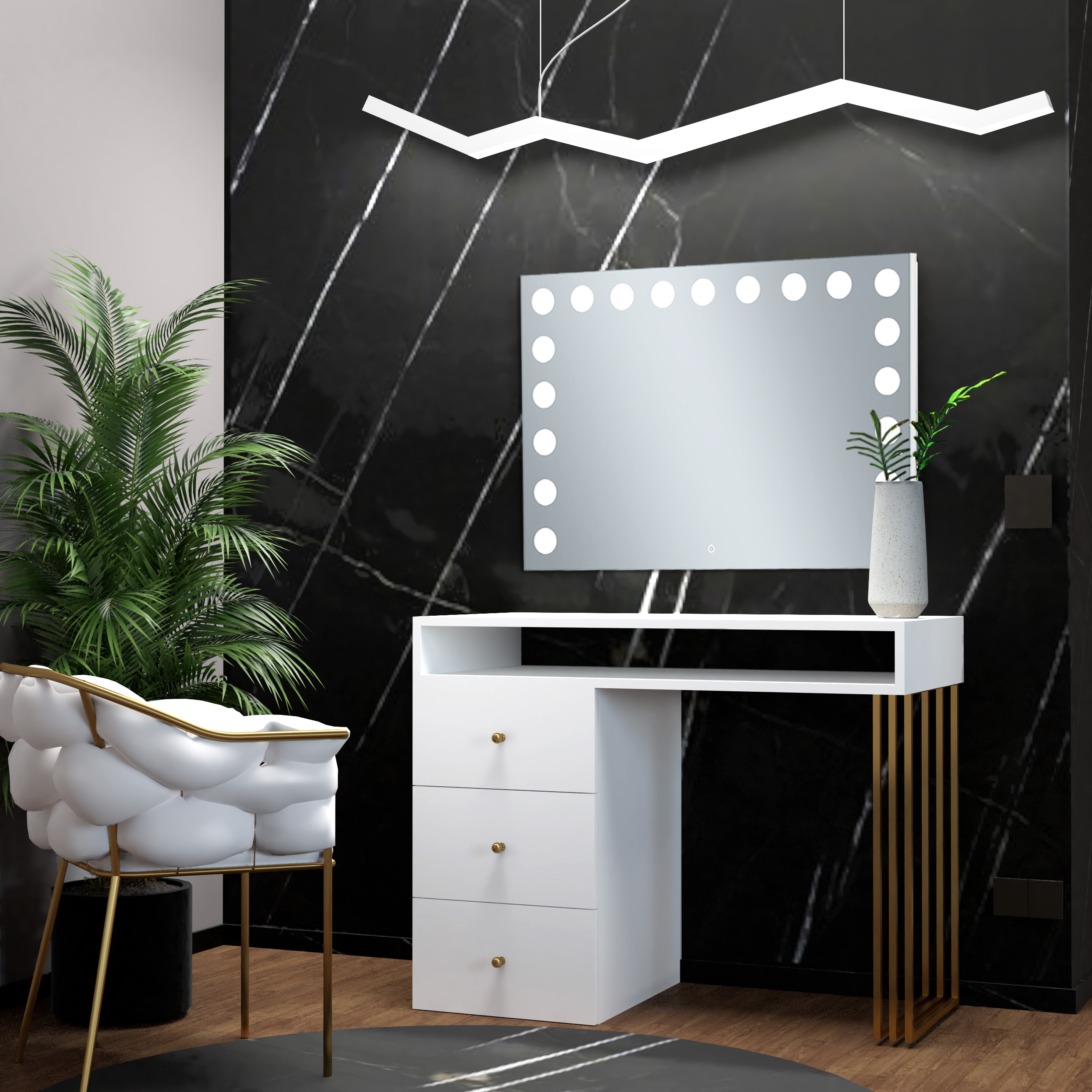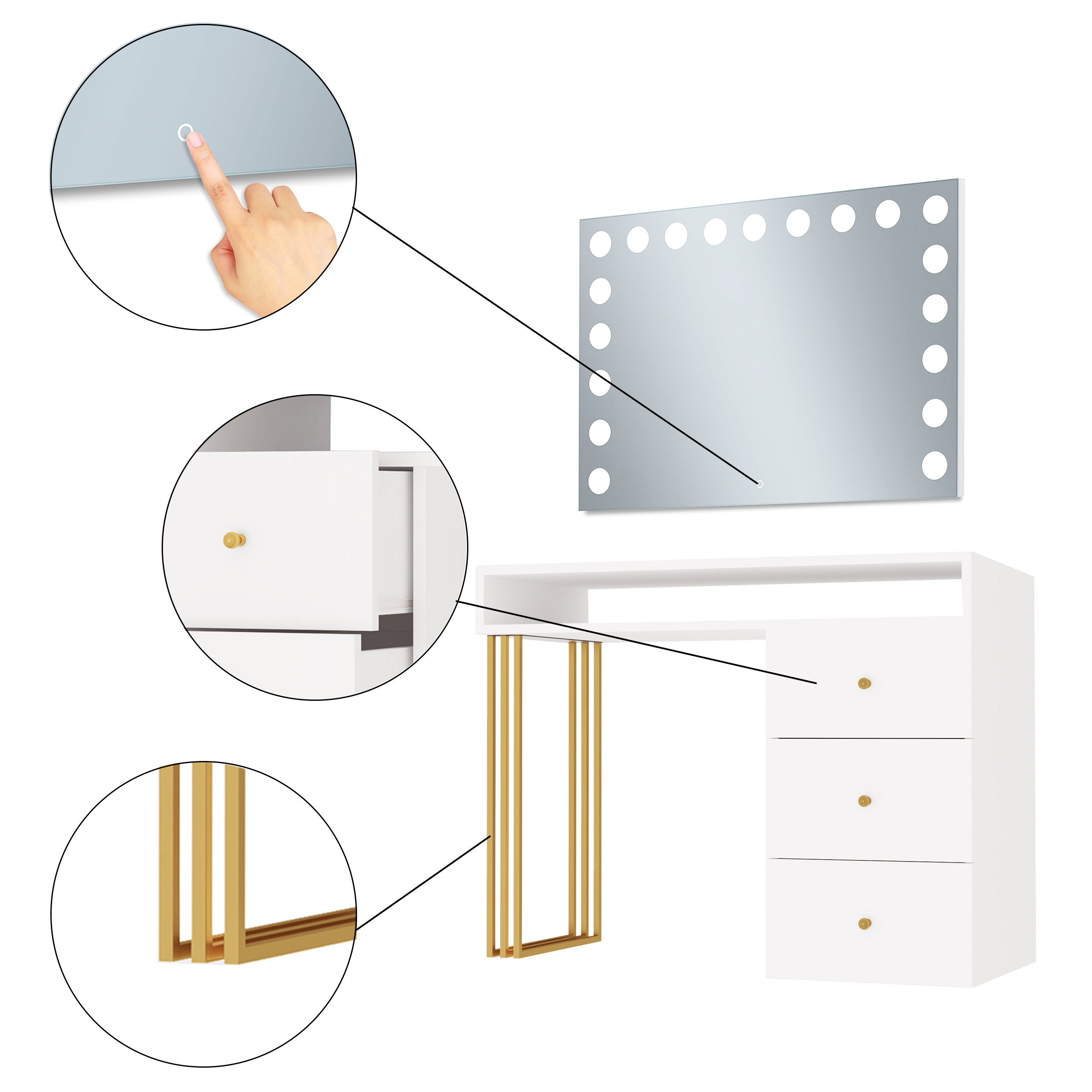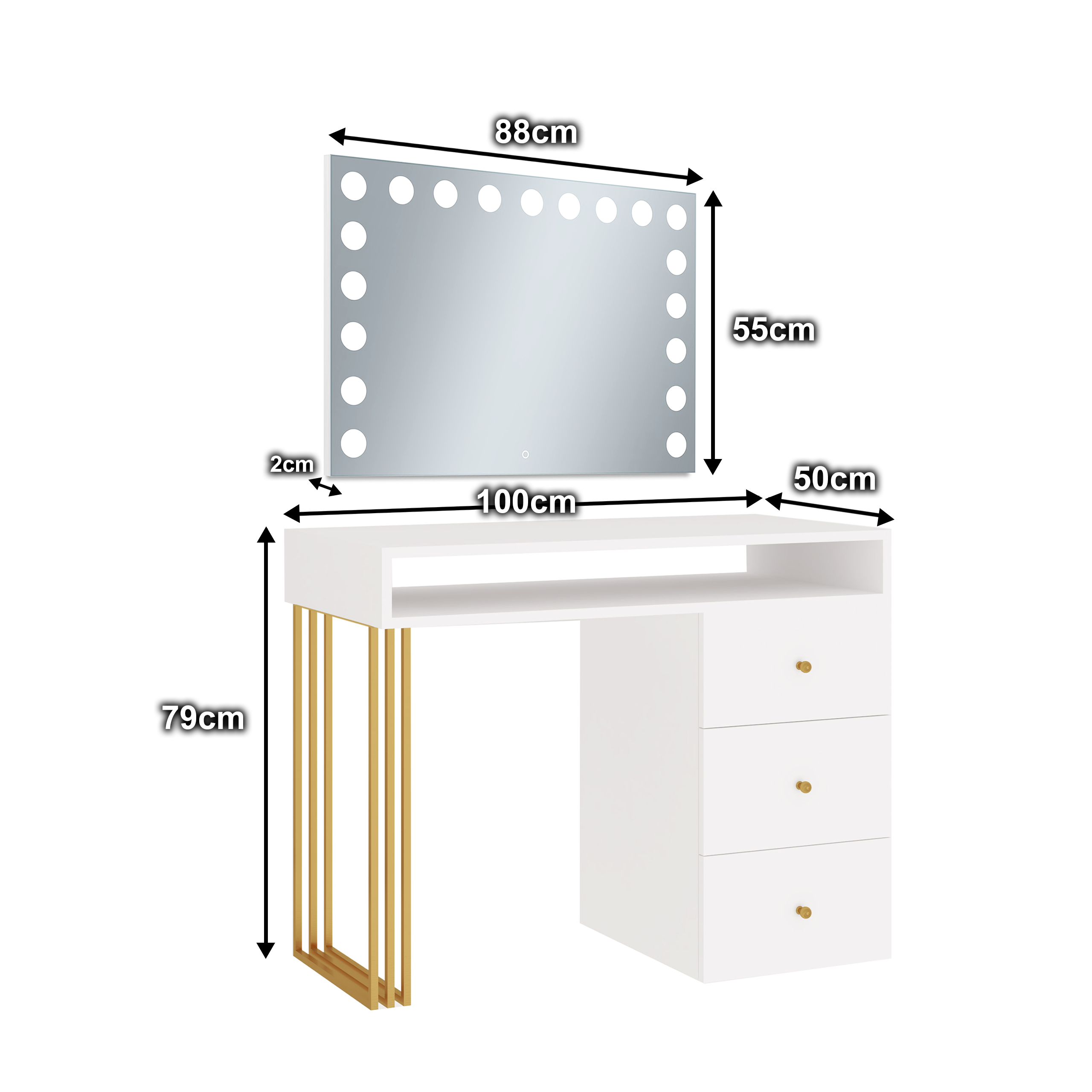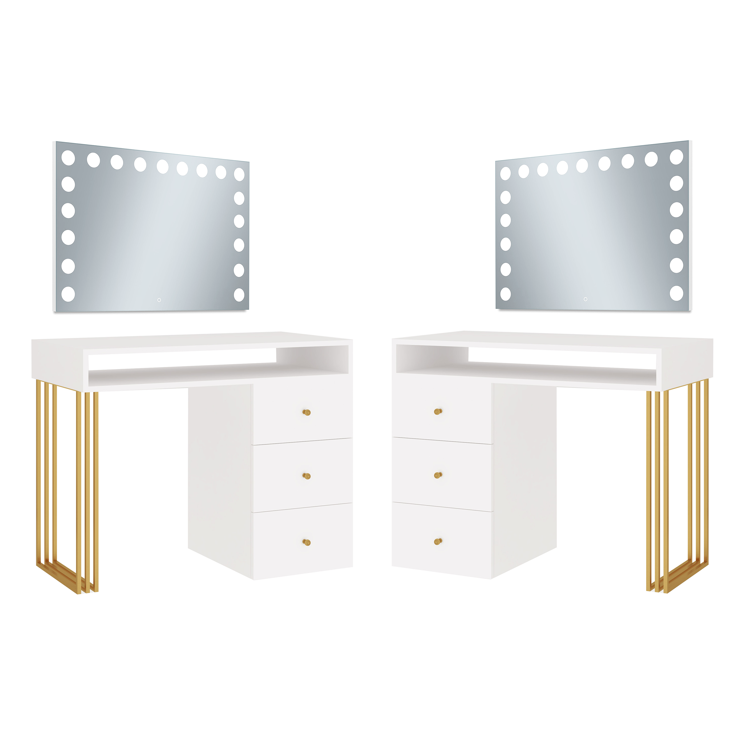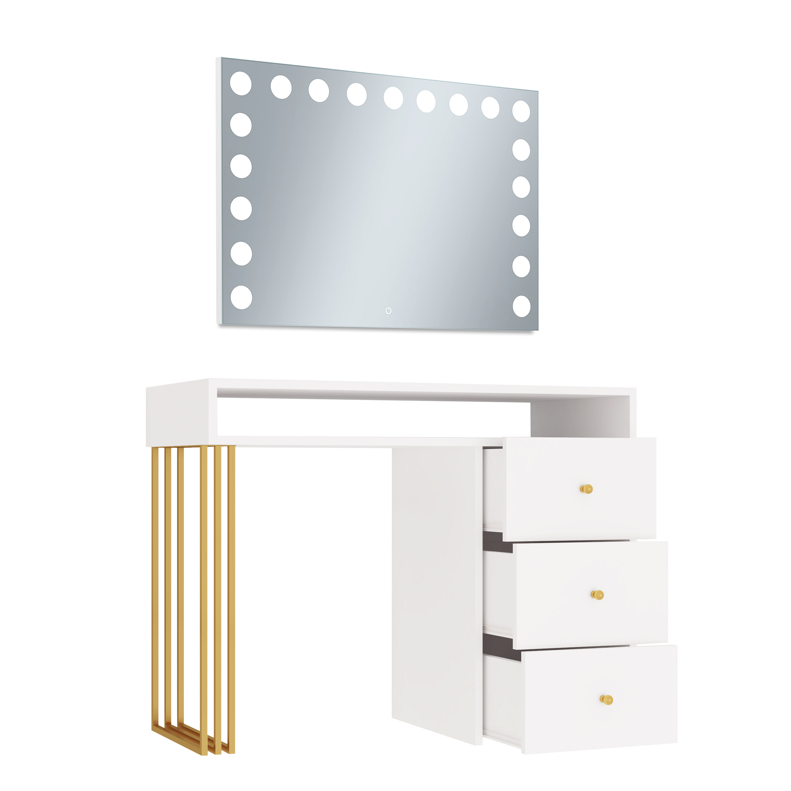Toaletka Klara Visage na metalowych nogach. Wykonana jest z płyty meblowej w kolorze biały mat. Złote nogi i uchwyty pięknie podkreślają kolor mebla. Doskonale pasuje do wnętrz nowoczesnych, w stylu glamour i art deco. Toaletka z trzema szufladami i otwartym schowkiem pod blatem zapewni wiele miejsca do przechowywania. Dzięki wbudowanemu w lustrze oświetleniu Super Led, światło rozkłada się równomiernie, co zapewnia perfekcyjne oświetlenie twarzy podczas wykonywania makijażu. Aluminiowa rama lustra nadaje toaletce elegancji i szyku. Dotykowy włącznik posiada funkcję regulacji jasności światła. Meble z sytemu Klara to najmodniejszy design i gwarancja najwyższej jakości wykonania.