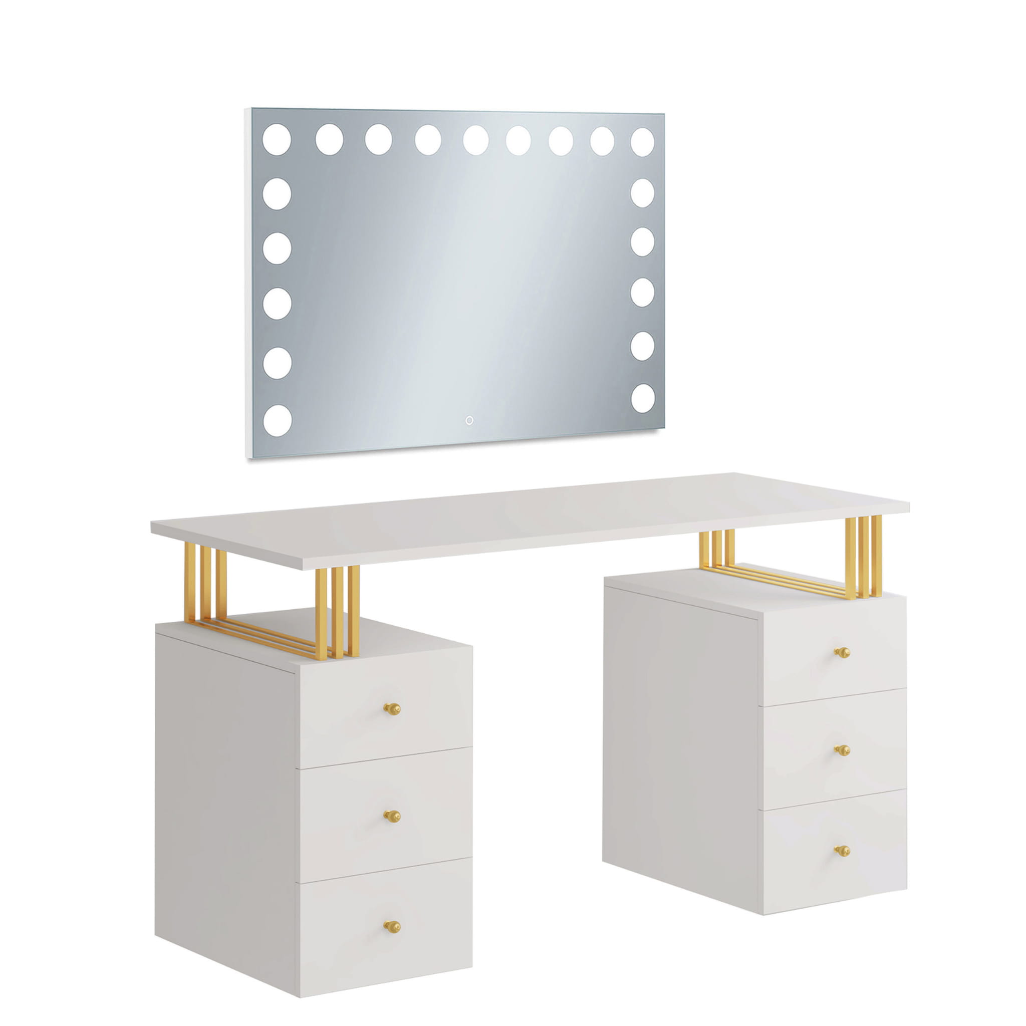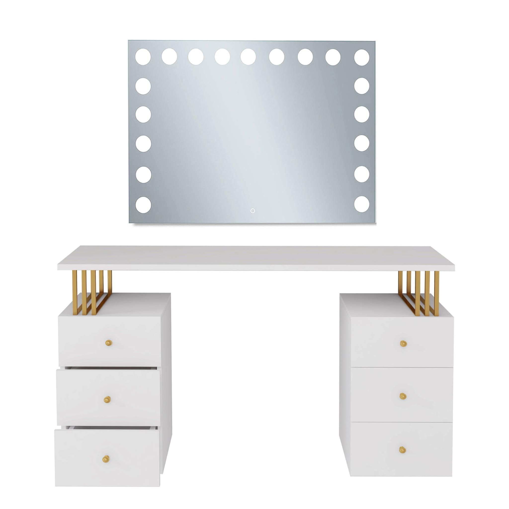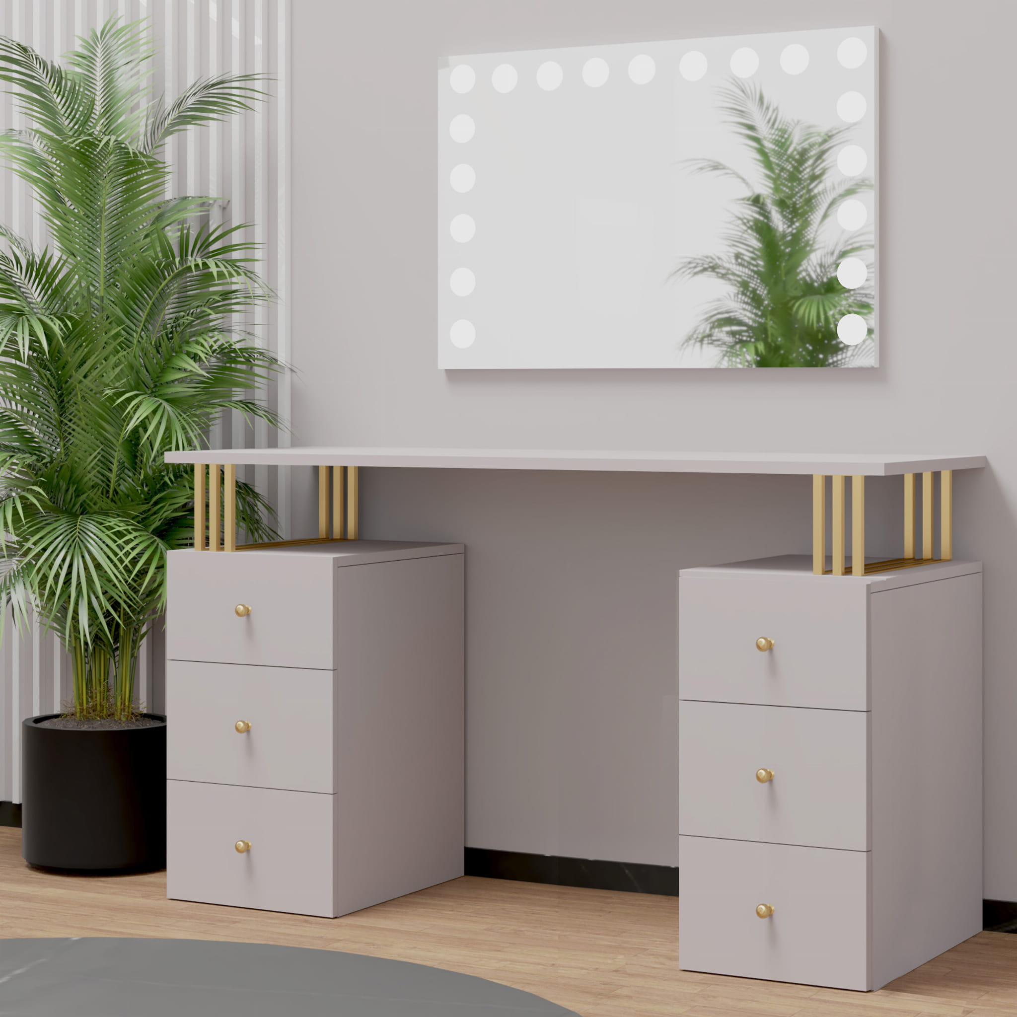 Toaletka Klara 6S z lustrem VISAGE to niezbędny mebel dla każdej kobiety. Idealne miejsce do wykonania makijażu i fryzury. Wykonana jest z płyty meblowej w kolorze kaszmir (beż). Złote nogi i uchwyty pięknie podkreślają kolor mebla. Doskonale pasuje do wnętrz nowoczesnych, w stylu glamour i art deco. Toaletka z sześcioma szufladkami zapewni wiele miejsca do przechowywania. Dzięki wbudowanemu w lustrze oświetleniu Super Led, światło rozkłada się równomiernie, co zapewnia perfekcyjne oświetlenie twarzy podczas wykonywania makijażu. Aluminiowa rama lustra nadaje toaletce elegancji i szyku. Dotykowy włącznik posiada funkcję regulacji jasności światła. Meble z sytemu Klara to najmodniejszy design i gwarancja najwyższej jakości wykonania.