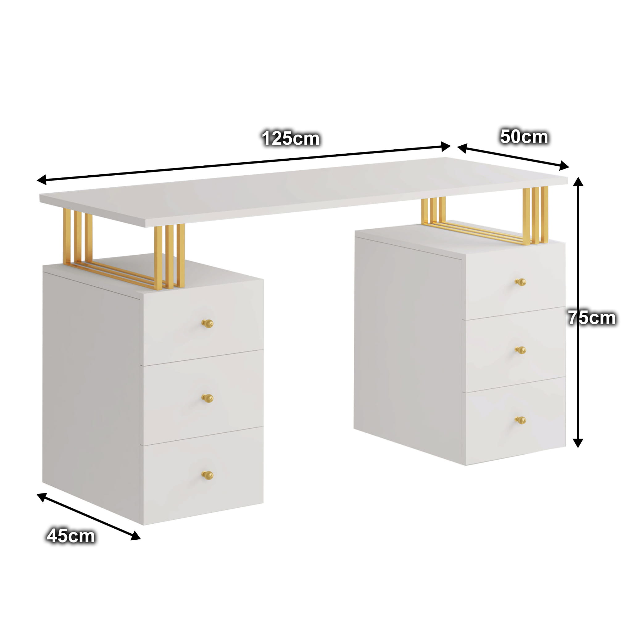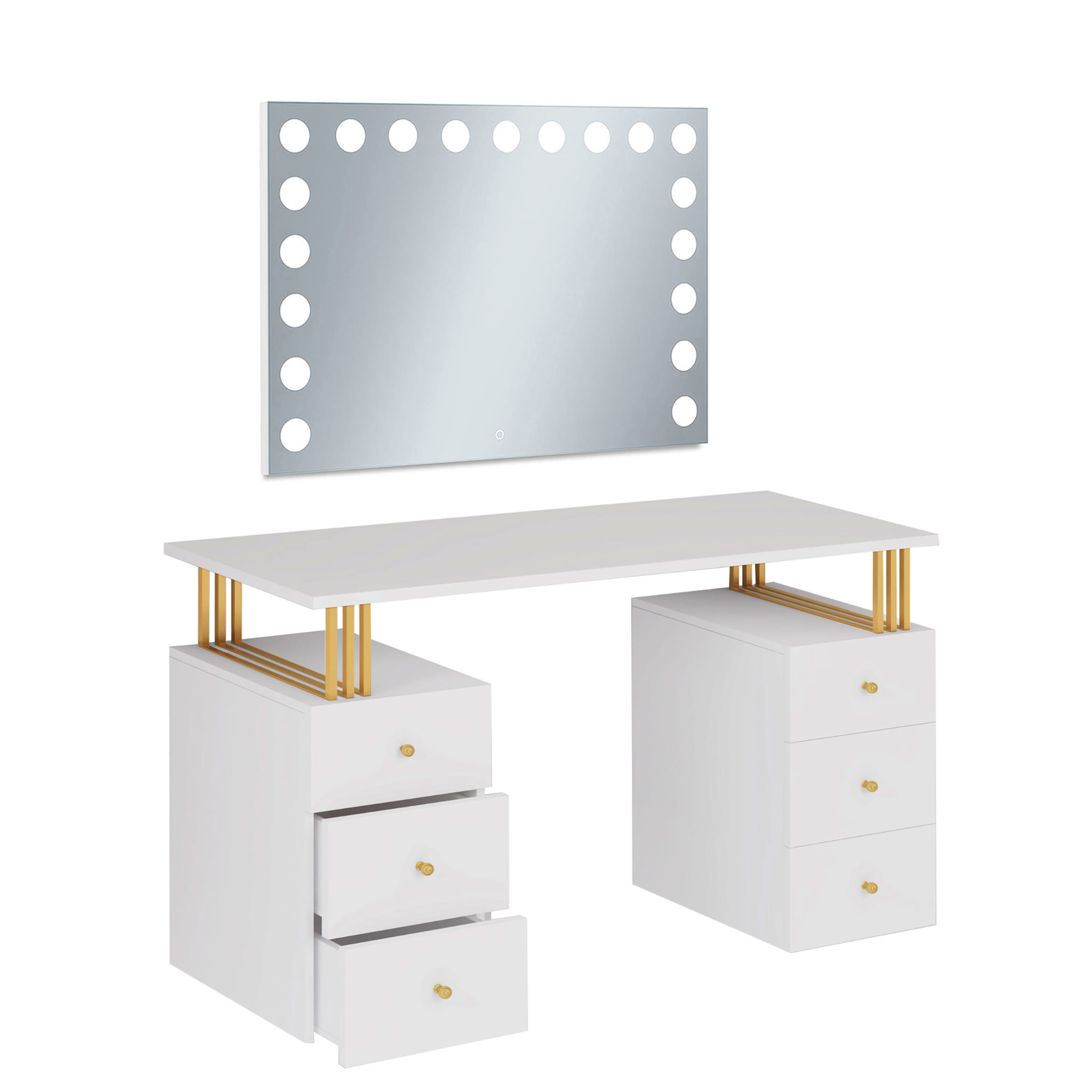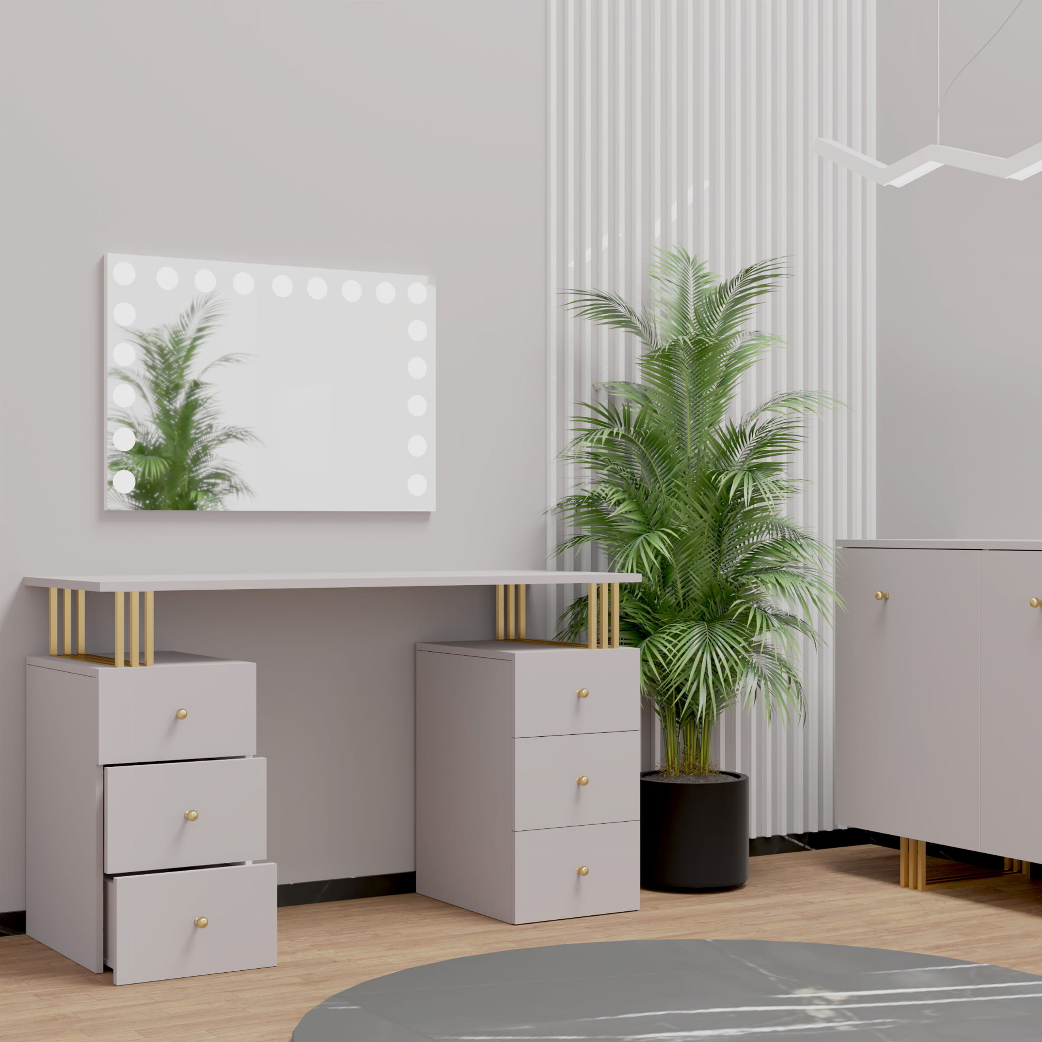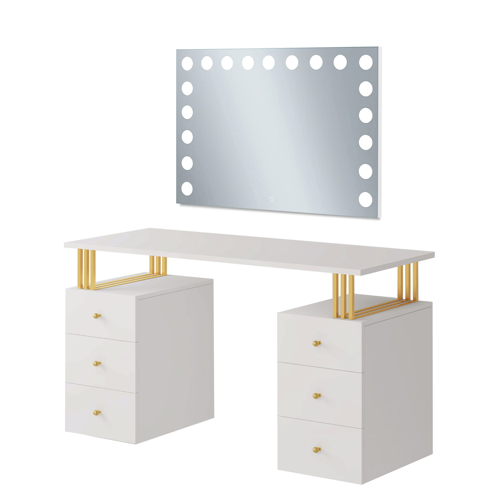 Toaletka Klara 6S z lustrem VISAGE to niezbędny mebel dla każdej kobiety. Idealne miejsce do wykonania makijażu i fryzury. Wykonana jest z płyty meblowej w kolorze kaszmir (beż). Złote nogi i uchwyty pięknie podkreślają kolor mebla. Doskonale pasuje do wnętrz nowoczesnych, w stylu glamour i art deco. Toaletka z sześcioma szufladkami zapewni wiele miejsca do przechowywania. Dzięki wbudowanemu w lustrze oświetleniu Super Led, światło rozkłada się równomiernie, co zapewnia perfekcyjne oświetlenie twarzy podczas wykonywania makijażu. Aluminiowa rama lustra nadaje toaletce elegancji i szyku. Dotykowy włącznik posiada funkcję regulacji jasności światła. Meble z sytemu Klara to najmodniejszy design i gwarancja najwyższej jakości wykonania.