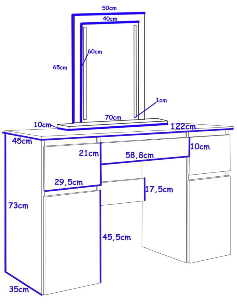 Toaletka Megan B1 z lustrem LED, to idealna propozycja dla każdej kobiety! Oświetlenie ledowe o neutralnej barwie światła, umożliwi Ci wykonanie perfekcyjnego makijażu. Dwie pojemne szafki i trzy praktyczne szufladki pomieszcza nie tylko wszystkie kosmetyki ale również biżuterię czy perfumy. Lustro jest wolnostojące, możesz zatem ustawić je w wybranym przez siebie miejscu (należy przymocować je do blatu w przypadku, gdy toaletka nie stoi bezpośrednio przy ścianie). Nie zwlekaj, stwórz swój własny kącik do makijażu i ciesz się komfortem!