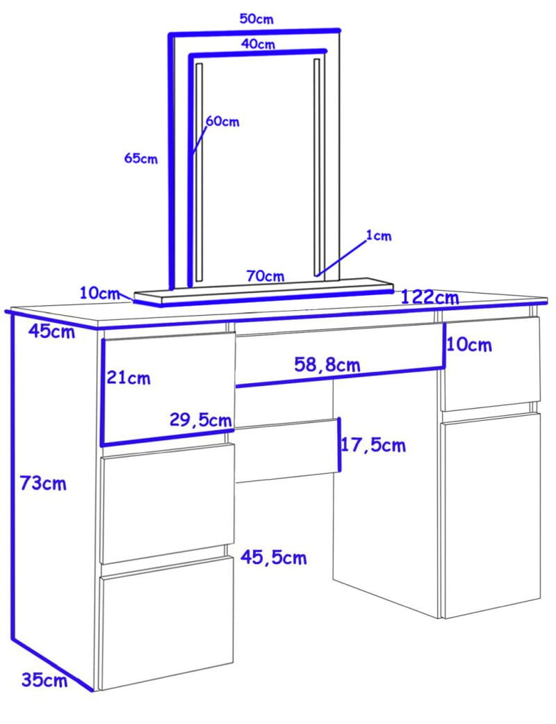 Toaletka Megan B2 z lustrem LED, to idealna propozycja dla każdej kobiety! Oświetlenie ledowe o neutralnej barwie światła, umożliwi Ci wykonanie perfekcyjnego makijażu. Pojemna szafka i pięć praktycznych szufladek pomieści nie tylko wszystkie kosmetyki, ale również biżuterię czy perfumy. Lustro jest wolnostojące, możesz zatem ustawić je w wybranym przez siebie miejscu (należy przymocować je do blatu w przypadku, gdy toaletka nie stoi bezpośrednio przy ścianie). Ty zdecydujesz, jak zmontować toaletkę! Jest bowiem uniwersalna i możesz zmontować ją na prawą lub lewą stronę. Nie zwlekaj, stwórz swój własny kącik do makijażu i ciesz się komfortem!