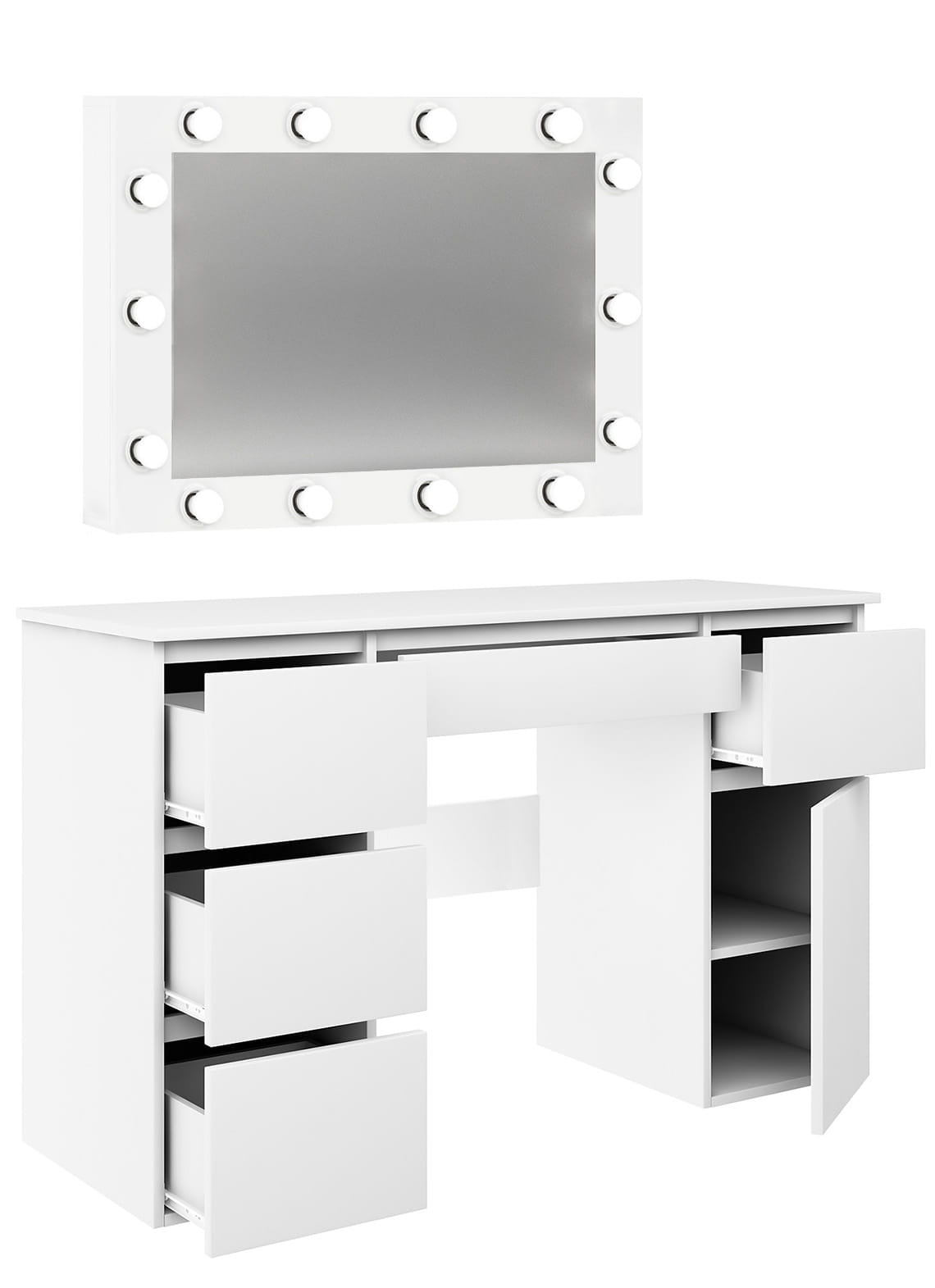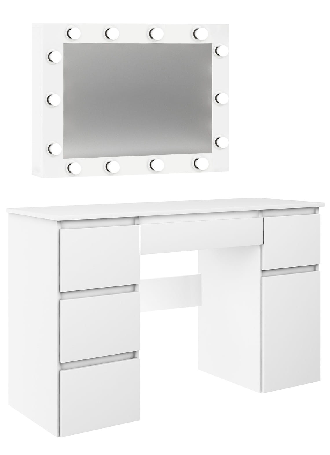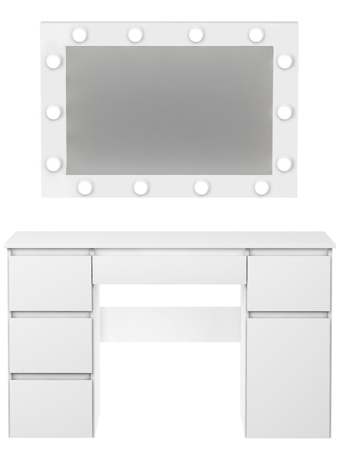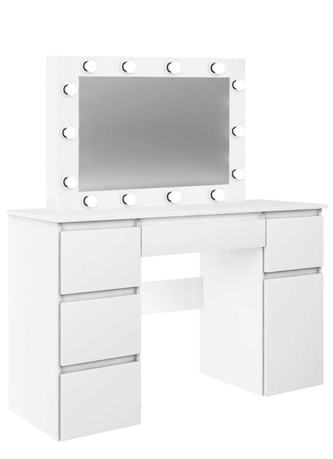 Toaletka Megan B2 z oświetleniem z czternastoma żarówkami LED, to idealna propozycja dla każdej kobiety! Pojemna szafka i pięć praktycznych szufladek pomieszczą nie tylko wszystkie kosmetyki, ale również biżuterię czy perfumy. Żarówki ledowe o neutralnej barwie światła są odpowiednio dobrane do wykonywania makijażu. Lustro można zawiesić lub postawić na blacie, co daje Ci dodatkowy sposób aranżacji. Dla Twojej wygody dół toaletki można zmontować z szafką po prawej lub po lewej stronie. Nie zwlekaj, stwórz swój własny kącik do makijażu i ciesz się komfortem!