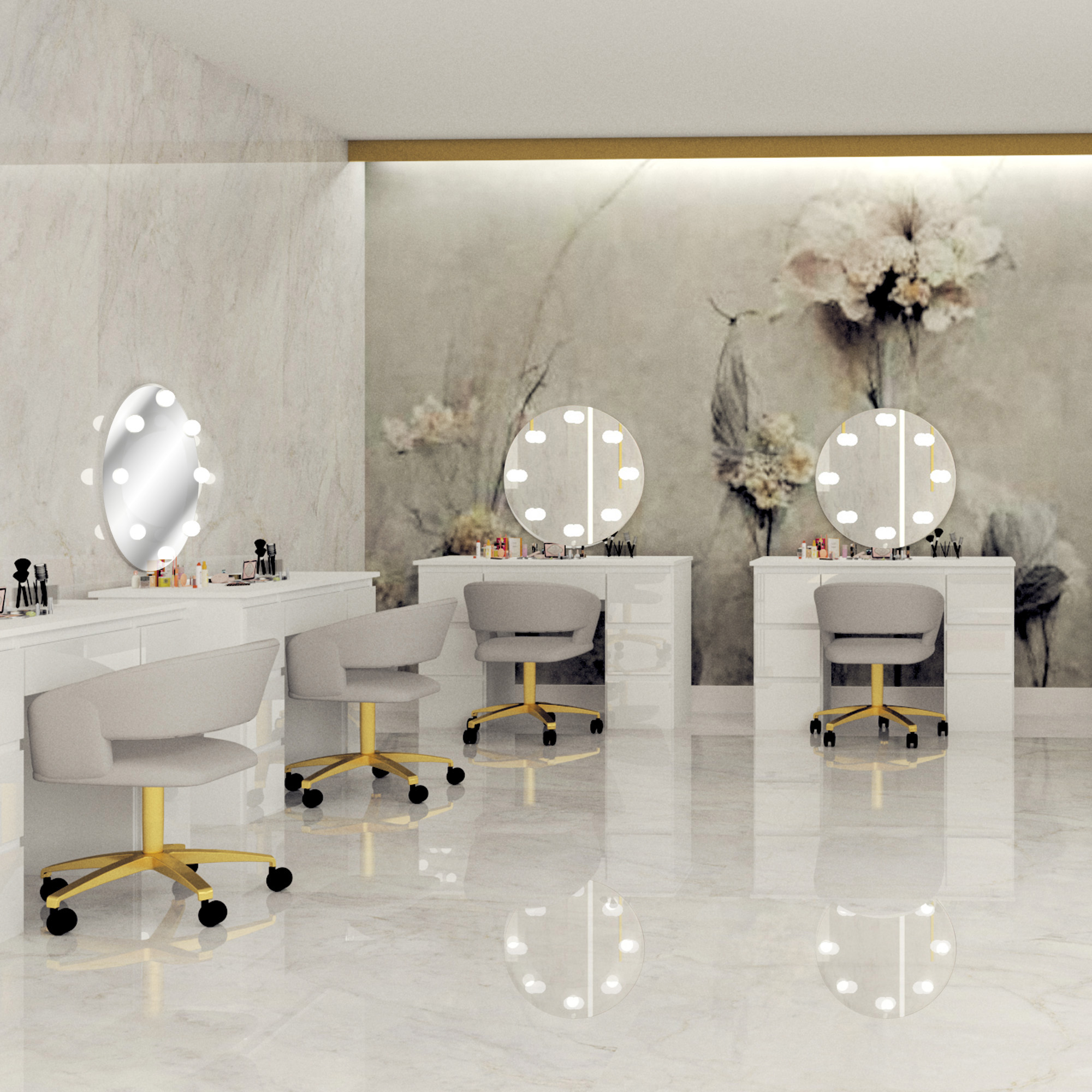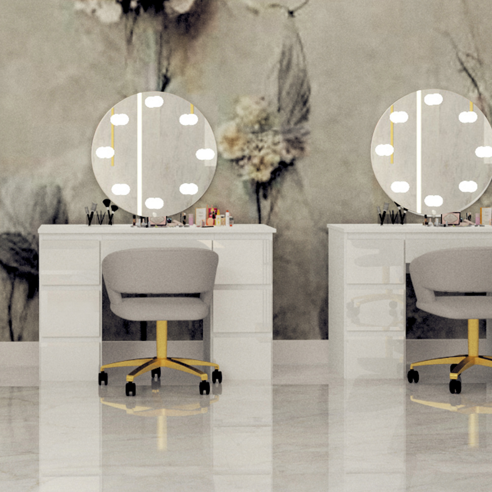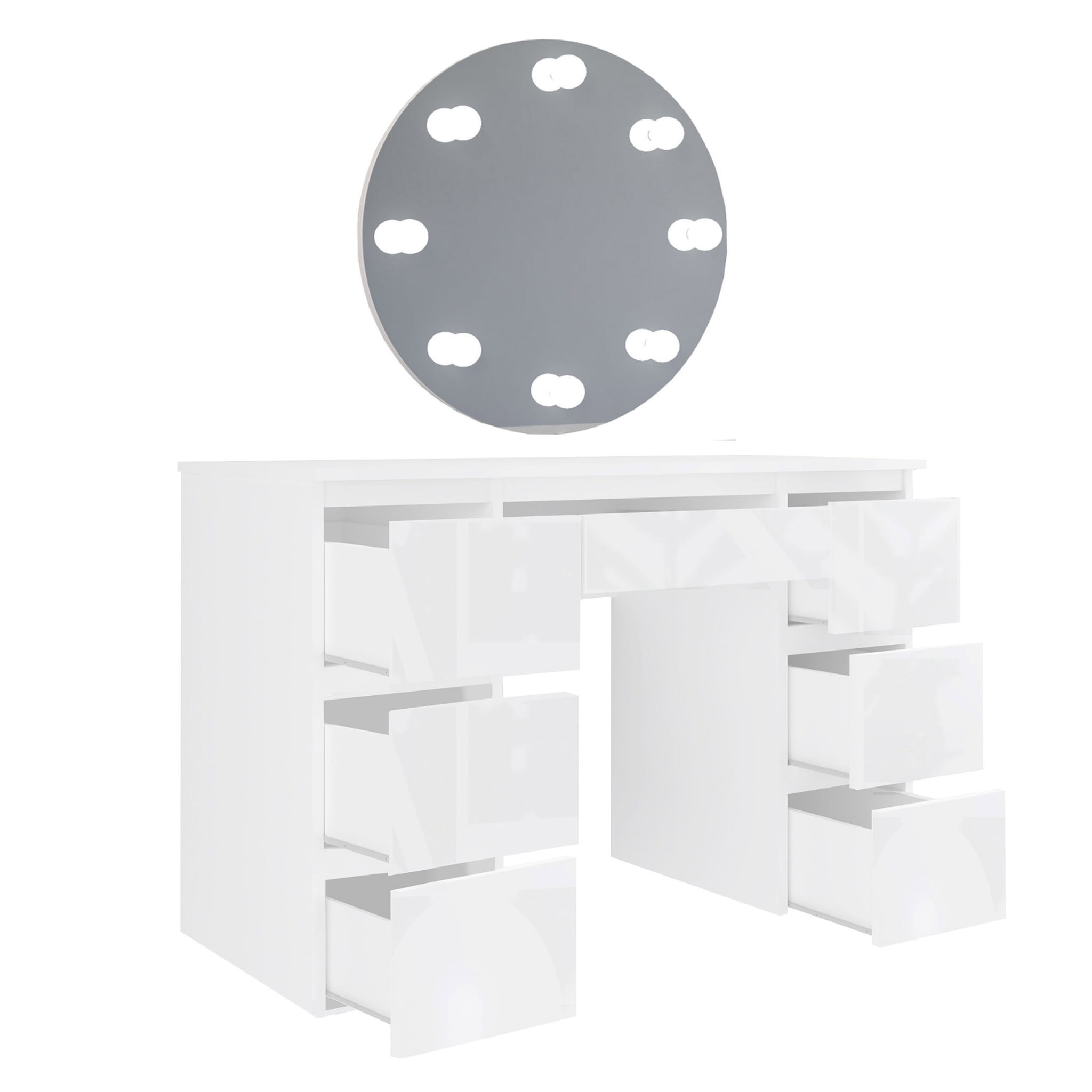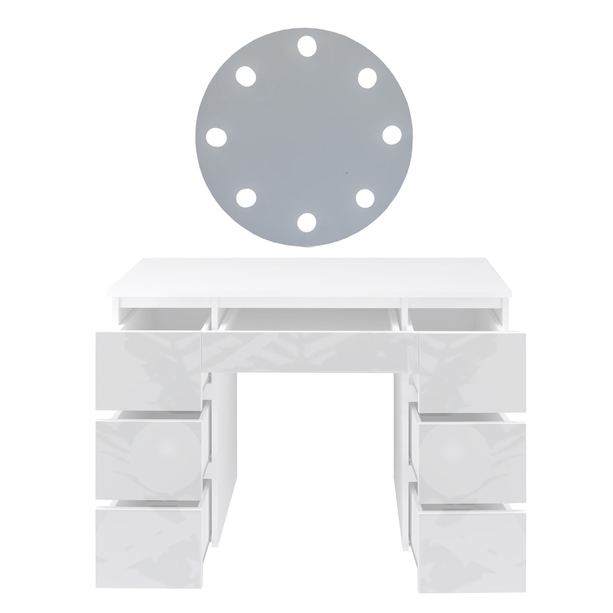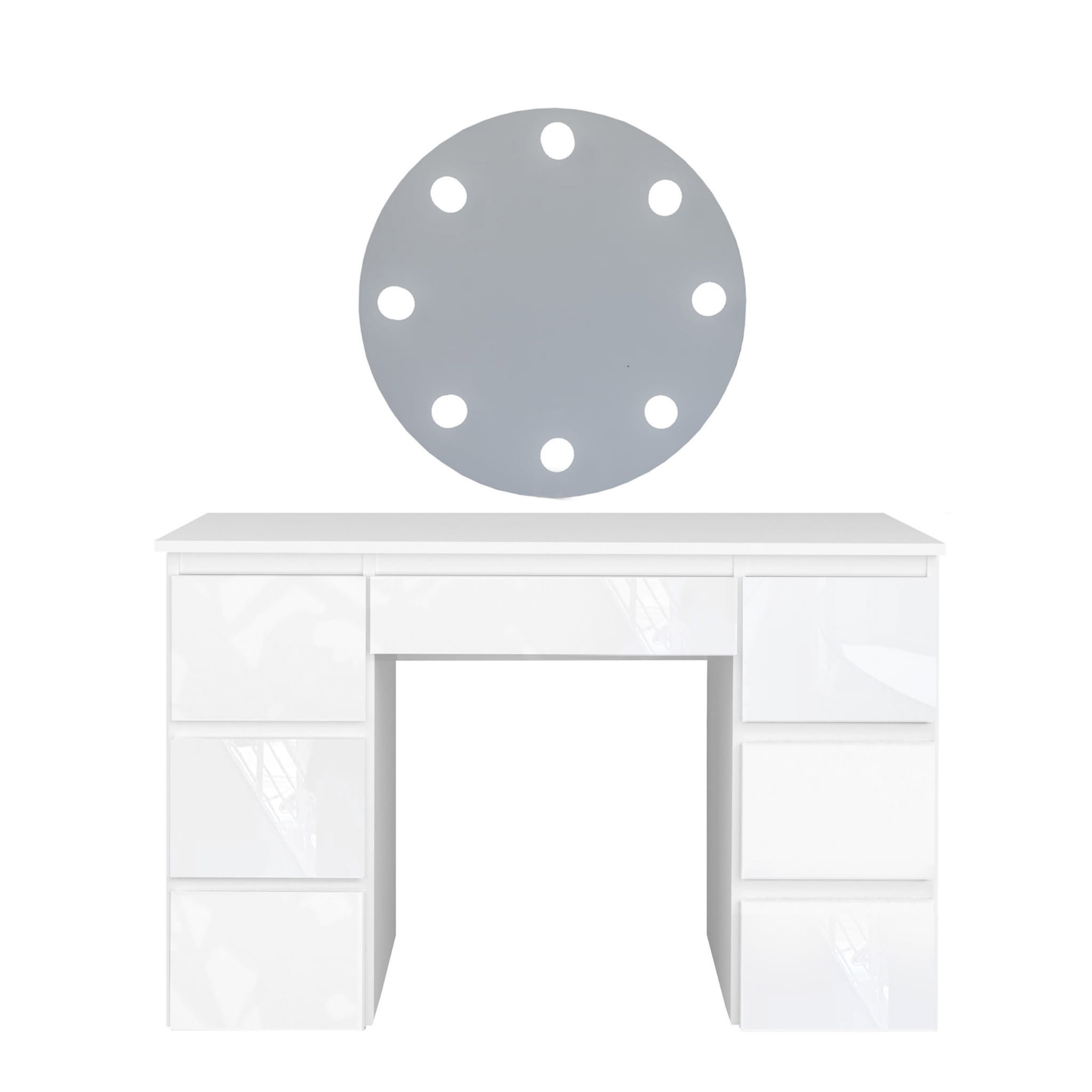 Toaletka Megan B3 z lustrem okrągłym fi 60 cm, to idealna propozycja dla każdej kobiety! Siedem praktycznych szufladek pomieści nie tylko wszystkie kosmetyki ale również biżuterię czy perfumy. Dzięki lakierowanym frontom wnętrze nabierze blasku i elegancji. Duże, okrągłe lustro z ośmioma żarówkami led o neutralnej barwie światła sprawi, że w komfortowych warunkach zadbasz o swoją urodę.