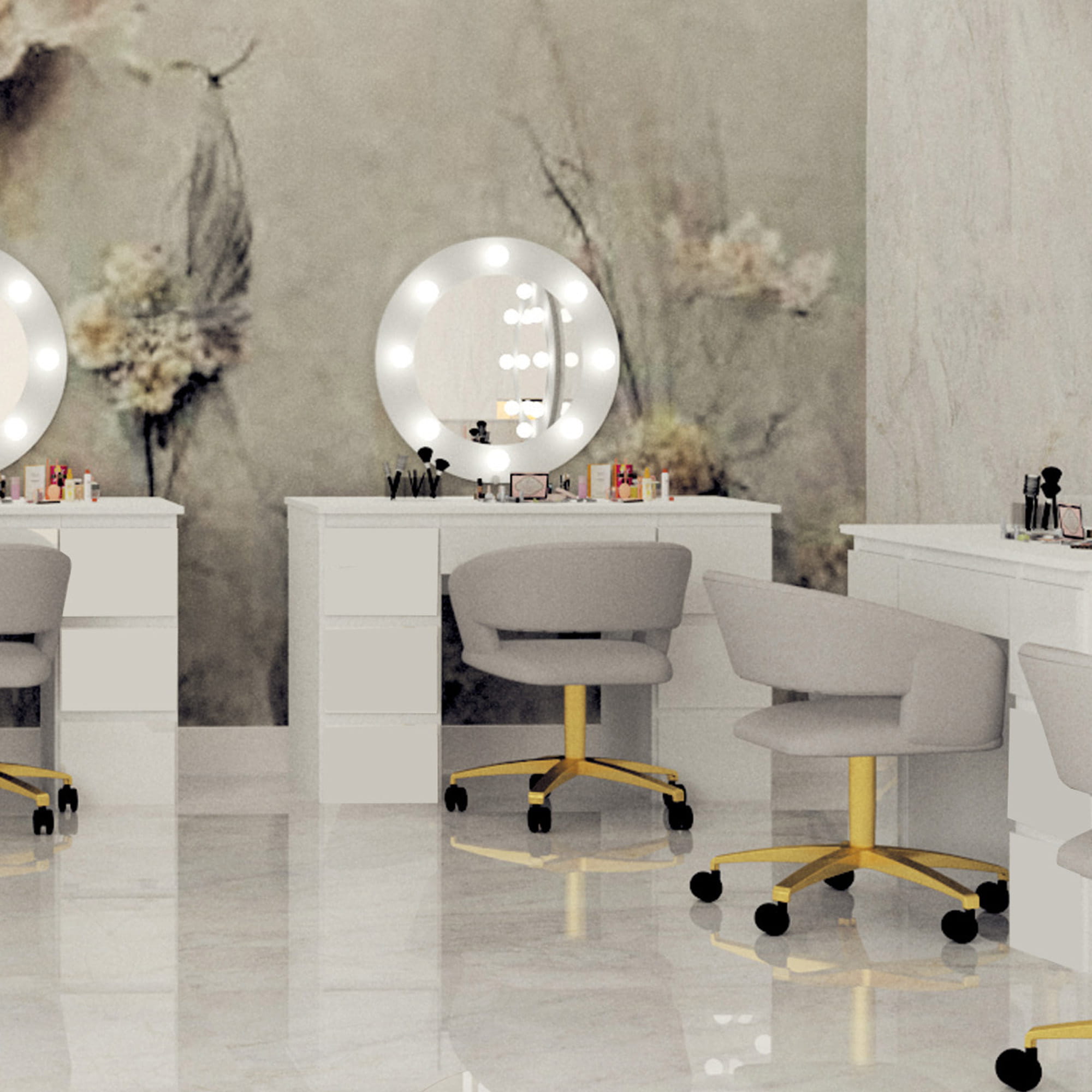 Toaletka Megan B3 z lustrem okrągłym fi 65 cm, to idealna propozycja dla każdej kobiety! Siedem praktycznych szufladek pomieszczą nie tylko wszystkie kosmetyki ale również biżuterię czy perfumy. Duże, okrągłe lustro z ośmioma żarówkami led o neutralnej barwie światła sprawi, że w komfortowych warunkach zadbasz o swoją urodę.