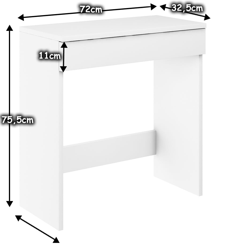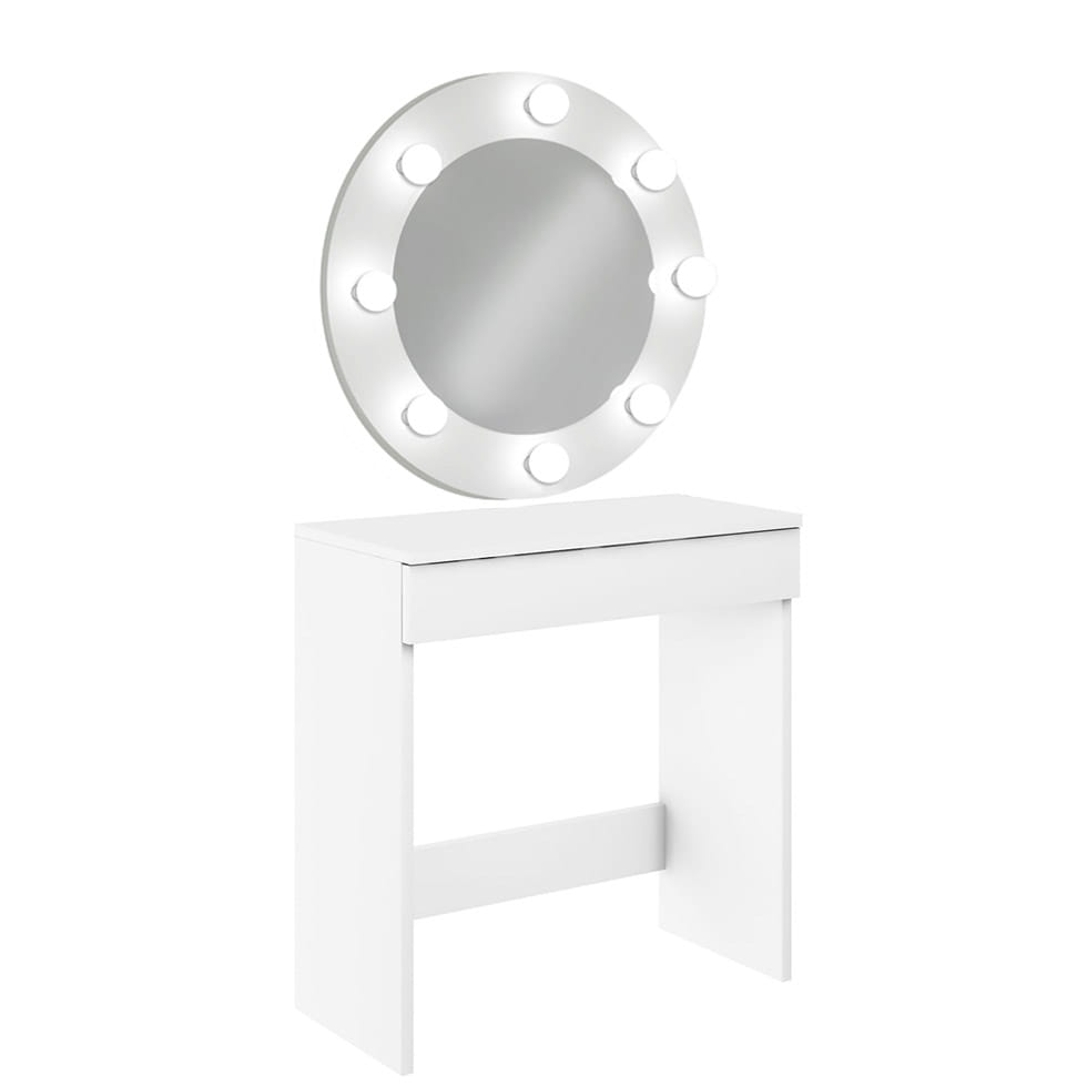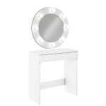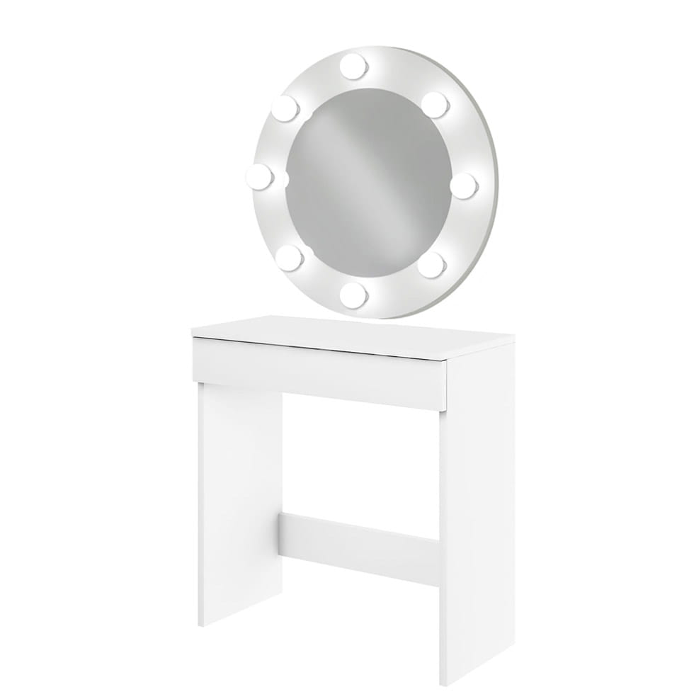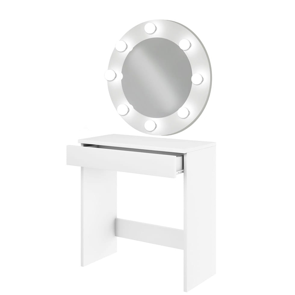 Toaletka Megan z lustrem okrągłym fi 65 cm, to idealna propozycja dla każdej kobiety! Pojemna szuflada pod blatem pomieści nie tylko kosmetyki ale również biżuterię czy perfumy. Duże, okrągłe lustro z ośmioma żarówkami led o neutralnej barwie światła sprawi, że w komfortowych warunkach zadbasz o swoją urodę.