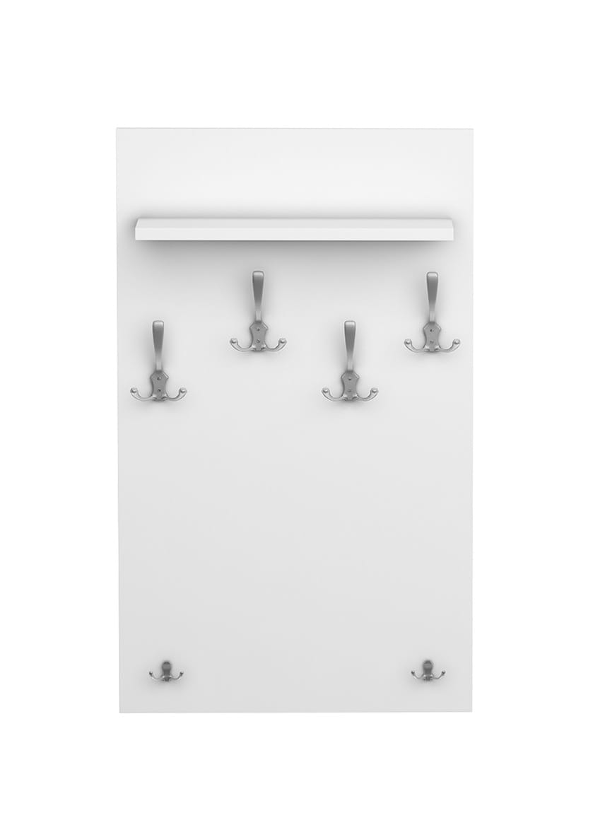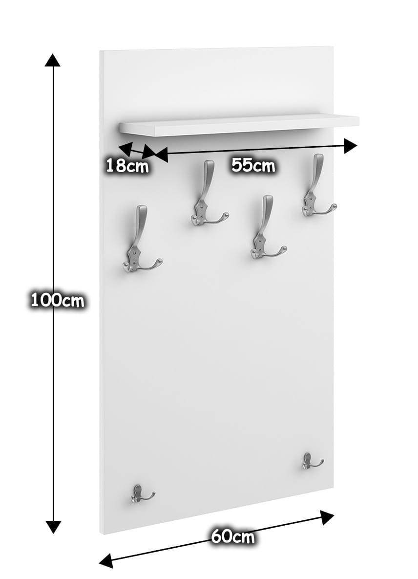 Szukasz prostego w swojej formie lecz eleganckiego wieszaka? Nasz wieszak na ubrania spełni Twoje oczekiwania. Duży panel zabezpieczy ścianę przed zabrudzeniem. Sześć wieszaków i praktyczna półka pozwolą Ci zapanować nad ładem i porządkiem.