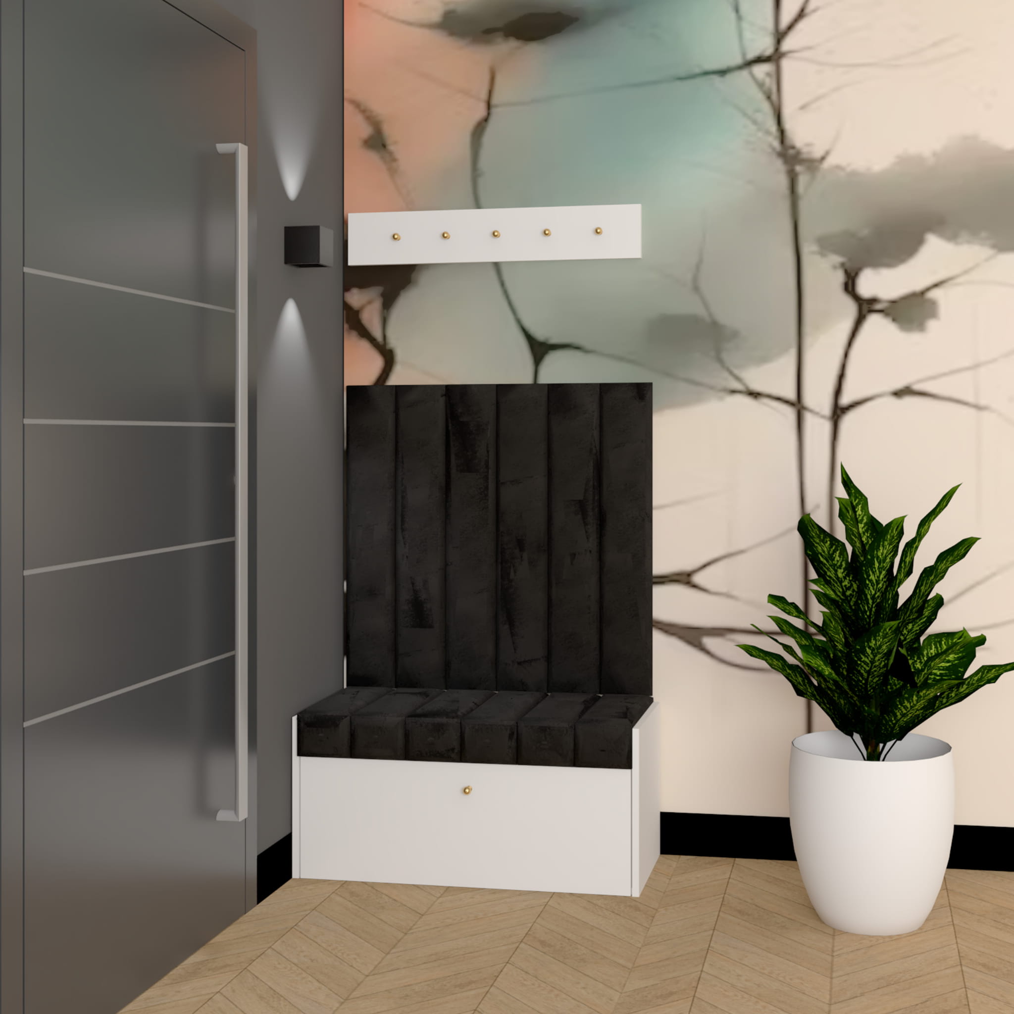 Sześć paneli ściennych wykonanych z tej samej tkaniny co siedziska pięknie wypełnią przestrzeń na ścianie i sprawią, że ubieranie butów będzie jeszcze wygodniejsze. Panele zalecamy przykleić na klej szybkiego montażu lub rzepy mocujące (brak w zestawie, należy zakupić we własnym zakresie).