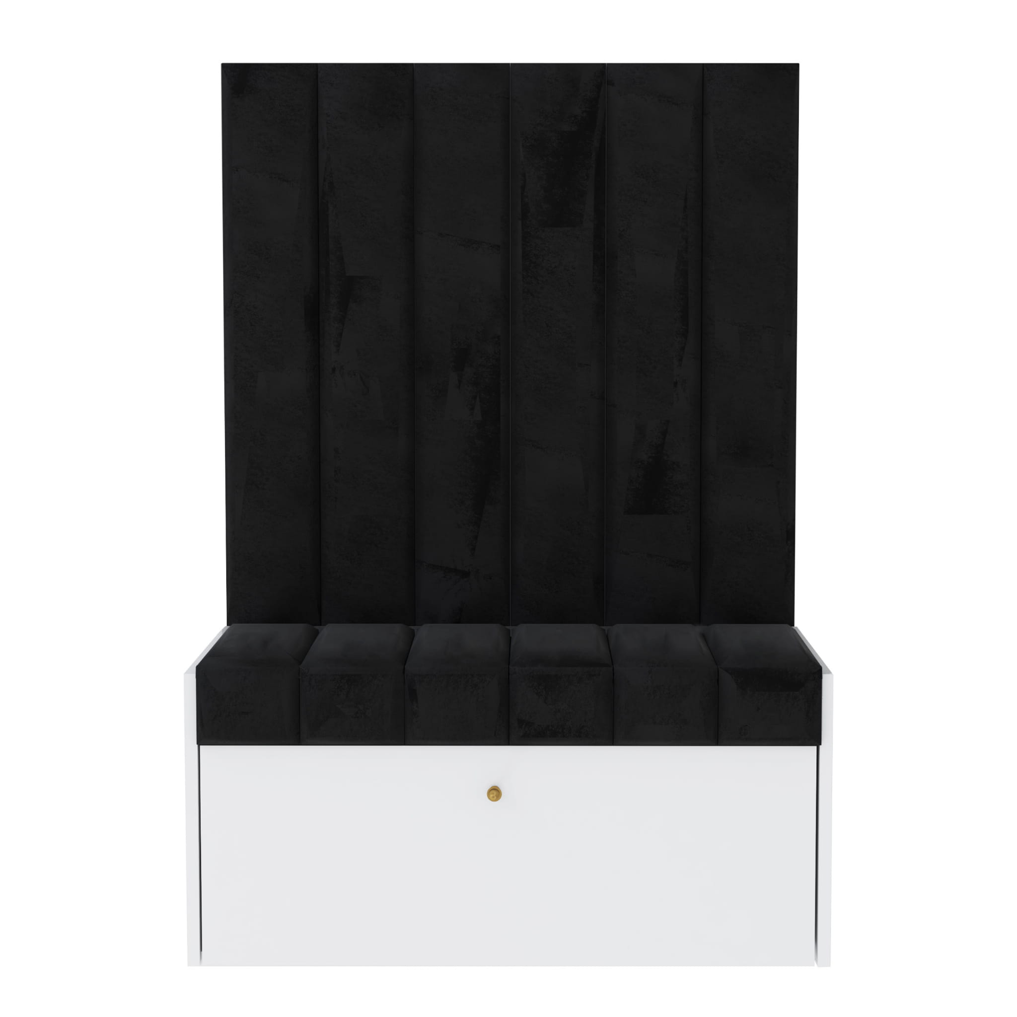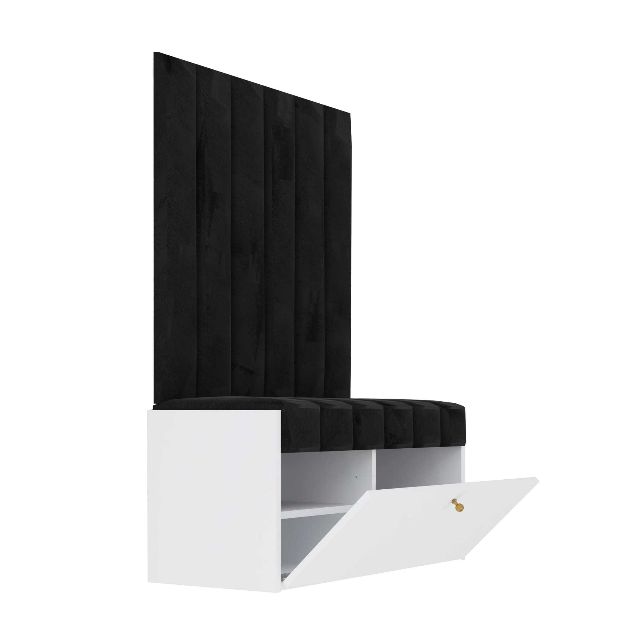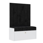 Zestaw Diana to gotowy zestaw mebli do przedpokoju, w skład których wchodzi szafka na buty z siedziskiem Diana oraz 6 wąskich paneli ściennych. Szafka na buty Diana do przedpokoju z oryginalnym siedziskiem to obowiązkowy mebel w każdym domu. Wykonana jest z płyty laminowanej 18mm w kolorze biały mat. Wygodne siedzisko o zachwycającym kształcie wykonane jest z tkaniny typu Magic Velvet w kolorze czarnym. Szafka ma jeden duży otwierany front a w środku półki. Pomieści wiele par obuwia całej rodziny.