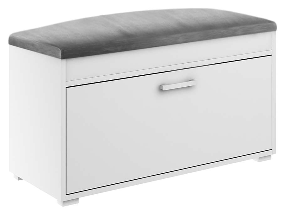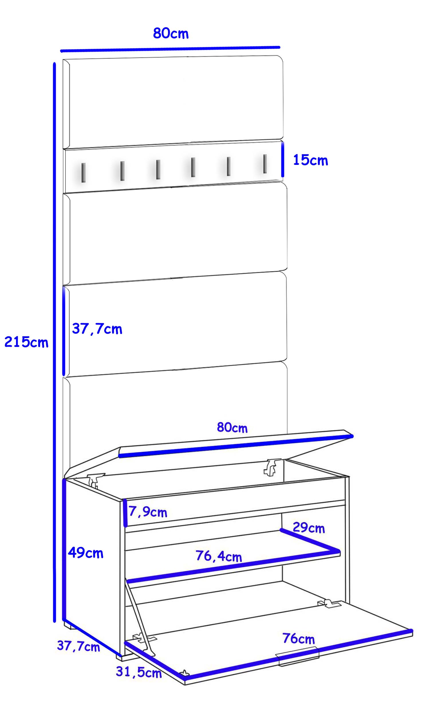 Zestaw mebli do przedpokoju F1WP4 to połączenie nowoczesnego wzornictwa z wygodą i komfortem użytkowania. W skład zestawu wchodzi pojemna szafka na buty z siedziskiem Fala 1W o szerokości 80 cm (wygodne otwieranie szafki zapewnia siłownik gazowy), wieszak ścienny z sześcioma haczykami oraz cztery tapicerowane panele ścienne. Zarówno panele , jak i siedzisko wykonane są w przyjemnej w dotyku, wysokiej jakości tkaniny welurowej. Dodatkową zaletą szafki jest ukryty pod siedziskiem schowek, w którym pomieścisz wszystkie przedmioty, które warto mieć "pod ręką" przy wyjściu z domu np. klucze, parasol, smycz dla czworonoga.