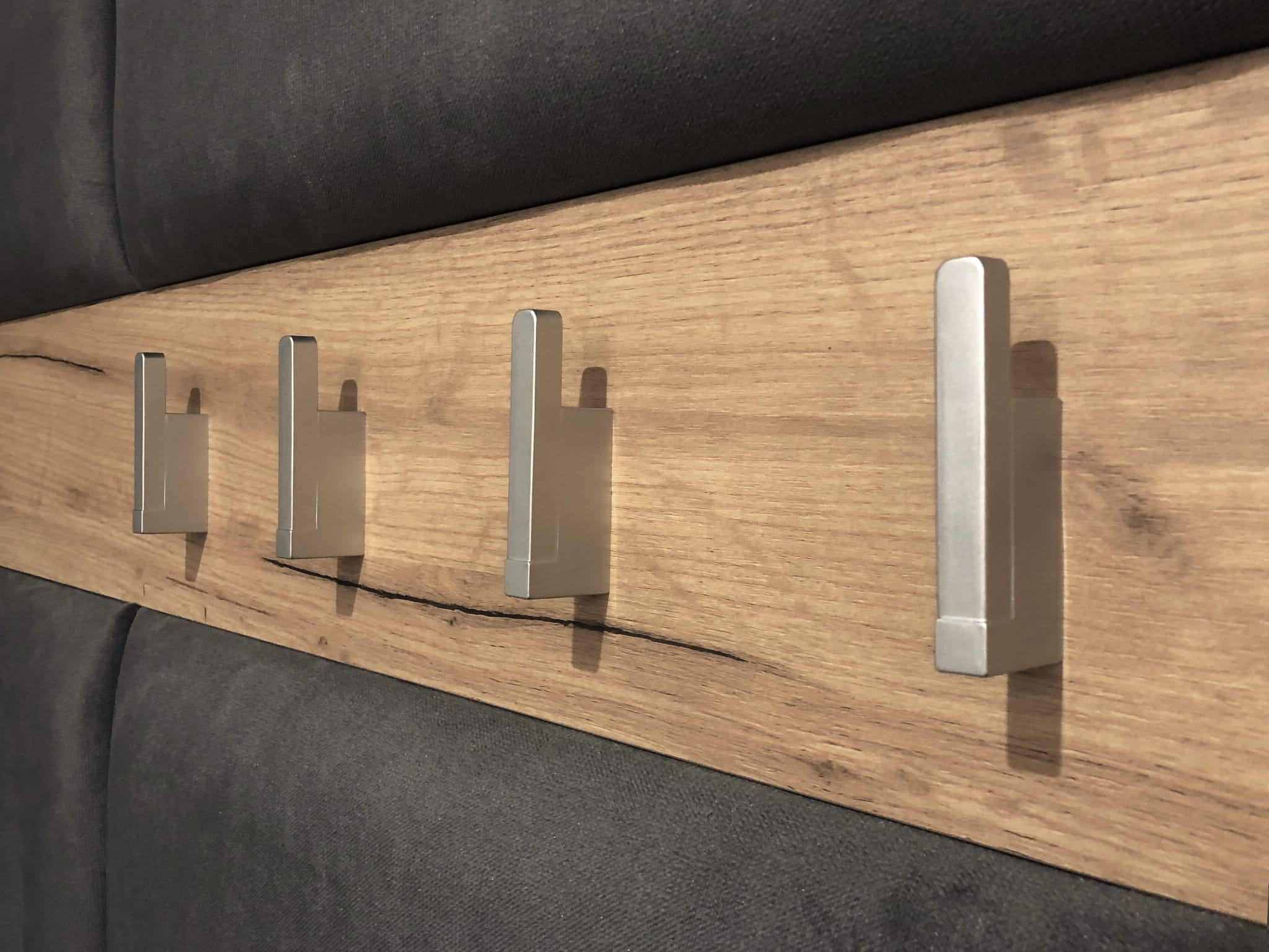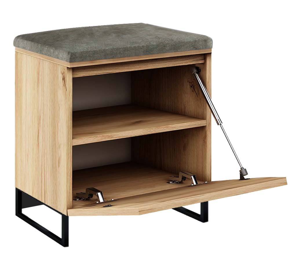 Zestaw mebli do przedpokoju Megan 1PP8 to połączenie nowoczesnego wzornictwa z wygodą i komfortem użytkowania. W skład zestawu wchodzi pojemna szafka na buty z siedziskiem o szerokości 50 cm , wieszak ścienny, osiem paneli tapicerowanych oraz listwa ozdobna. Siedzisko wykonane jest z wysokiej jakości welurowej tkaniny tapicerskiej, a wygodne otwieranie szafki zapewniają siłowniki gazowe. Szafka posiada metalowe nogi o wysokości 12 cm (malowane proszkowo w kolorze czarnym), wzmocnione w tylnej części czarną płytą meblową. Do szafki można dopasować panele ścienne, wieszaki i komody, tworząc własną aranżację przedpokoju.