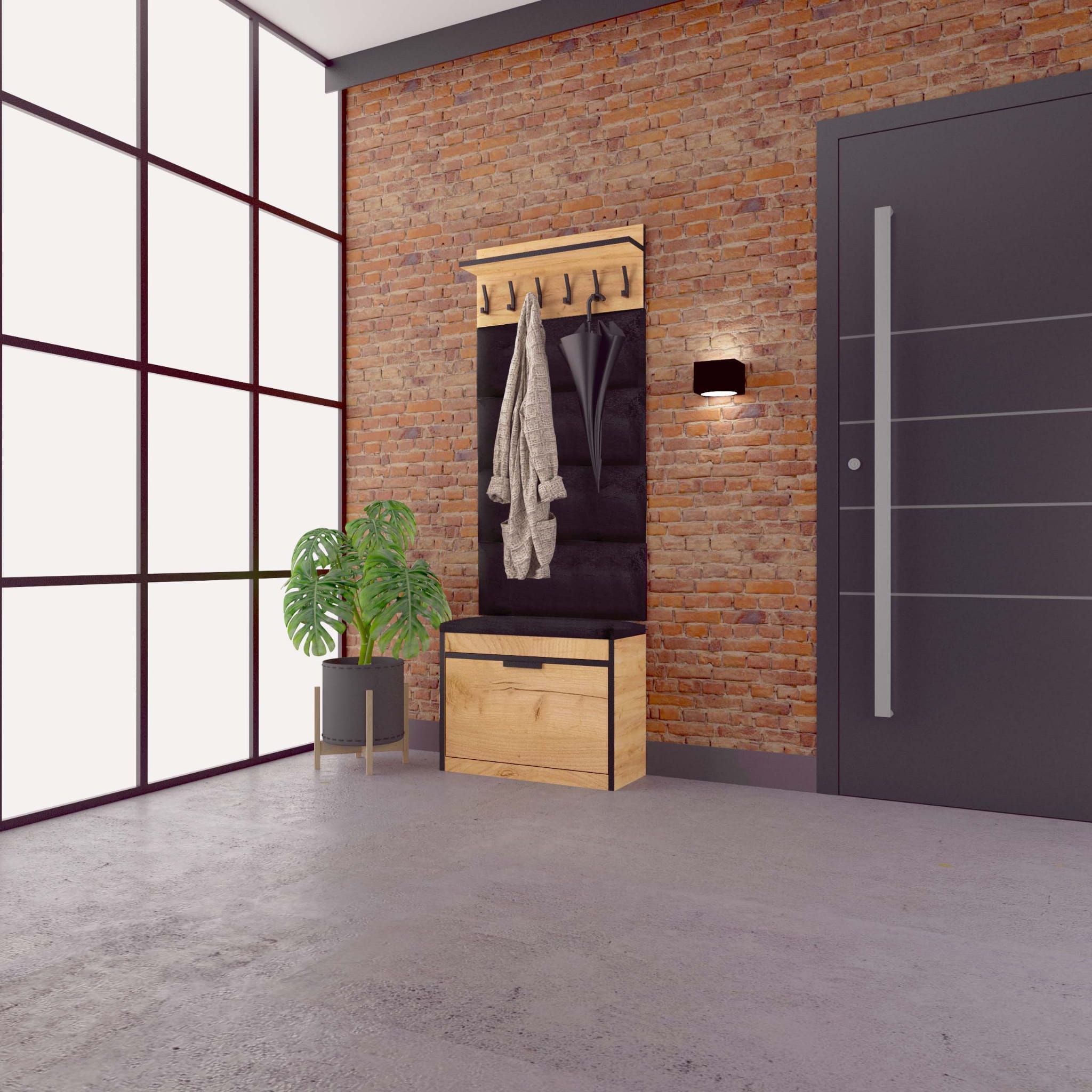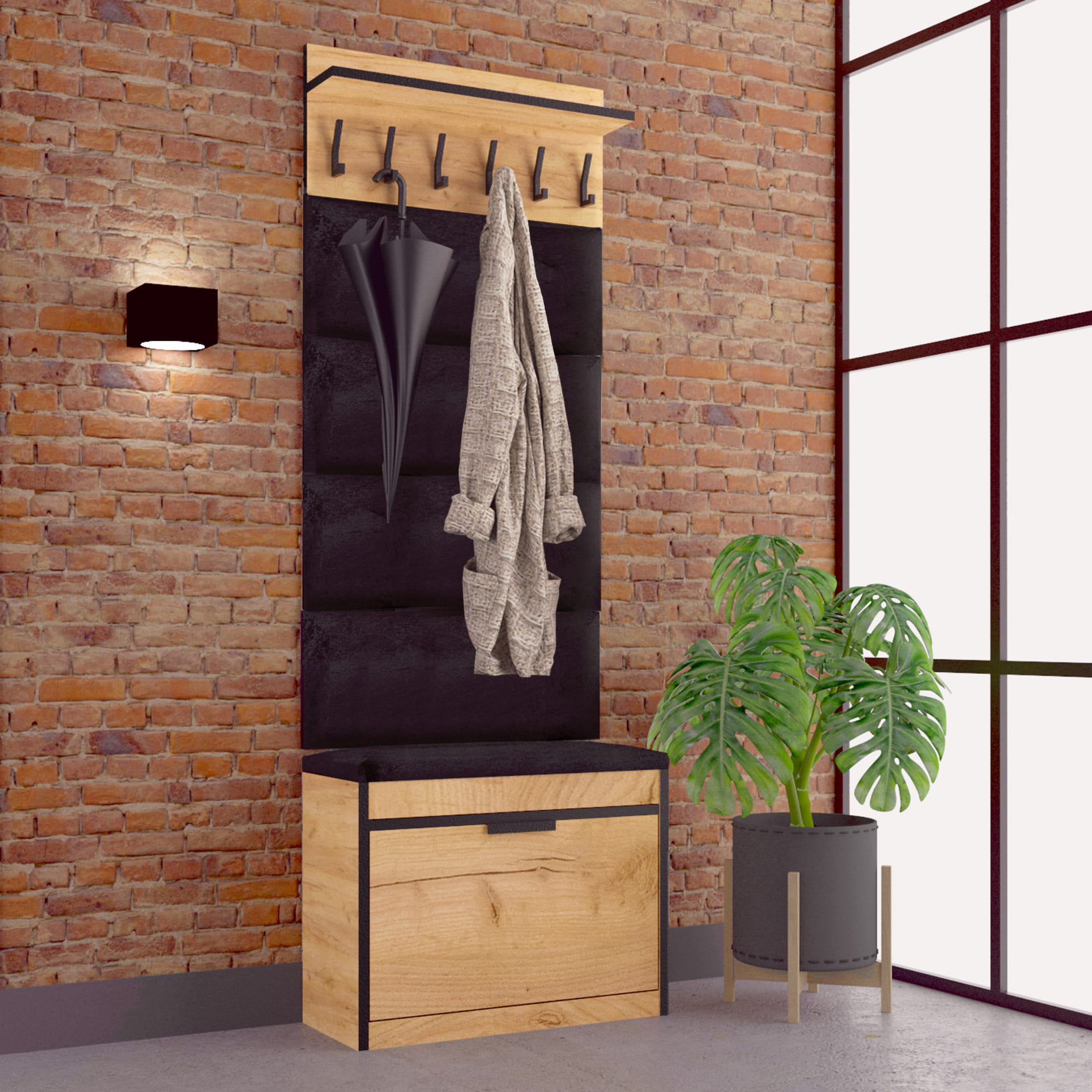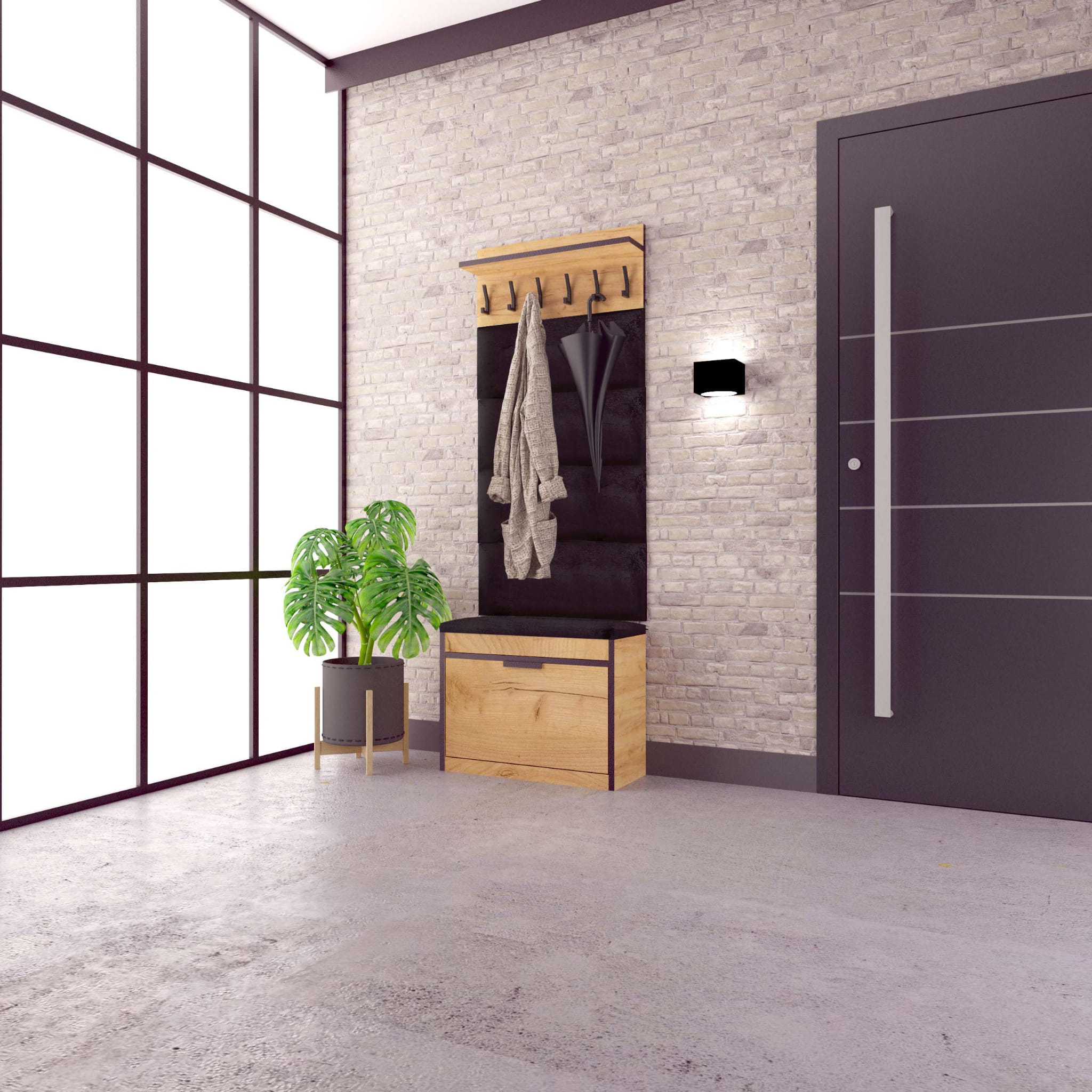 Zestaw mebli do przedpokoju Alaska WA11C4P składa się z : szafki na buty z siedziskiem Alaska 11C i wieszaka na ubrania Alaska oraz czterech paneli tapicerowanych. Gotowa aranżacja pozwoli Ci urządzić przedpokój w jednolitym stylu. Szafka pod siedziskiem posiada praktyczny schowek. Panele na ścianę oraz siedzisko wykonane są z eleganckiej i wytrzymałej tkaniny welurowej . Czarna okleina obrzeży nadaje meblom loftowy, nowoczesny wygląd.